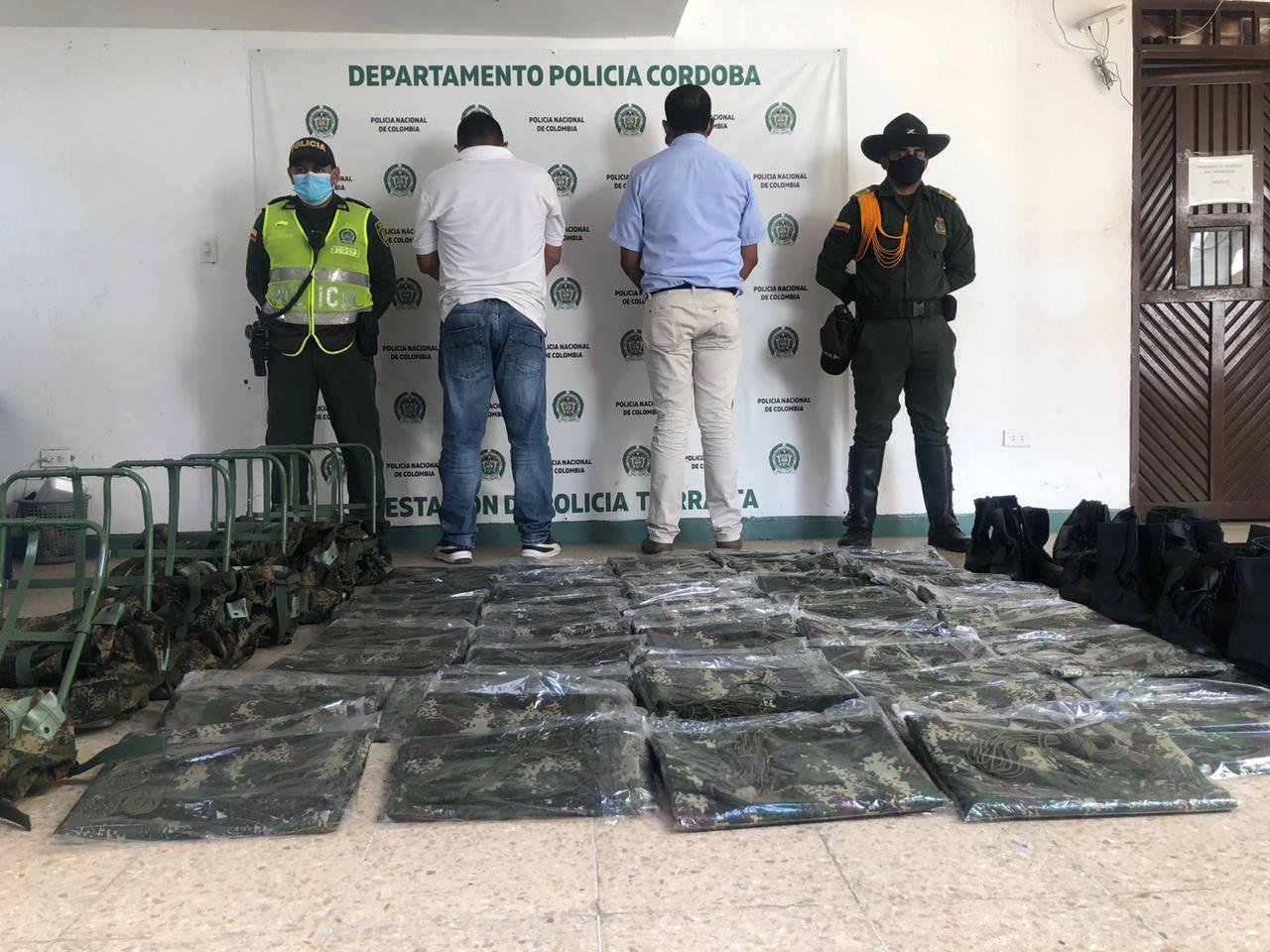 En el procedimiento policial, que se llevó a cabo en el corregimiento Los Morales de Tierralta, fueron capturados dos hombres de 51 y 38 años de edad por el delito de utilización ilegal de uniformes e insignias; los sujetos se movilizaban en un vehículo de transporte de servicio público donde se les halló 20 pares de botas de combate, 54 sintelas camufladas y morrales de campaña.