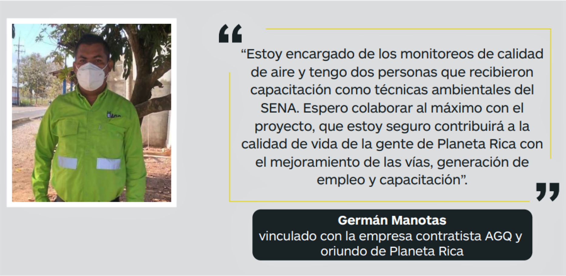 “Estoy encargado de los monitoreos de calidad de aire y tengo dos personas que recibieron capacitación como técnicas ambientales del SENA. Espero colaborar al máximo con el proyecto, que estoy seguro contribuirá a la calidad de vida de la gente de Planeta Rica con el mejoramiento de las vías, generación de empleo y capacitación”. Afirma Germán Manotas, vinculado con la empresa contratista AGQ y oriundo de Planeta Rica