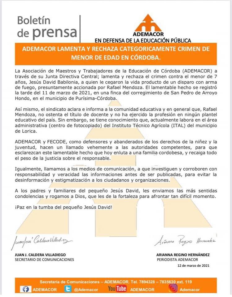 Por su parte FECODE ha emitido comunicado donde lamenta el hecho contra el niño y asegura además que, “Rafel Mendoza, no ostenta el título de docente y no ha ejercido la profesión en ningún plante educativo del país. Sin embargo, se tiene conocimiento que actualmente labora en el área administrativa del Instituto Técnico Agrícola, (ITAL)”.