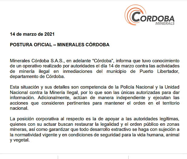 La empresa Minerales de Córdoba emitió comunicado informando que, “tuvo conocimiento de un operativo realizado por autoridades el día 14 de marzo contra las actividades de minería ilegal en inmediaciones del municipio de Puerto Libertador, departamento de Córdoba”.
