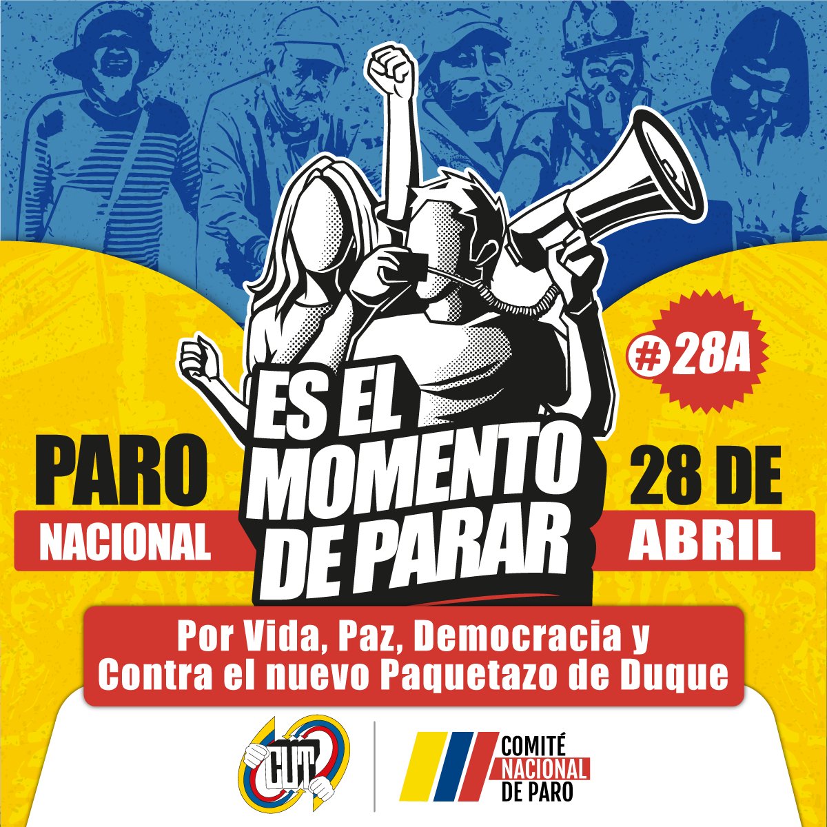 Así lo dio a conocer el comité Nacional de Paro, tras la publicación del afiche oficial de la convocatoria para el Paro del próximo #28A al #ParoNacional “¡#EsElMomentoDeParar! Por vida, paz, democracia y contra el nuevo paquetazo de Duque. Paro Nacional, 28 de abril de 2021”, dice la publicación.