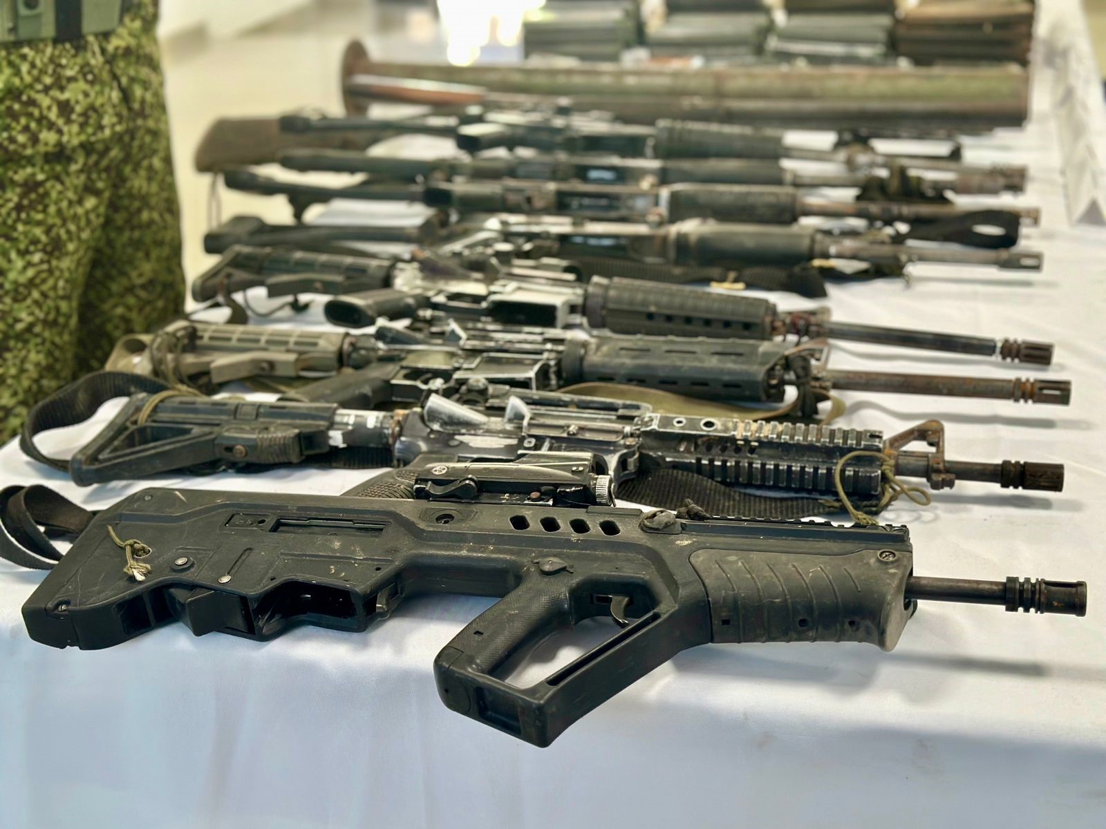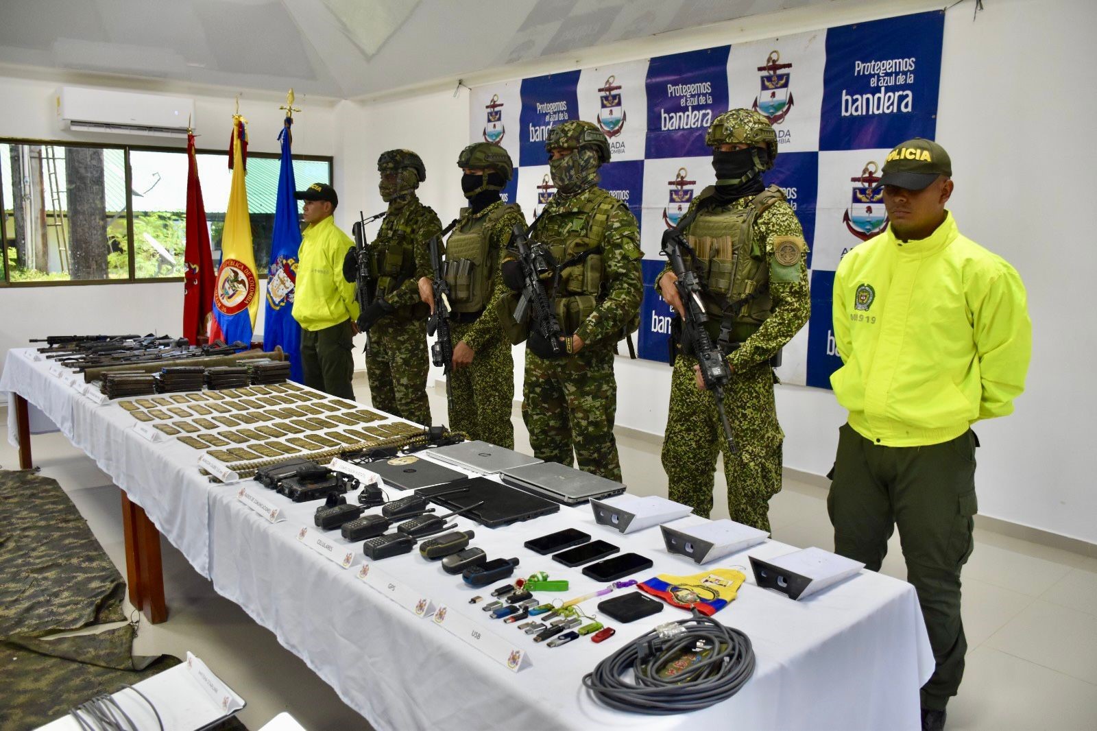 Las tropas también incautaron un significativo arsenal que incluía un talonario con registros de extorsiones a la población civil, víveres, diez armas largas, cinco armas cortas, municiones de diversos calibres, proveedores, dos botes, equipos de campaña y chalecos multipropósitos. También se recuperaron equipos de comunicación y computadores con información de alto valor que será analizada por las autoridades competentes.