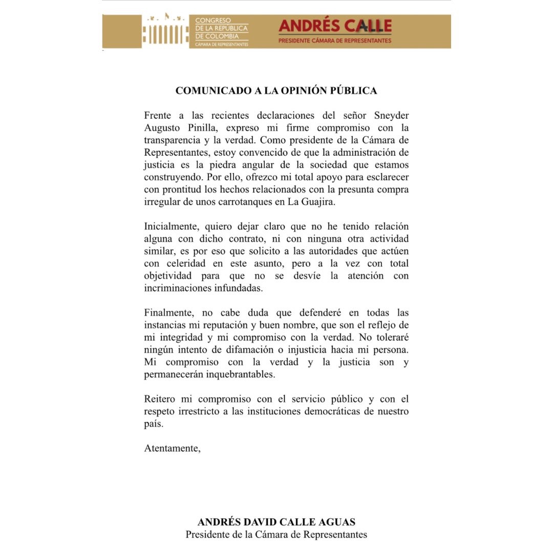 Nacional. Por medio de un comunicado, el presidente de la Cámara de Representantes, congresista Andrés Calle Aguas, ha manifestado que está presto para apoyar el esclarecimiento de las acusaciones de Sneyder Pinilla, ex subdirector de la UNGRD, sobre el escándalo por la compra de los carrotanques para La Guajira y que presuntamente salpican al Congresista.