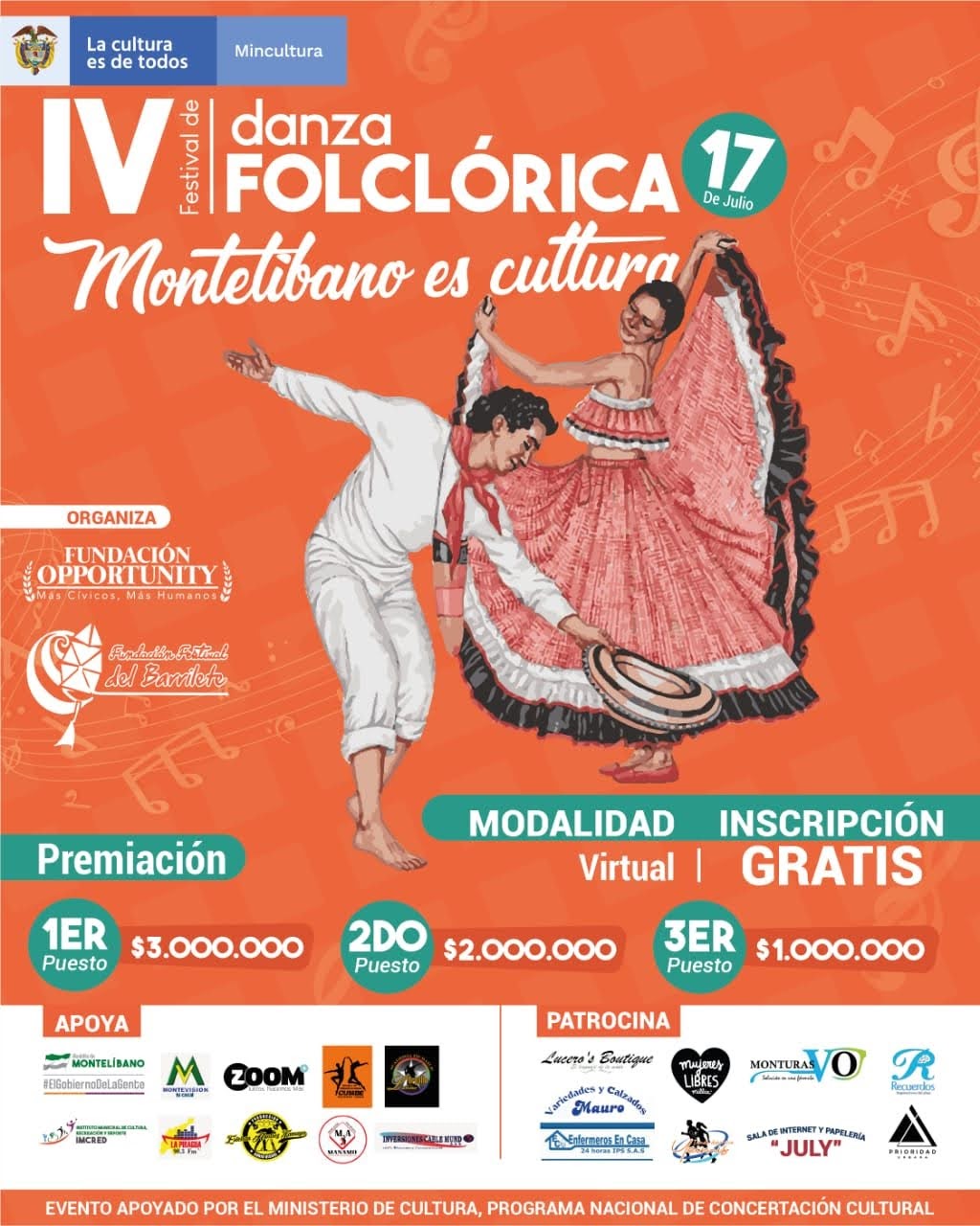 Montelíbano. Montelíbano sigue cosechando éxitos, pues su gente posee grandes talentos y siempre deja en alto su nombre, en esta ocasión es grato hablar de 'Colectivo Montelíbano', integrado por un grupo de bailarines y artistas de Montelíbano, quienes son finalistas del IV Festival de Danza Folclórica, organizado por la Fundación Opportunity y Fundación Festival del Barrilete, con el poyado del Ministerio de Cultura.