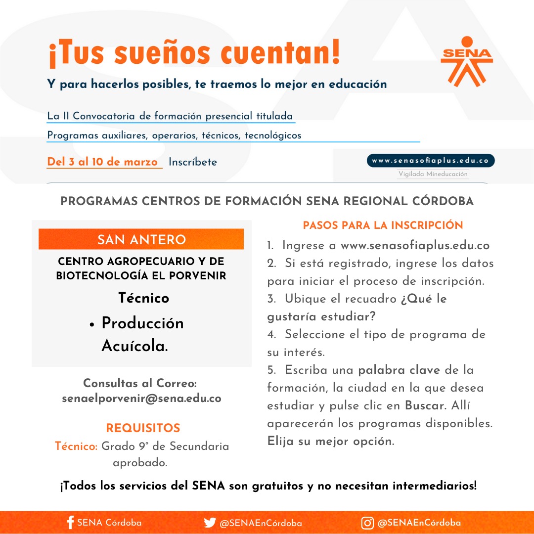 Córdoba. El SENA abre la II Convocatoria de formación presencial titulada y a distancia 2022 para seguir aportando a la reactivación económica. Se abren las inscripciones para aquellas personas que quieran formarse en niveles educativos como técnico, tecnólogo, operario y auxiliar, de manera presencial