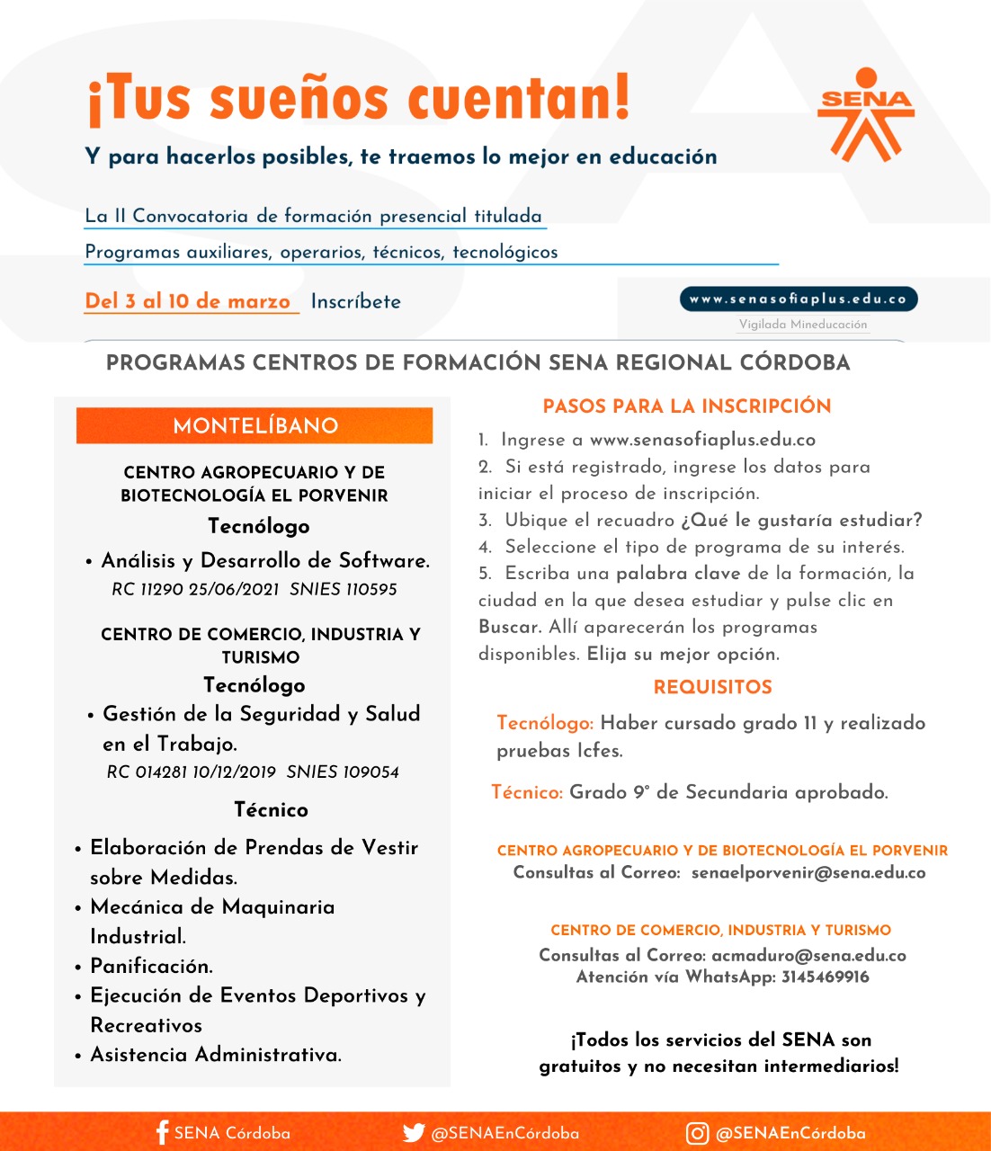Si tienes alguna duda no dudes en utilizar la línea gratuita en Bogotá llamando al (601) 3430111 y fuera de Bogotá llamando al 018000-910-270. Para consultas del Centro Agropecuario y de Biotecnología El Porvenir puede escribir al Correo: senaelporvenir@sena.edu.co Y para el Centro de Comercio, Industria y Turismo consultas al correo: acmaduro@sena.edu.co y atención vía WhatsApp: 3145469916