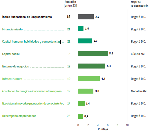 En particular, la ciudad se destaca por registrar un excelente puntaje en el indicador acceso a otros empresarios con experiencia y cobertura de la energía eléctrica. Así mismo, registra puntajes destacados en existencia de espacios institucionales para el desarrollo de redes entre emprendedores y contactos efectivos con actores del ecosistema; indicadores en los que se posiciona entre las primeras cinco ciudades del escalafón.