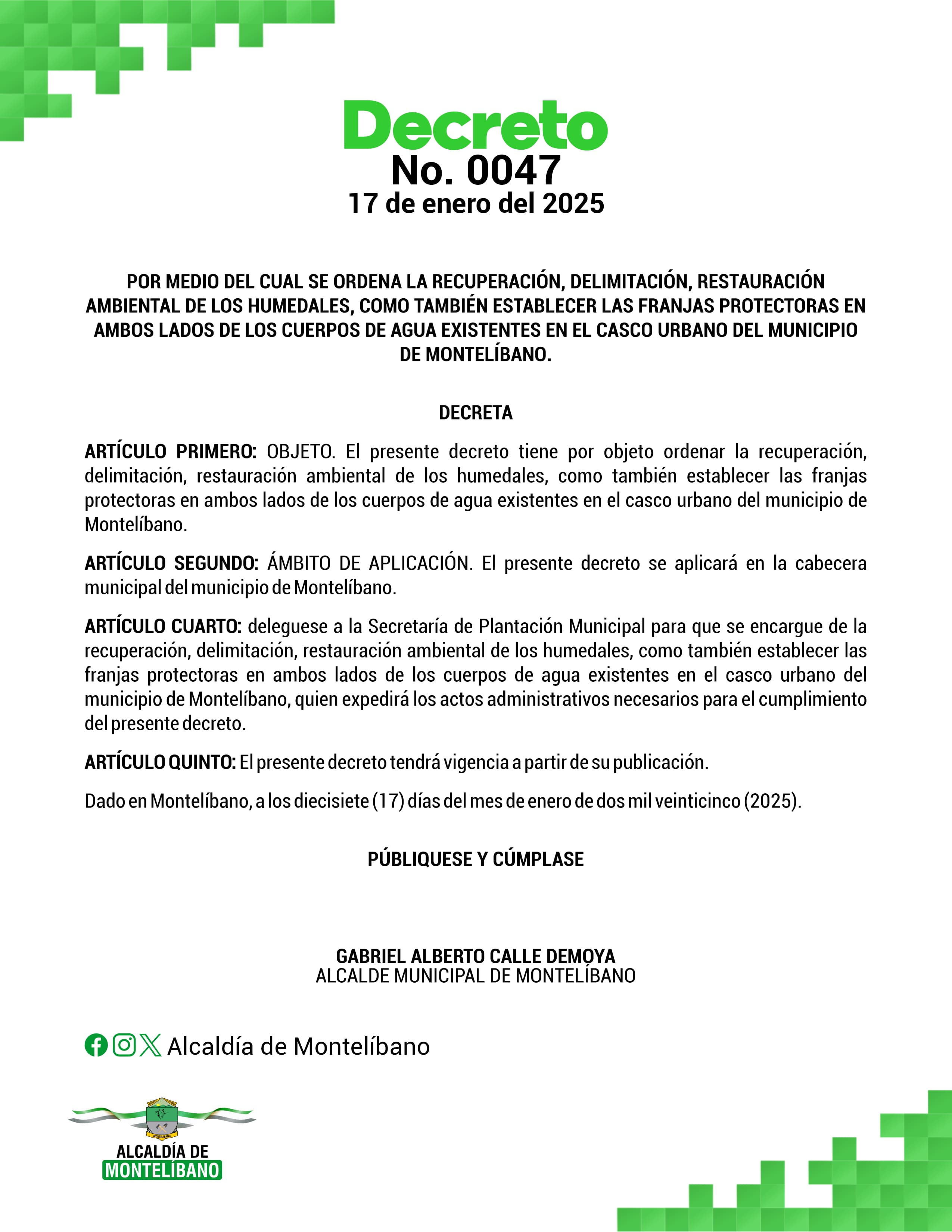 Montelíbano. La Alcaldía de Montelíbano emite el comunicado 0047 del 17 de enero del 2025, por medio del cual se ordena, la Recuperación, Delimitación y Restauración ambiental de humedales y además establecer franjas protectoras en ambos lados de los cuerpos de agua existentes en el casco urbano.