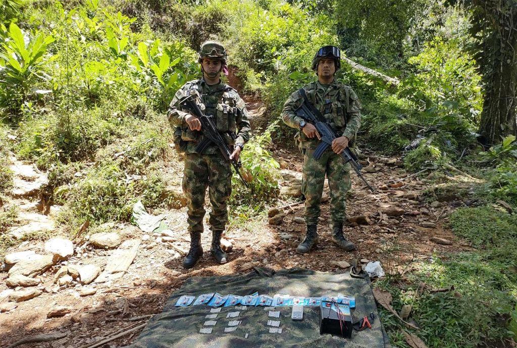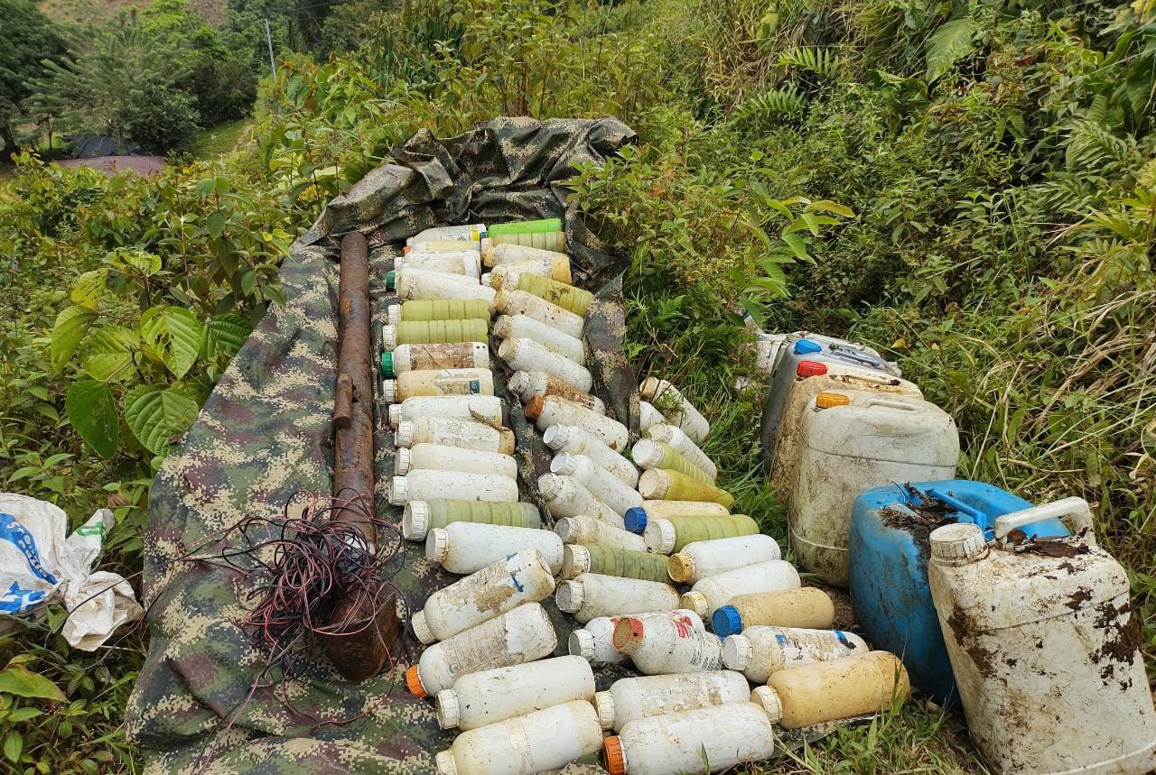 Antioquia. Autoridades confirmanq que, en desarrollo de operaciones militares de control territorial, soldados del Ejército Nacional, en respuesta a las recomendaciones de la alerta temprana No. 045 del 2020, emitida por la Defensoría del Pueblo, llegaron hasta el área general de la vereda Tesorito, en Tarazá, donde fueron hallados insumos para la fabricación de explosivos en el interior de dos canecas de plástico.