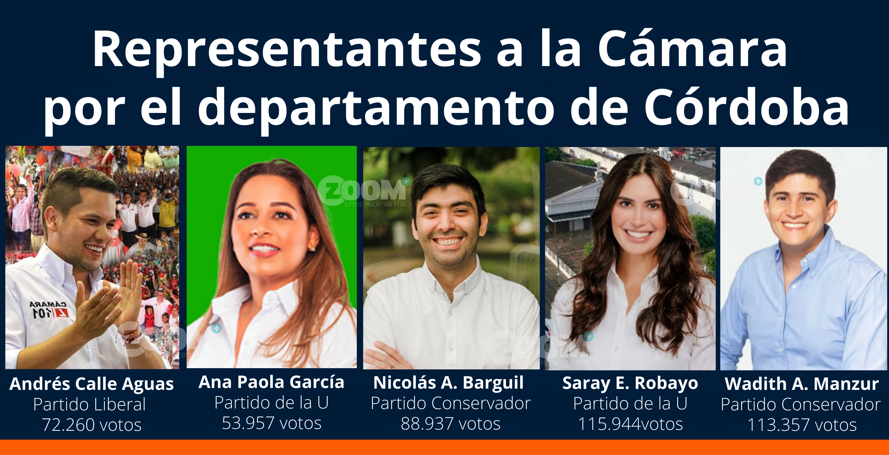 Córdoba. En el departamento de Córdoba, estos son los cinco candidatos que obtuvieron curules en la Cámara de Representantes para el periodo 2022-2026. El Partido Conservador obtuvo dos curules con los candidatos, Wadith Alberto Manzur Imbett, quien obtuvo, 113.357 votos y Nicolás Antonio Barguil Cubillos, con 88.937, votos.