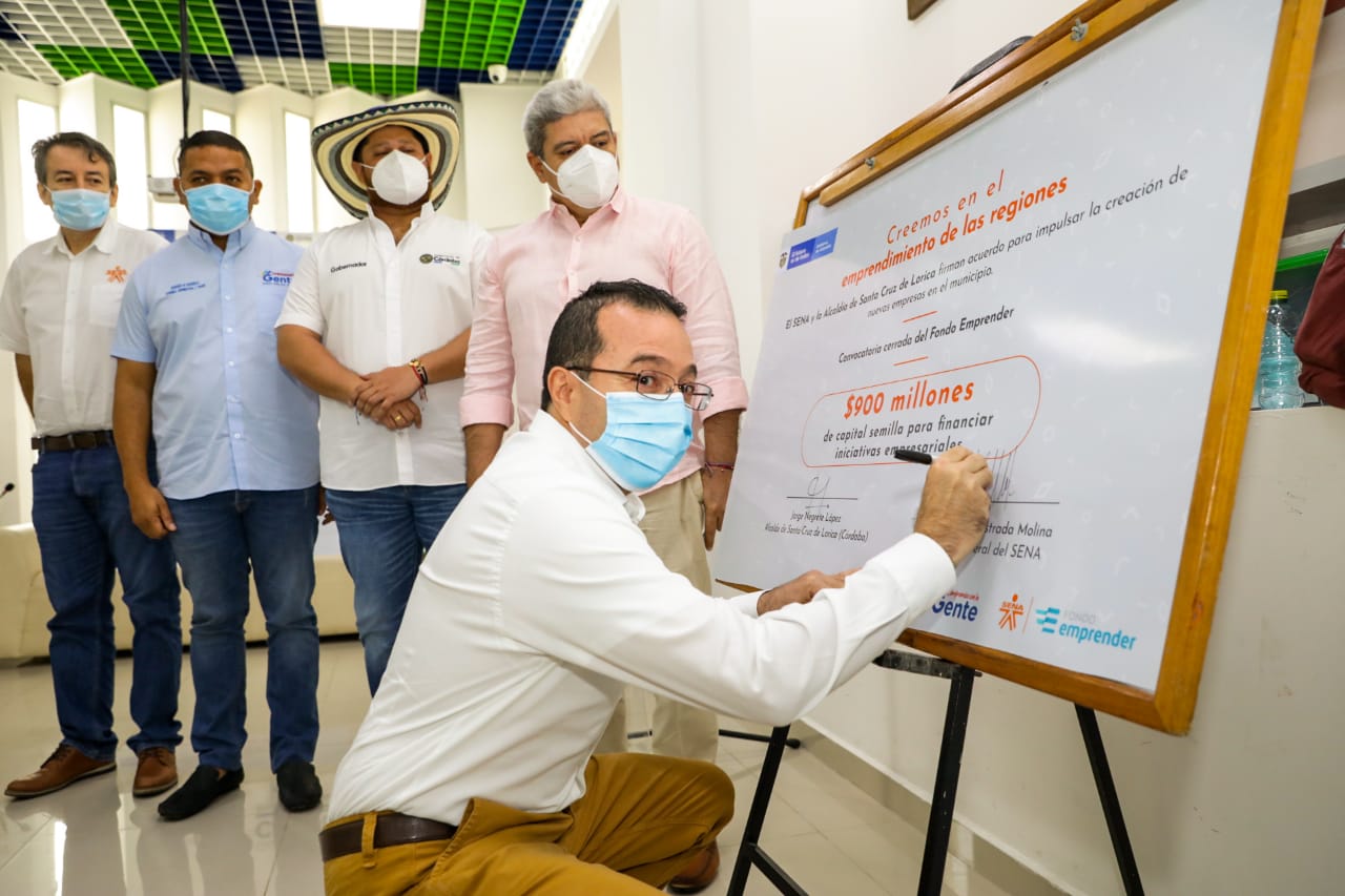 Córdoba. El director general del SENA, Carlos Mario Estrada Molina; y el alcalde del municipio Santa Cruz de Lorica, Jorge Negrete López; lanzaron este jueves una nueva convocatoria para los emprendedores del municipio, quienes podrán materializar y hacer realidad sus sueños, ideas y proyectos, gracias a los recursos de capital semilla por $900 millones que se dispondrán a través del Fondo Emprender de la Entidad.