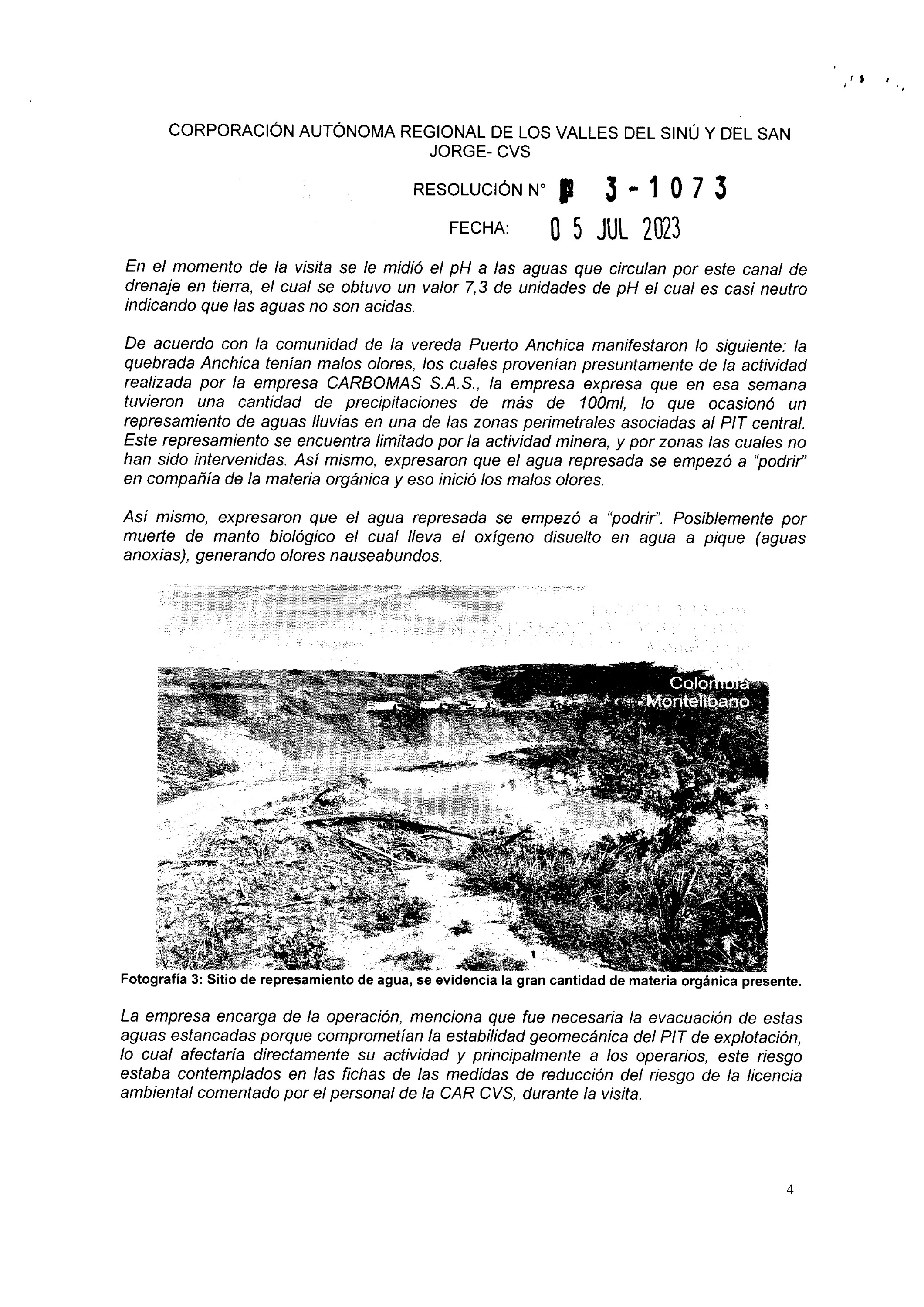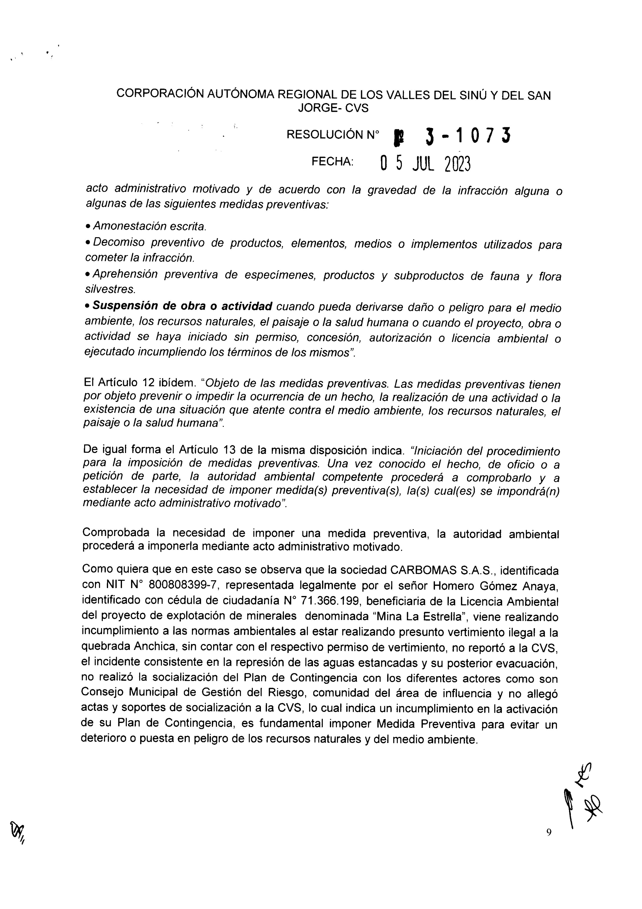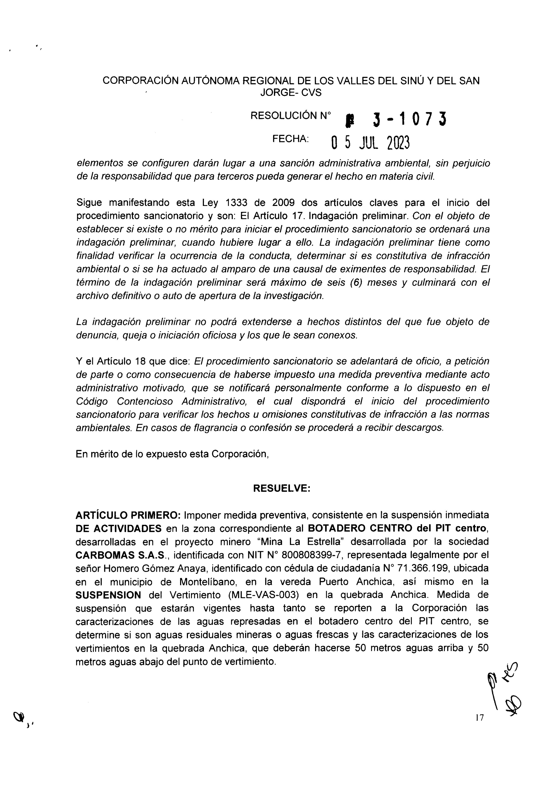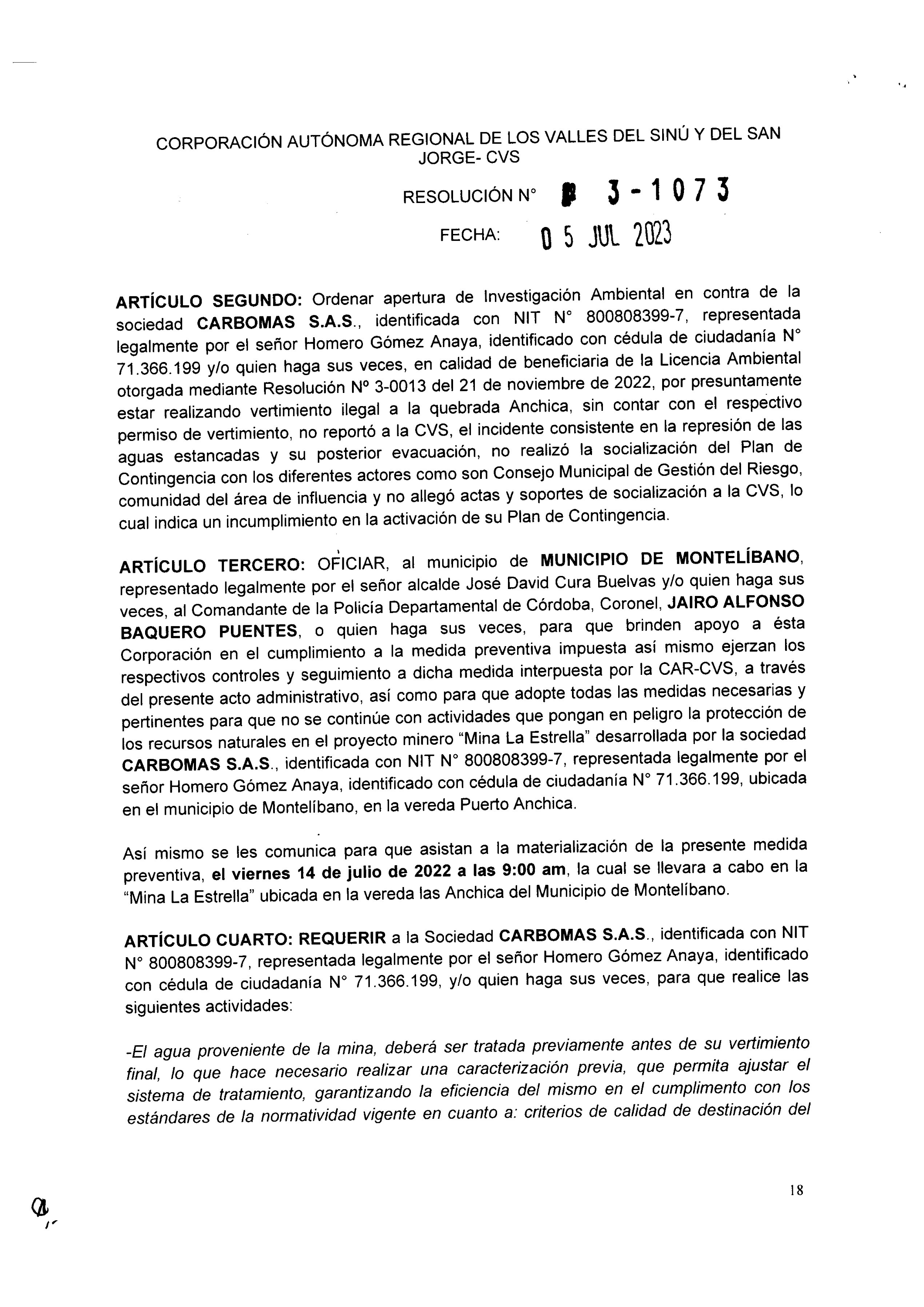 "La CVS ha resulto: Imponer medida preventiva, consistente en la suspensión inmediata DE ACTIVIDADES en la zona correspondiente al BOTADERO CENTRO del PIT centro, desarrolladas en el proyecto minero "Mina La Estrella" desarrollada por la sociedad CARBOMAS S.A.S (…) ubicada en el municipio de Montelíbano, en la vereda Puerto Anchica, así mismo en la SUSPENSION del Vertimiento (MLE-VAS-003) en la quebrada Anchica. Medida de suspensión que estarán vigentes hasta tanto se reporten a la Corporación las caracterizaciones de las aguas represadas en el botadero centro del PIT centro, se determine si son aguas residuales mineras o aguas frescas y las caracterizaciones de los vertimientos en la quebrada Anchica, que deberán hacerse 50 metros aguas arriba y 50 metros aguas abajo del punto de vertimiento".