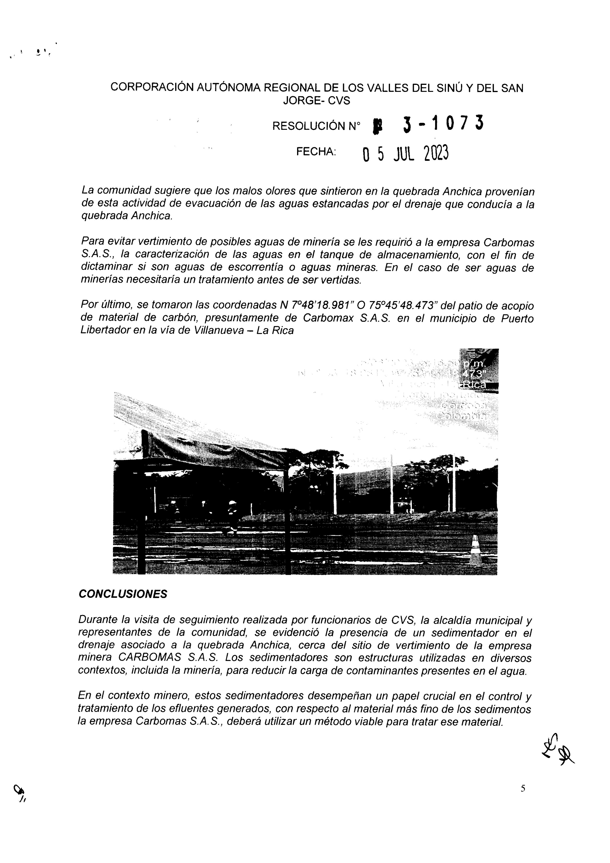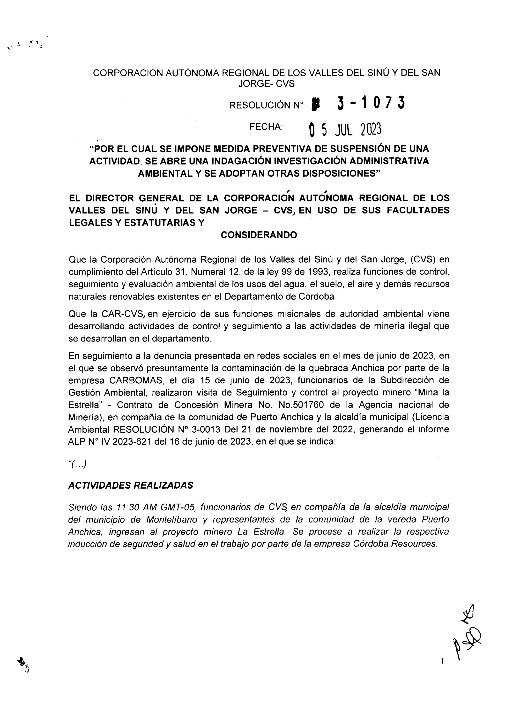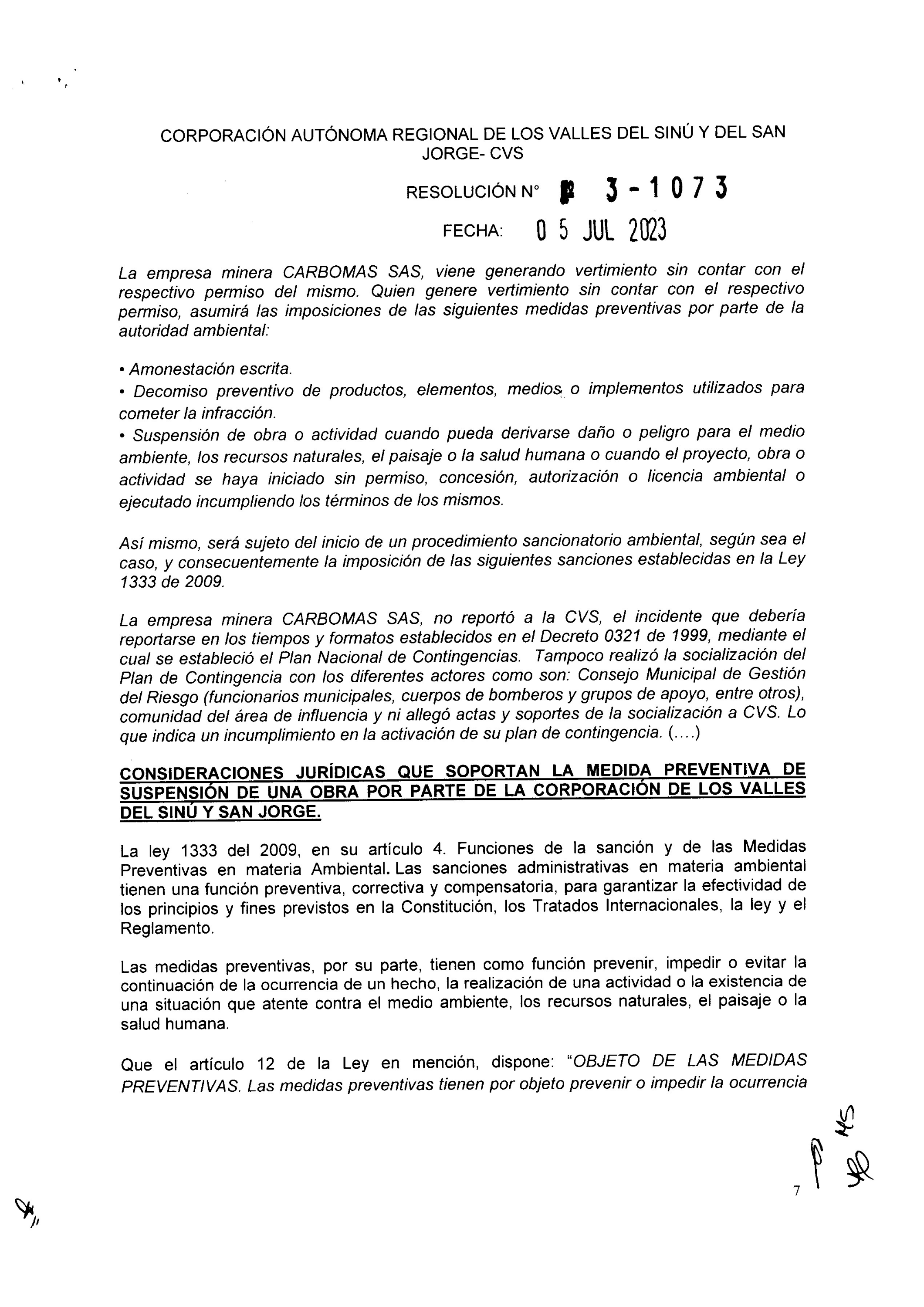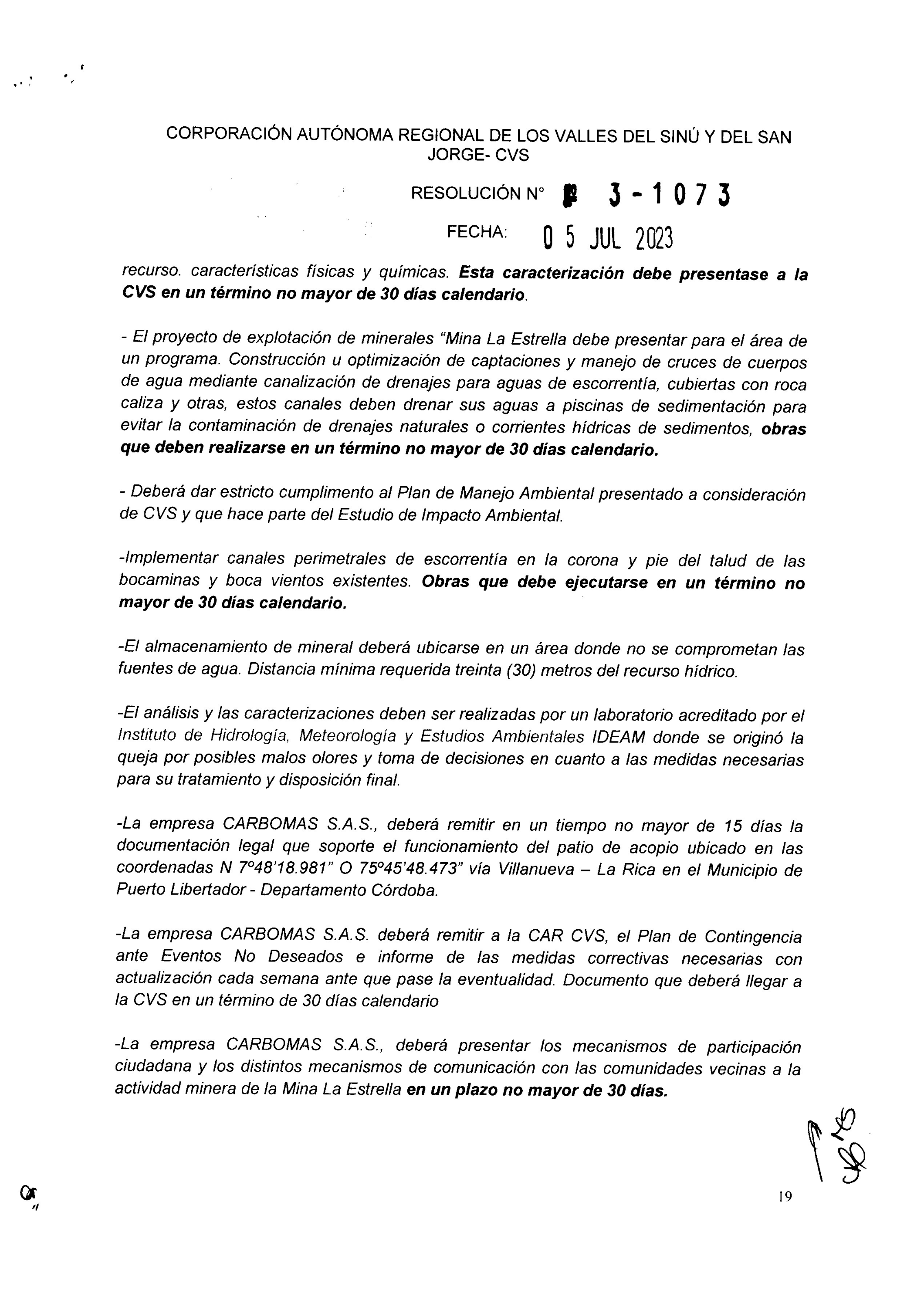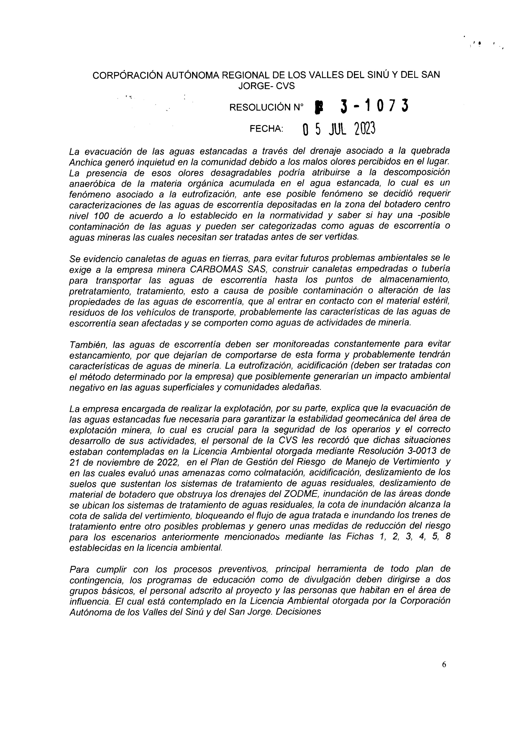 "La CVS ha resulto: Imponer medida preventiva, consistente en la suspensión inmediata DE ACTIVIDADES en la zona correspondiente al BOTADERO CENTRO del PIT centro, desarrolladas en el proyecto minero "Mina La Estrella" desarrollada por la sociedad CARBOMAS S.A.S (…) ubicada en el municipio de Montelíbano, en la vereda Puerto Anchica, así mismo en la SUSPENSION del Vertimiento (MLE-VAS-003) en la quebrada Anchica. Medida de suspensión que estarán vigentes hasta tanto se reporten a la Corporación las caracterizaciones de las aguas represadas en el botadero centro del PIT centro, se determine si son aguas residuales mineras o aguas frescas y las caracterizaciones de los vertimientos en la quebrada Anchica, que deberán hacerse 50 metros aguas arriba y 50 metros aguas abajo del punto de vertimiento".