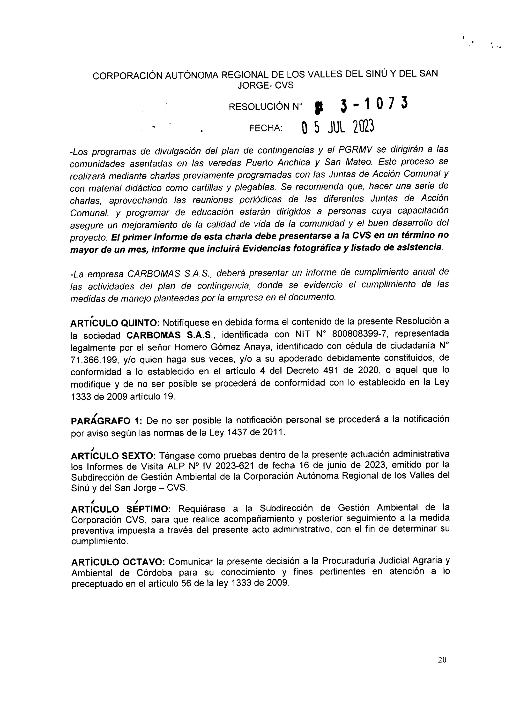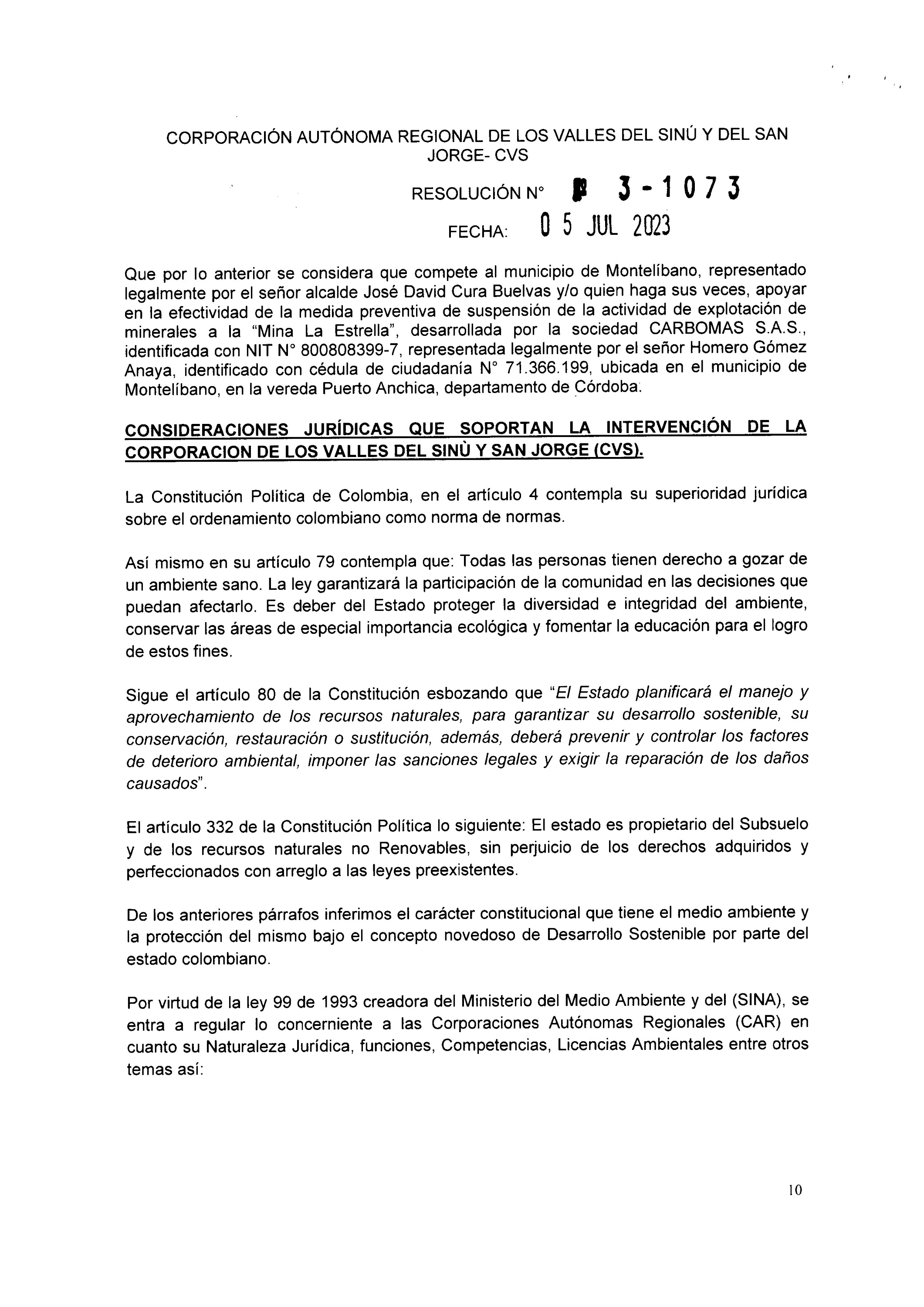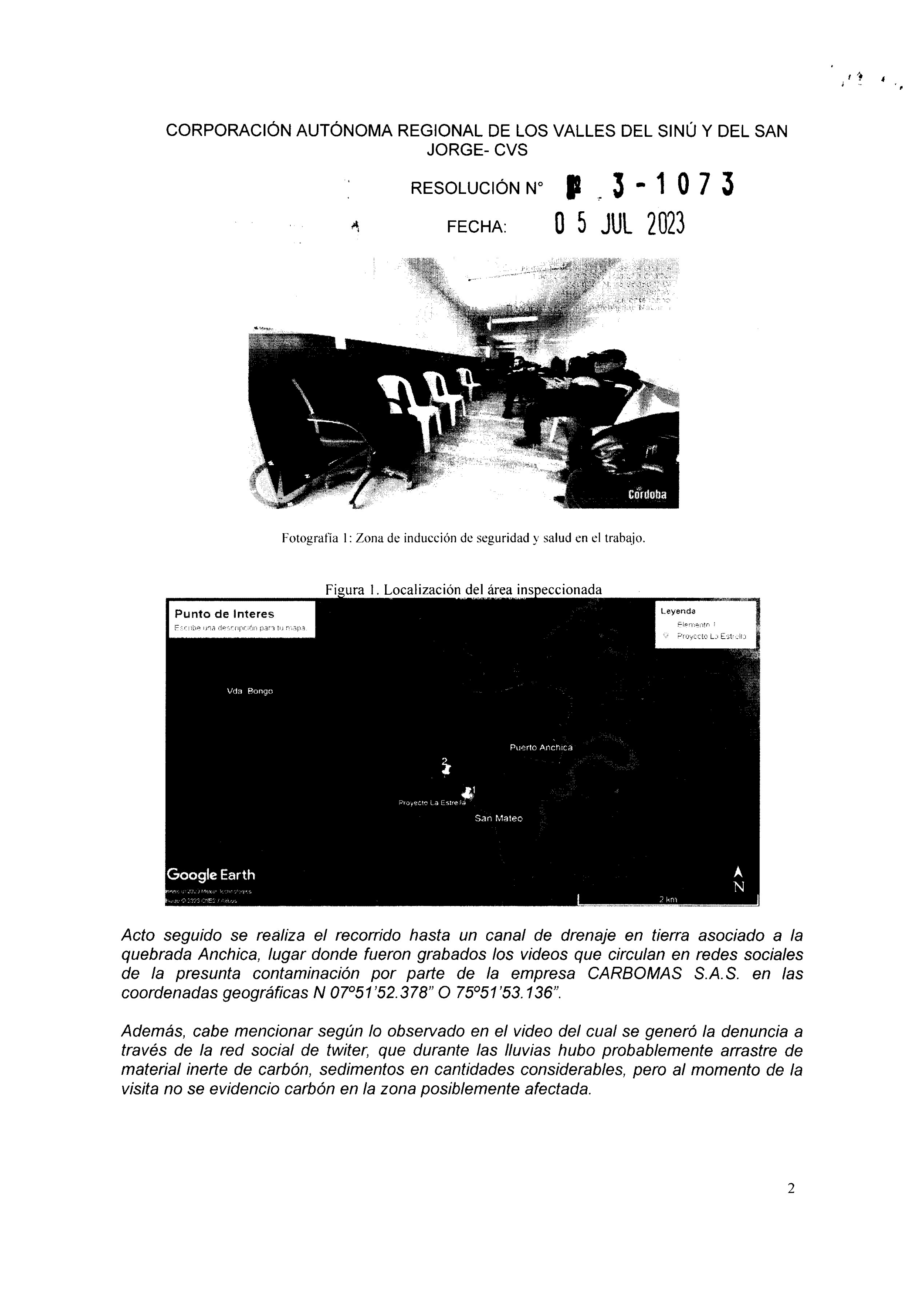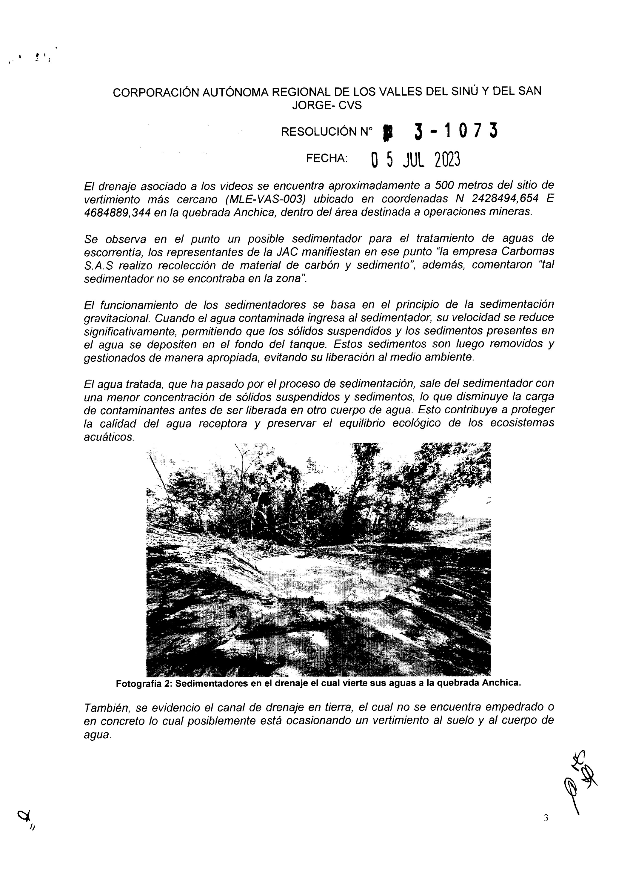 "La CVS ha resulto: Imponer medida preventiva, consistente en la suspensión inmediata DE ACTIVIDADES en la zona correspondiente al BOTADERO CENTRO del PIT centro, desarrolladas en el proyecto minero "Mina La Estrella" desarrollada por la sociedad CARBOMAS S.A.S (…) ubicada en el municipio de Montelíbano, en la vereda Puerto Anchica, así mismo en la SUSPENSION del Vertimiento (MLE-VAS-003) en la quebrada Anchica. Medida de suspensión que estarán vigentes hasta tanto se reporten a la Corporación las caracterizaciones de las aguas represadas en el botadero centro del PIT centro, se determine si son aguas residuales mineras o aguas frescas y las caracterizaciones de los vertimientos en la quebrada Anchica, que deberán hacerse 50 metros aguas arriba y 50 metros aguas abajo del punto de vertimiento".