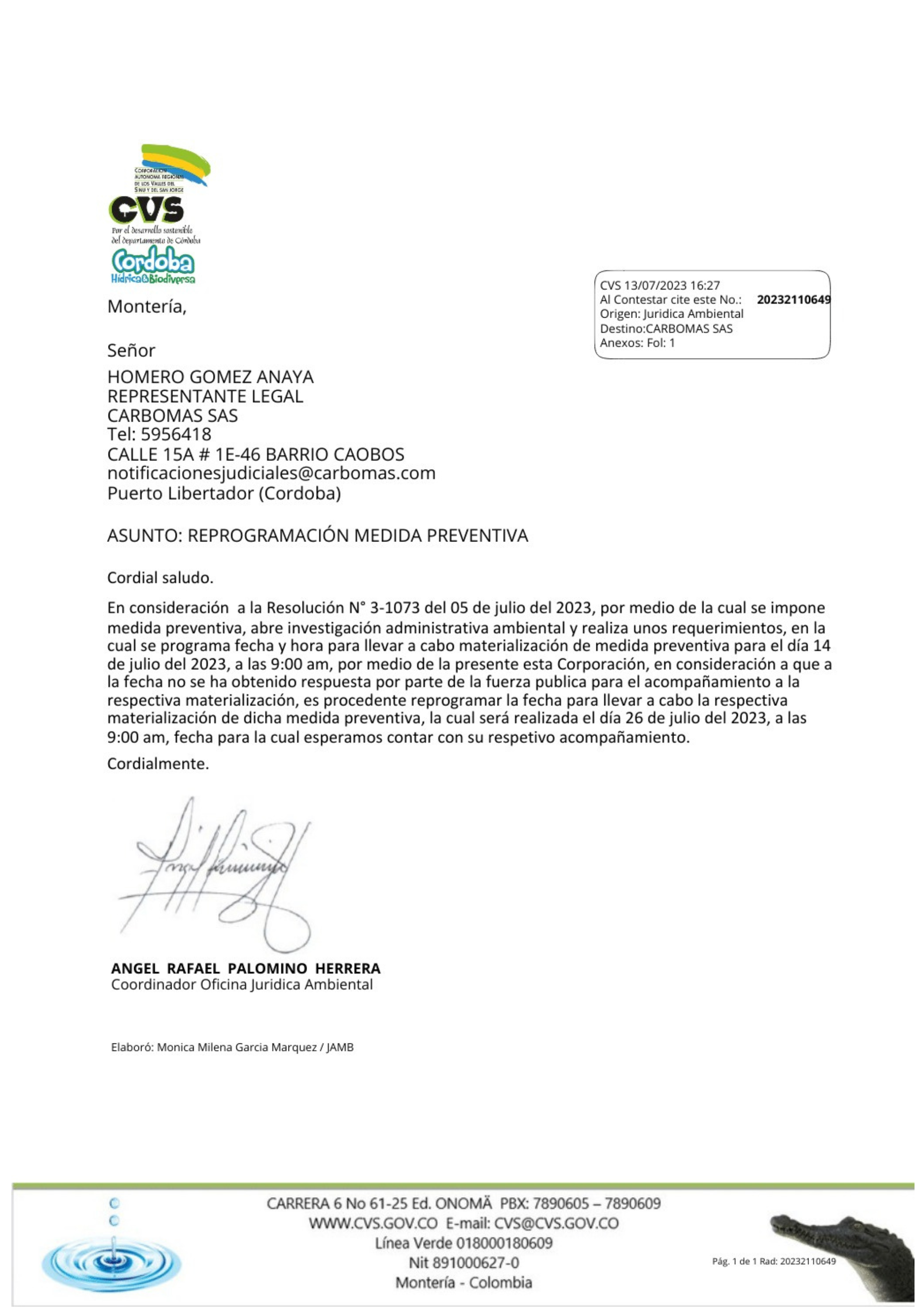 Tras lo resulto por la CVS, la comunidad sigue en Asamblea y movilización, pidiendo respuestas, pues la CVS no llegó al lugar, como lo había planteado y reprogramó la fecha para realizar la materialización de medida preventiva. “En consideración a la Resolución N° 3-1073 del 05 de julio del 2023, por medio de la cual se impone medida preventiva, abre investigación administrativa ambiental y realiza unos requerimientos, en la cual se programa fecha y hora para llevar a cabo materialización de medida preventiva para el día 14 de julio del 2023, a las 9:00 am, por medio de la presente esta Corporación, en consideración a que a la fecha no se ha obtenido respuesta por parte de la fuerza pública para el acompañamiento a la respectiva materialización, es procedente reprogramar la fecha para llevar a cabo la respectiva materialización de dicha medida preventiva, la cual será realizada el día 26 de julio del 2023, a las 9:00 am, fecha para la cual esperamos contar con su respetivo acompañamiento”. Comunicado.