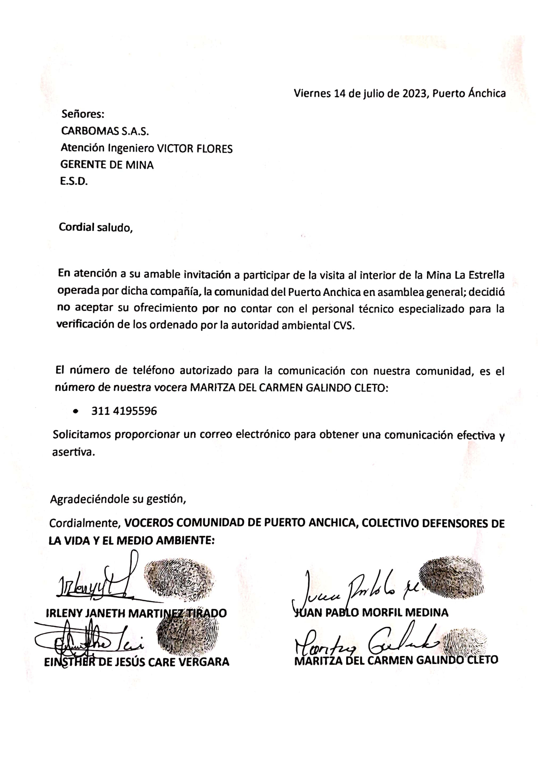 Tras la denuncia de la comunidad, la CVS, respondió. “En seguimiento a la denuncia presentada en redes sociales en el mes de junio de 2023, en el que se observó presuntamente la contaminación de la quebrada Anchica por parte de la empresa CARBOMAS, el día 15 de junio de 2023, funcionarios de la Subdirección de Gestión Ambiental, realizaron visita de Seguimiento y control al proyecto minero "Mina la Estrella" - Contrato de Concesión Minera No. No.501760 de la Agencia nacional de Minería), en compañía de la comunidad de Puerto Anchica y la alcaldía municipal (Licencia Ambiental RESOLUCIÓN Nº 3-0013 Del 21 de noviembre del 2022, generando el informe ALP Nº IV 2023-621 del 16 de junio de 2023, en el que se indica".