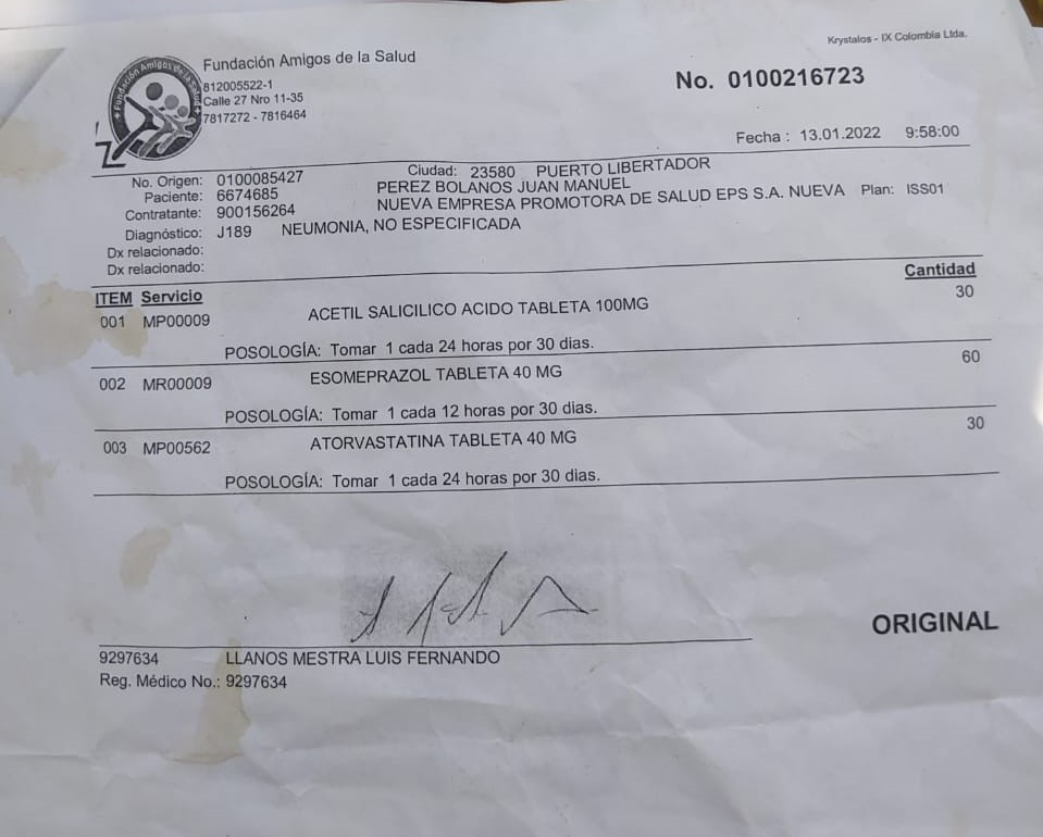 Según un reporte de Fundación Amigos de la Salud, del 13 de enero del presente año, al señor Juan Manuel, se le diagnosticó Neumonía no Especificada. Un S.O.S elevan miembros de la comunidad a las entidades de Salud municipal, departamental y nacional, para que el Juan Manuel, sea atendido y se le garantice la alimentación, los medicamentos y una condición digna en sus últimos días de vida. El llamado se extiende además a cualquier entidad de salud en el país, profesional o personas de buen corazón que deseen ayudar al señor Juan Manuel.