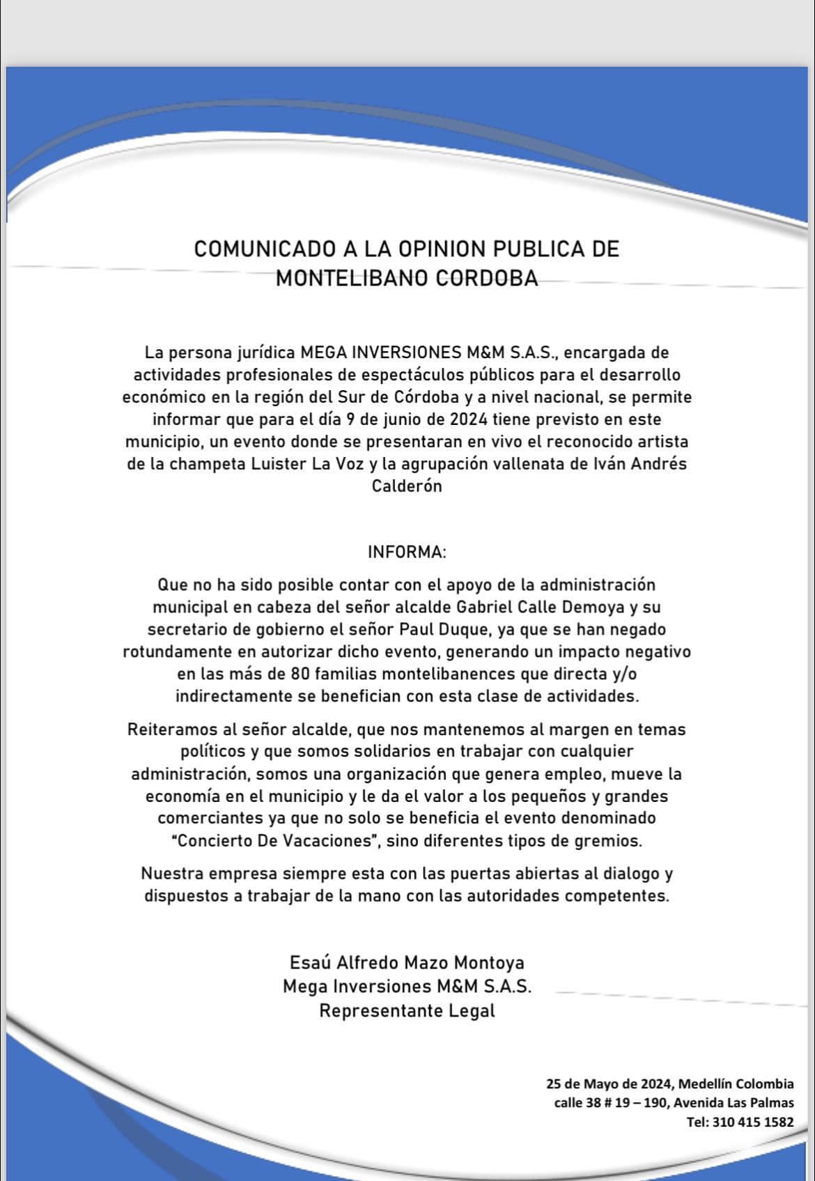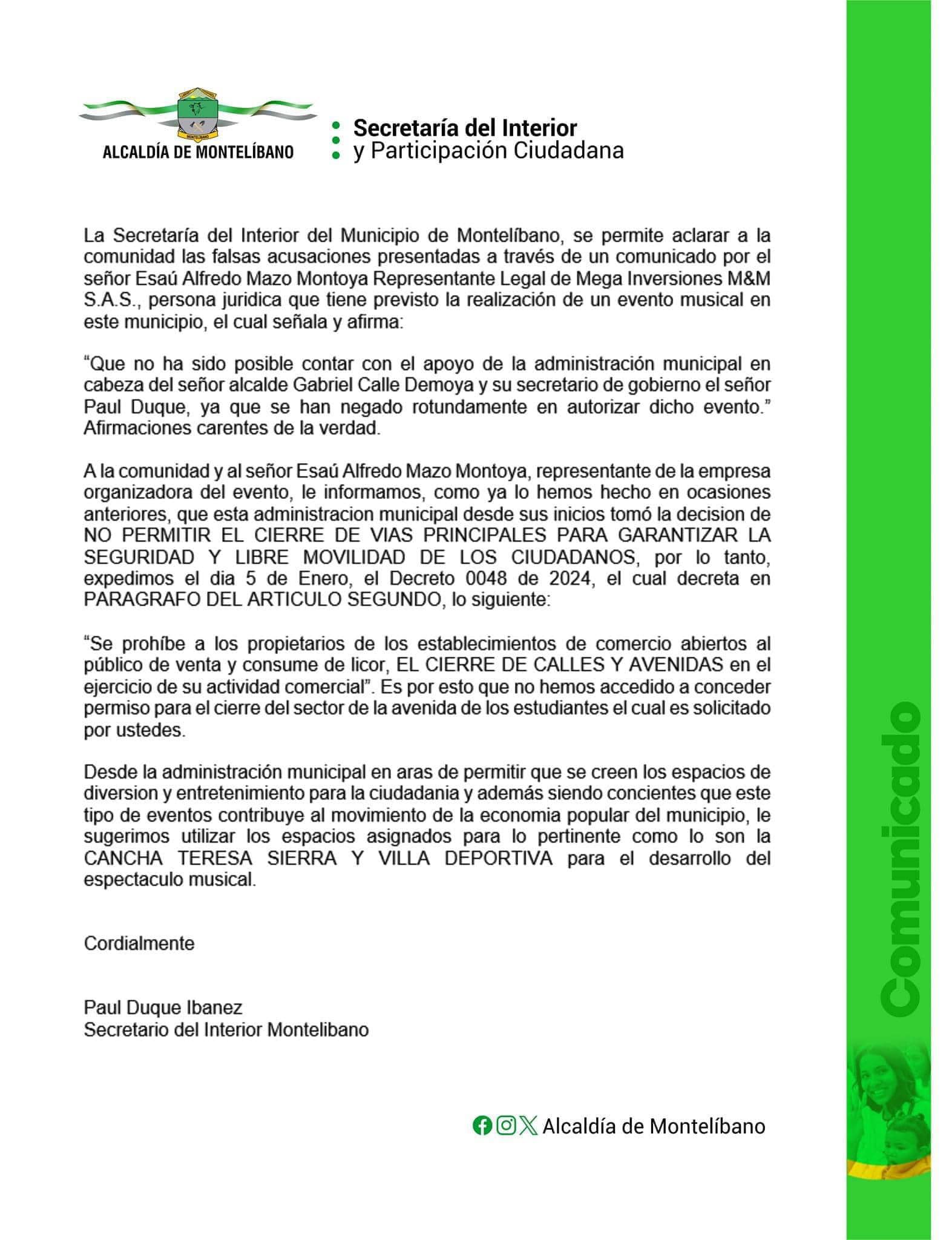 "La Secretaría del Interior del Municipio de Montelíbano, se permite aclarar a la comunidad las falsas acusaciones presentadas a través de un comunicado por el señor Esaú Alfredo Mazo Montoya Representante Legal de Mega Inversiones M&M S.A.S., persona jurídica que tiene previsto la realización de un evento musical en este municipio, el cual señala y afirma: "Que no ha sido posible contar con el apoyo de la administración municipal en cabeza del señor alcalde Gabriel Calle Demoya y su secretario de gobierno el señor Paul Duque, ya que se han negado rotundamente en autorizar dicho evento." Afirmaciones carentes de la verdad.