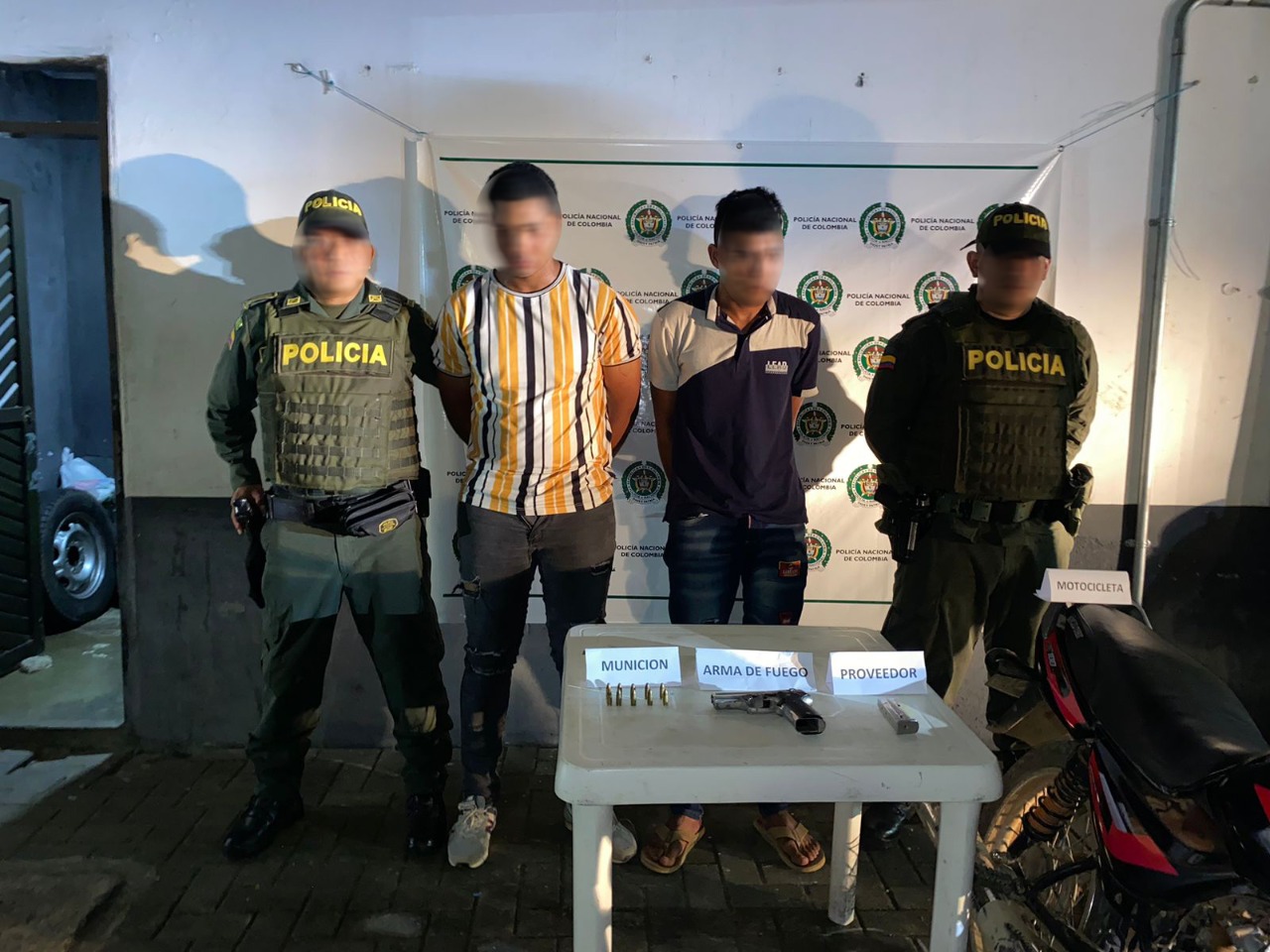 El procedimiento policial se llevó a cabo en el barrio El Paraíso en el municipio de Montelibano, donde los uniformados lograron sorprender a dos sujetos que se movilizaban en una motocicleta, portando un arma de fuego de fabricación artesanal tipo pistola calibre 9 milímetros con munición.