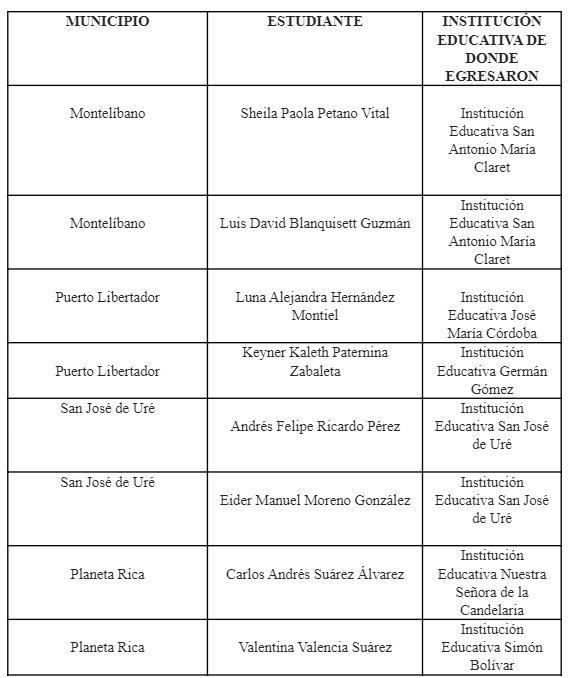 La entrega de las becas contó con la presencia de autoridades locales como los alcaldes Ramón Calle (Planeta Rica), Ramón Rubio (Puerto Libertador) y los secretarios de Educación, Edwar Ramos (Montelíbano) e Iván Baltazar (San José de Uré).