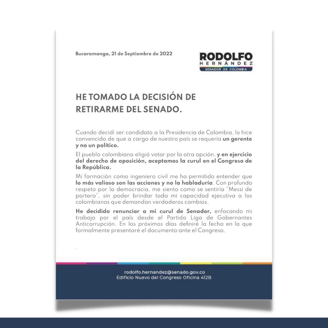 Nacional. El ex candidato presidencial y senador de Colombia, Rodolfo Hernández, anunció oficialmente su renuncia a la curul del senado, obtenida por medio del estatuto de oposición.