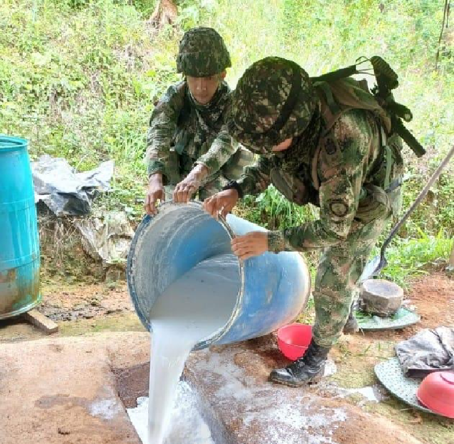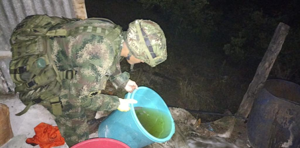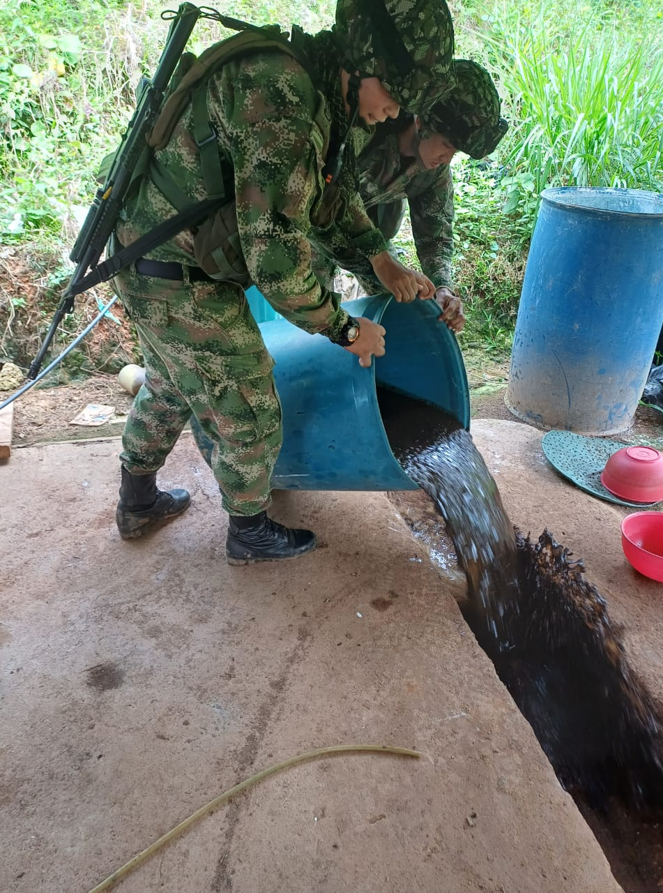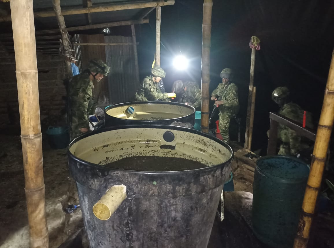 Durante las operaciones militares se destruyeron dos estructuras con 21 canecas plásticas, 165 galones de pasta base de coca en proceso y 320 en solución, una trituradora, 800 kilos de hoja de coca, 130 galones de gasolina, ACPM y amoniaco, entre otros insumos líquidos y sólidos para la fabricación del alcaloide.