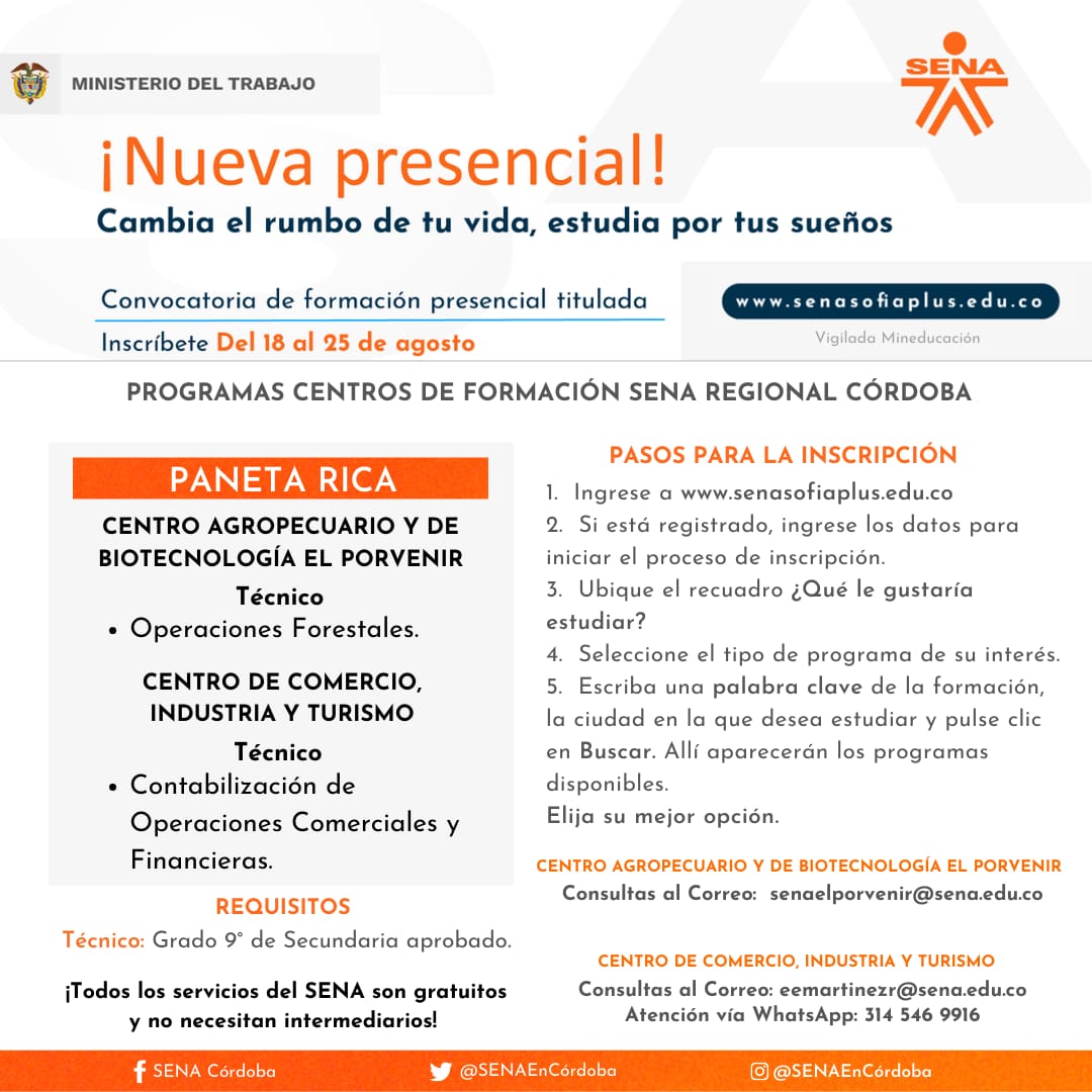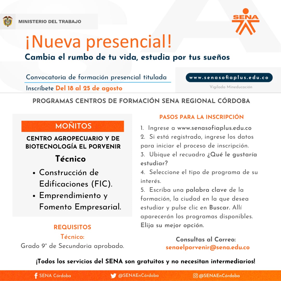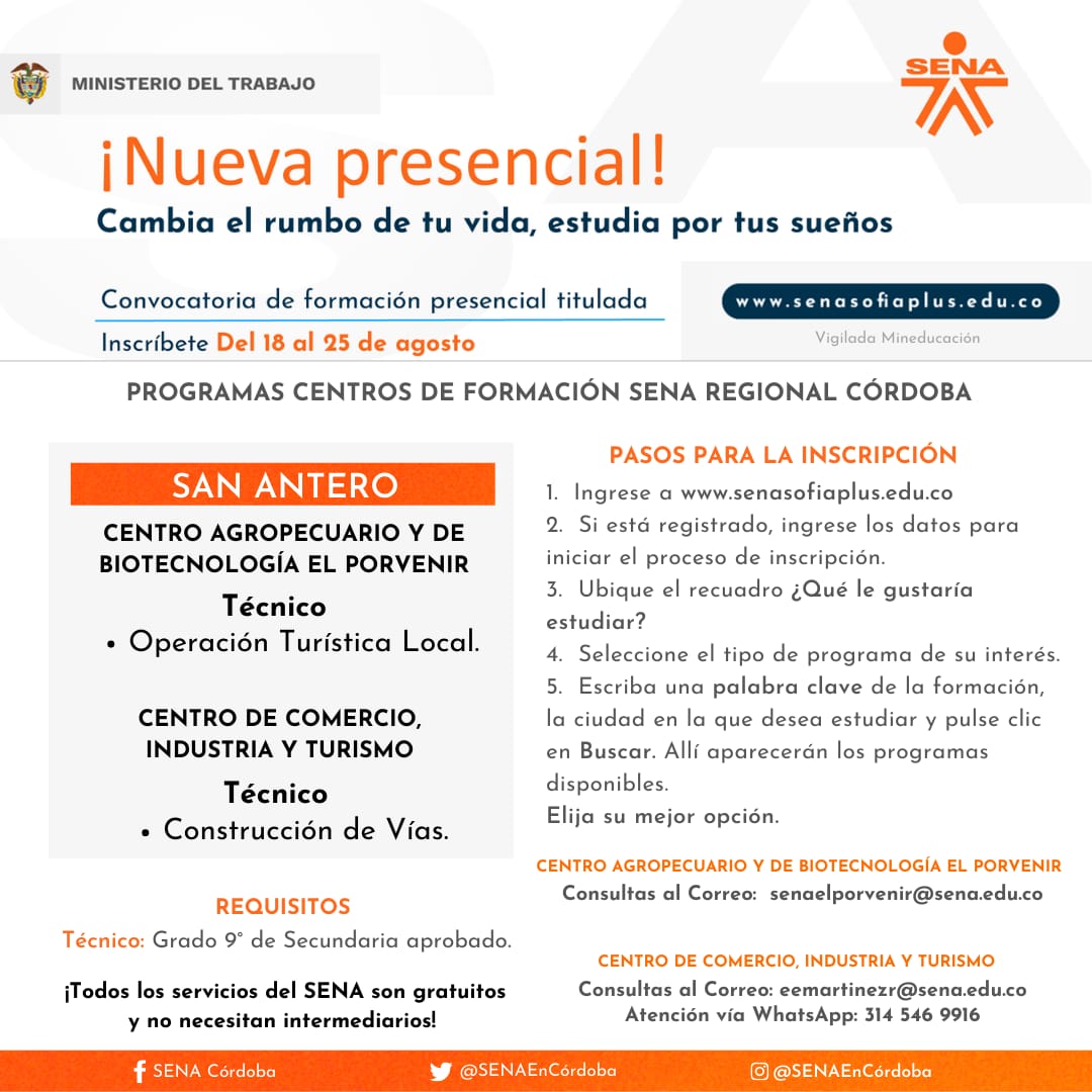 Así mismo, para consultas del Centro Agropecuario y de Biotecnología El Porvenir, puede escribir al correo: senaelporvenir@sena.edu.co y en el caso del Centro de Comercio, Industria y Turismo, al correo: eemartinezr@sena.edu.co y el contacto WhatsApp de atención es 3145469916.