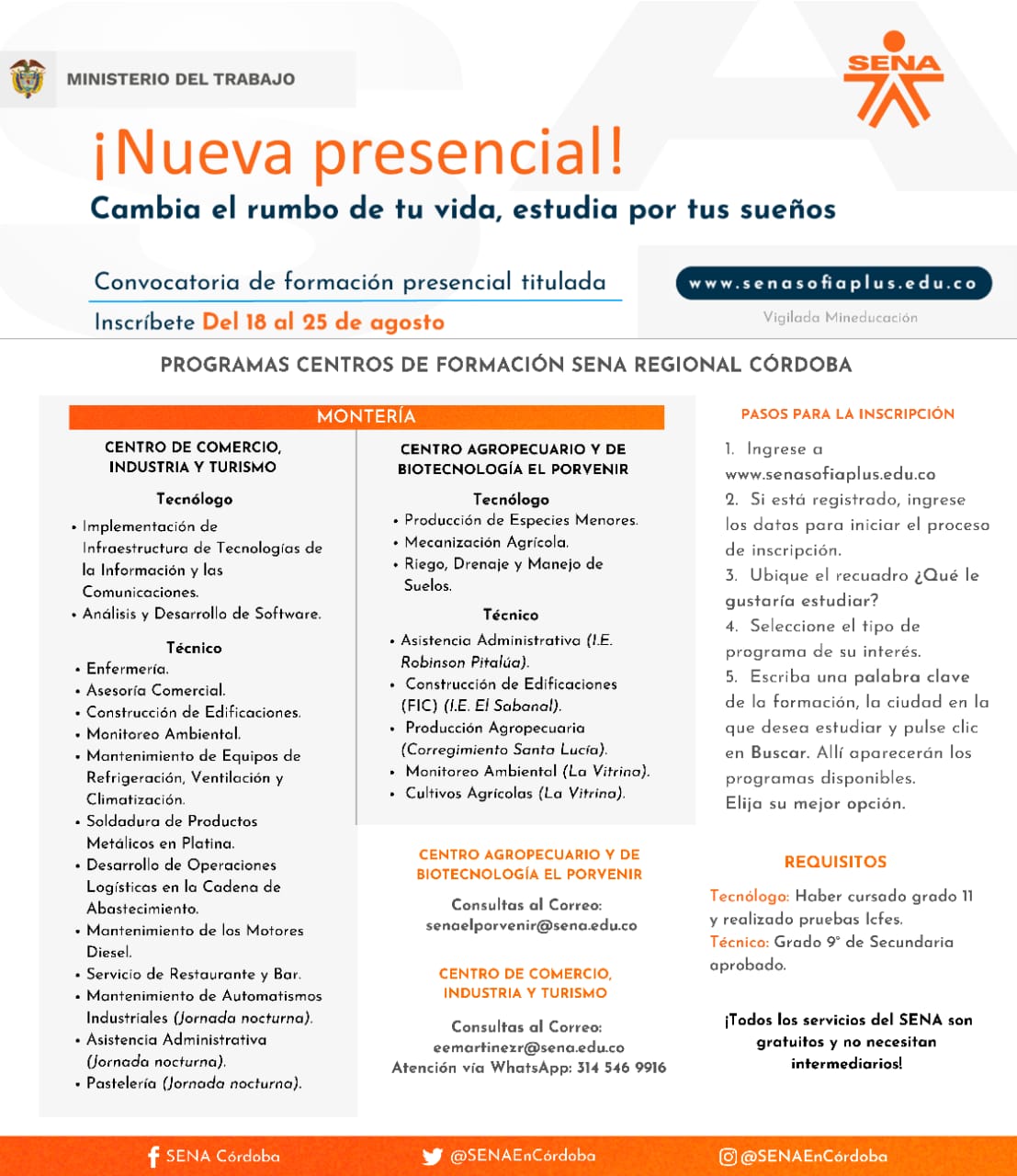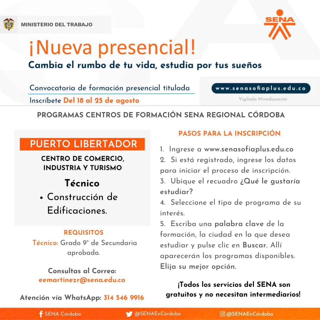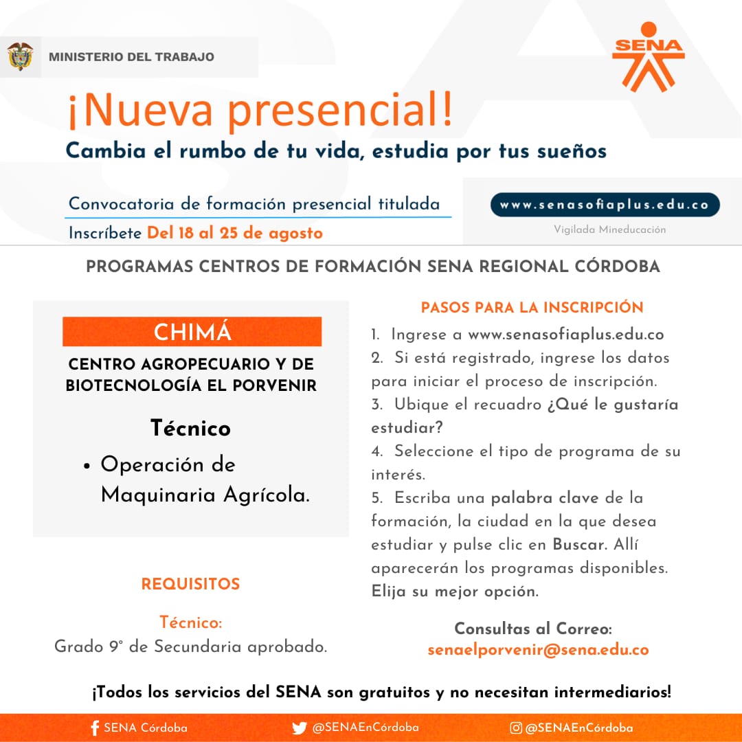 Así mismo, para consultas del Centro Agropecuario y de Biotecnología El Porvenir, puede escribir al correo: senaelporvenir@sena.edu.co y en el caso del Centro de Comercio, Industria y Turismo, al correo: eemartinezr@sena.edu.co y el contacto WhatsApp de atención es 3145469916.