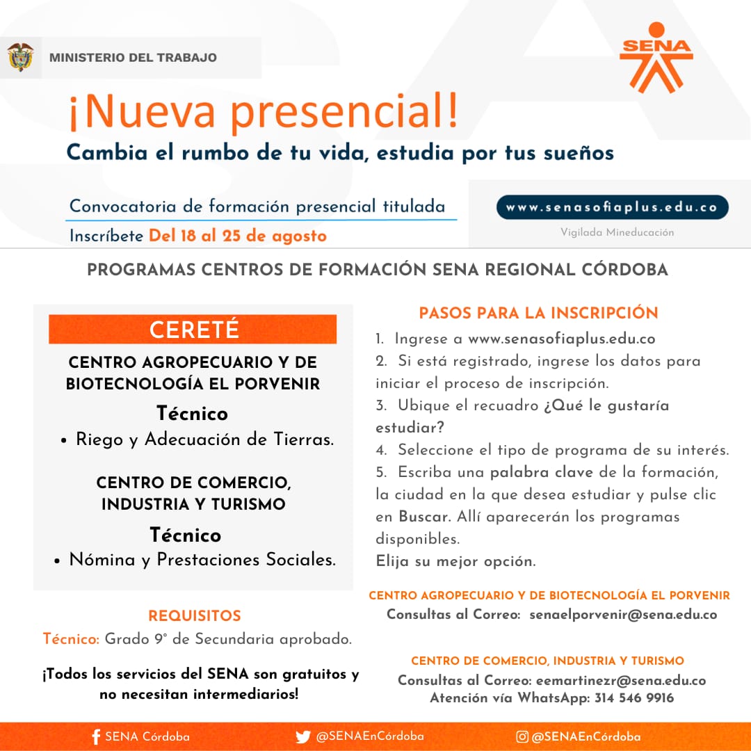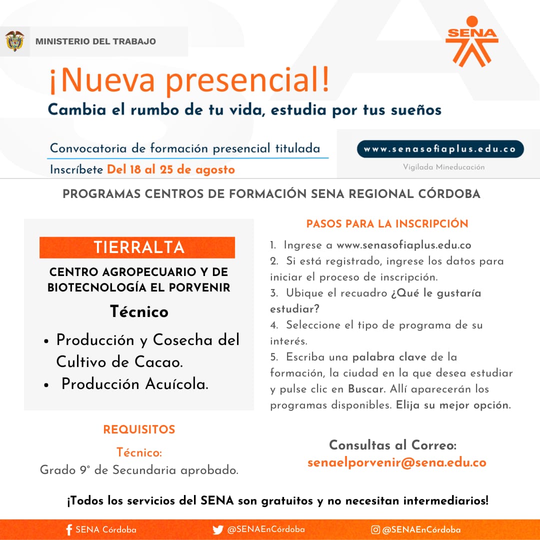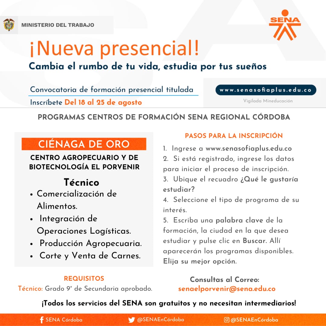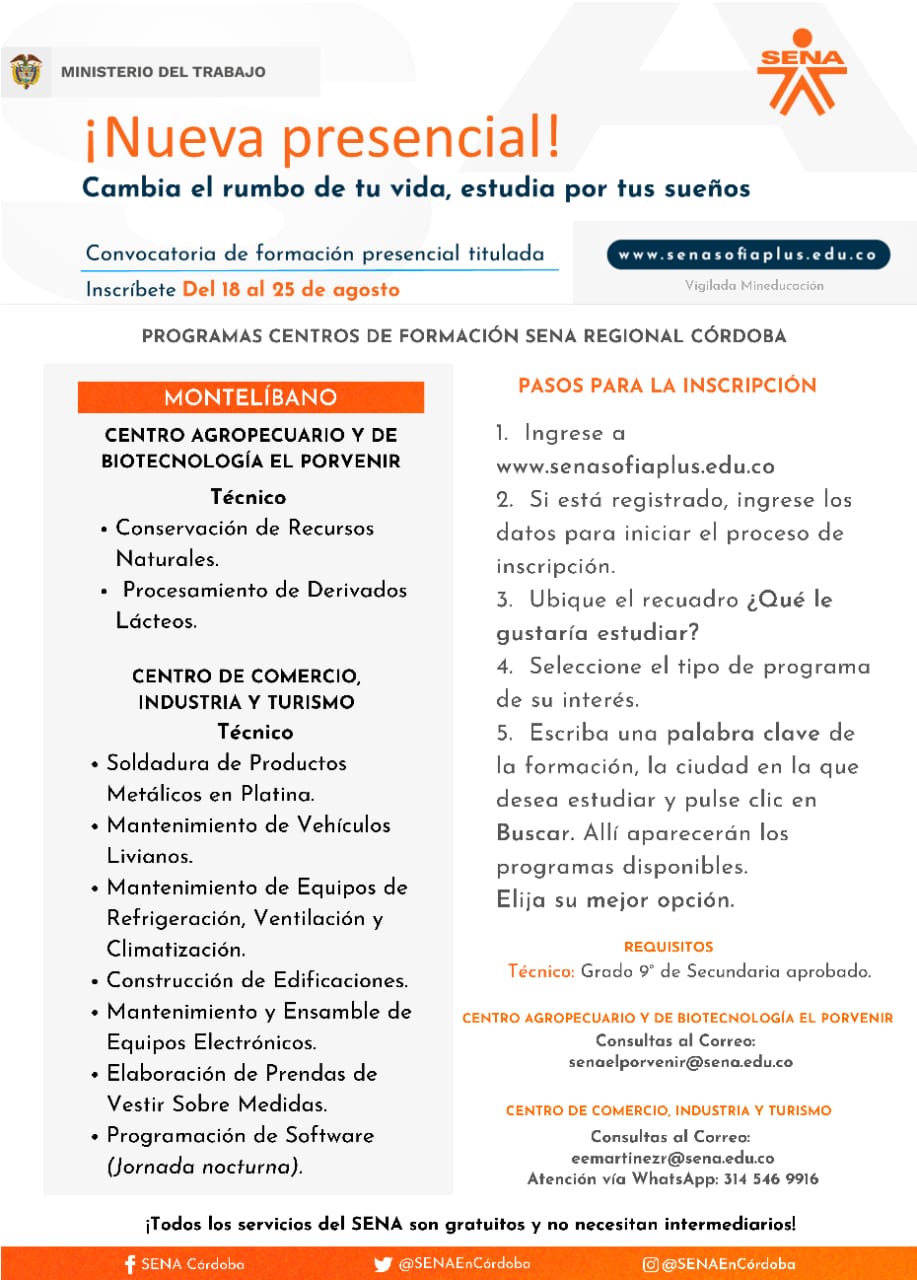 Para el caso de Córdoba, se cuenta con 1.830 cupos disponibles para estudiar a través del Centro Agropecuario y de Biotecnología El Porvenir y el Centro de Comercio, Industria y Turismo, en 20 municipios del departamento. El director regional Víctor Ariza Palma indicó que se ofertan 5 programas tecnólogos y 58 técnicos.