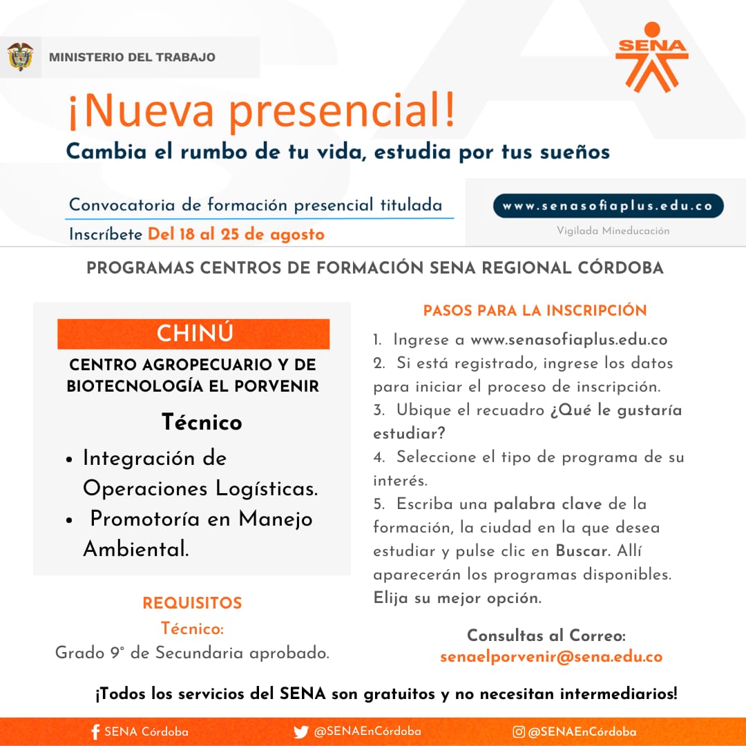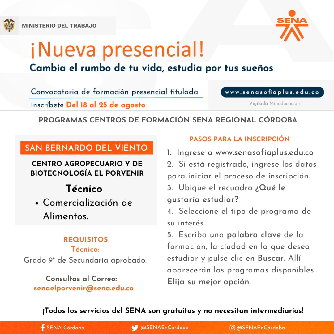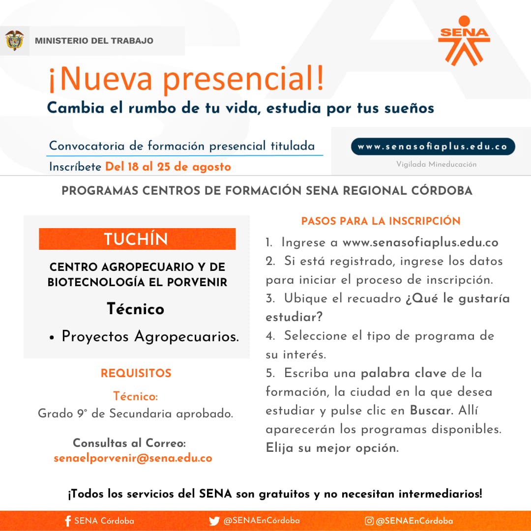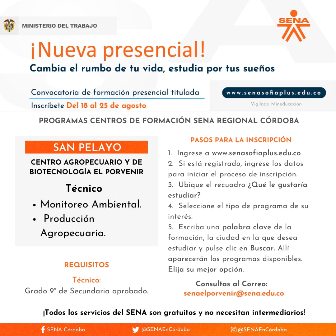 Para el caso de Córdoba, se cuenta con 1.830 cupos disponibles para estudiar a través del Centro Agropecuario y de Biotecnología El Porvenir y el Centro de Comercio, Industria y Turismo, en 20 municipios del departamento. El director regional Víctor Ariza Palma indicó que se ofertan 5 programas tecnólogos y 58 técnicos.