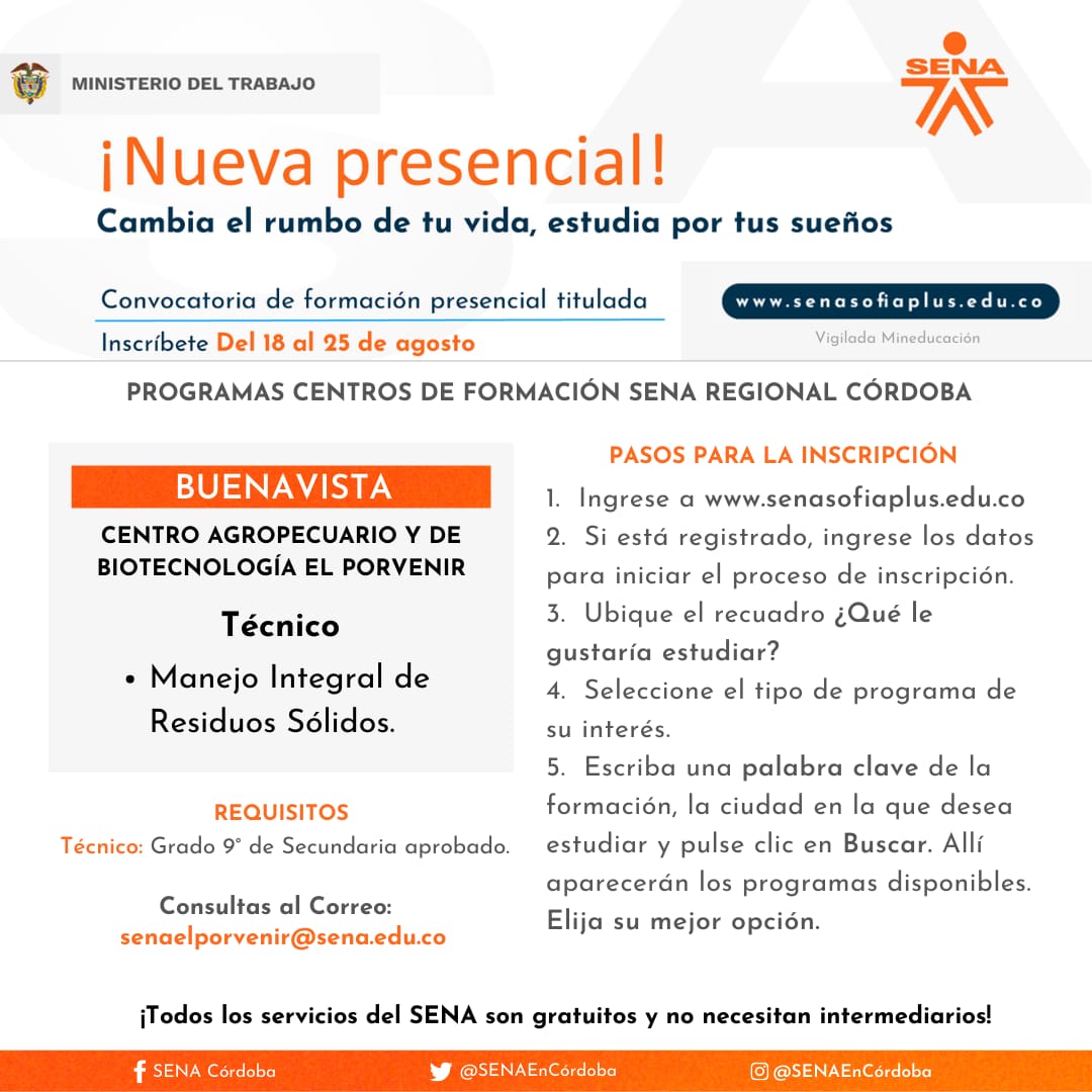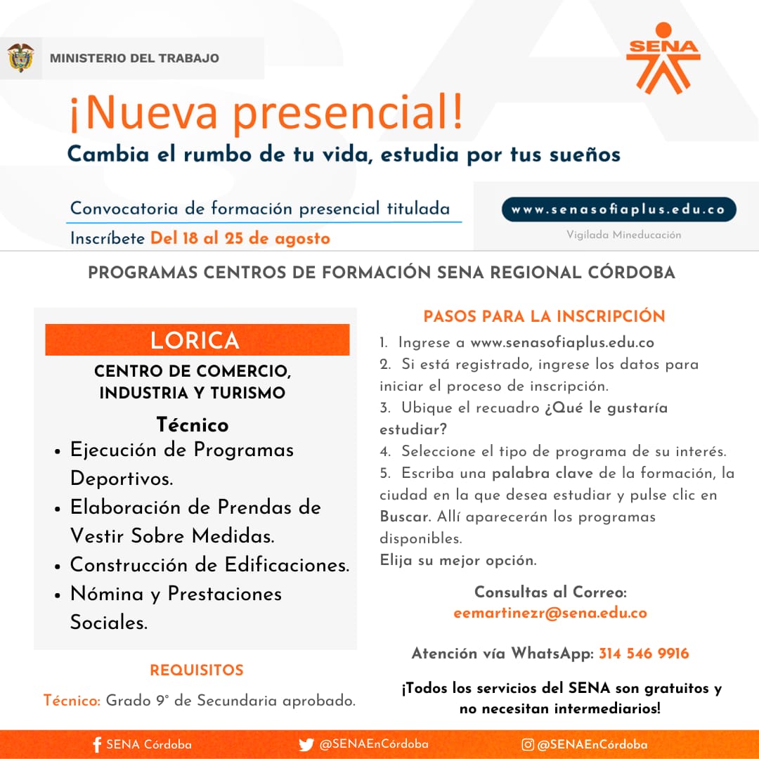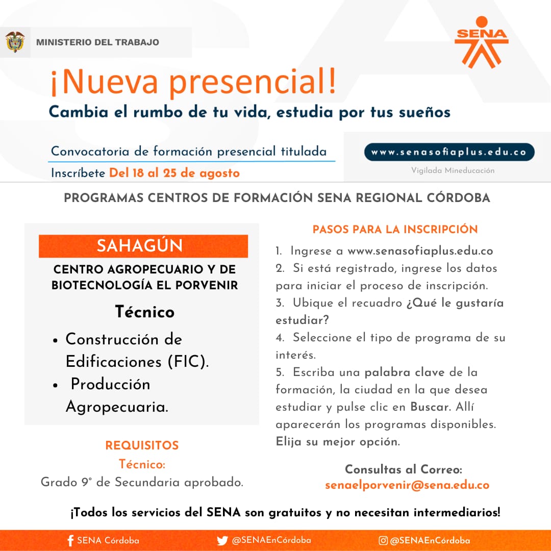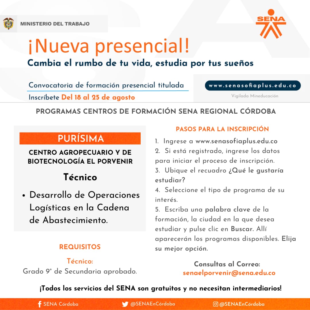 Para el caso de Córdoba, se cuenta con 1.830 cupos disponibles para estudiar a través del Centro Agropecuario y de Biotecnología El Porvenir y el Centro de Comercio, Industria y Turismo, en 20 municipios del departamento. El director regional Víctor Ariza Palma indicó que se ofertan 5 programas tecnólogos y 58 técnicos.