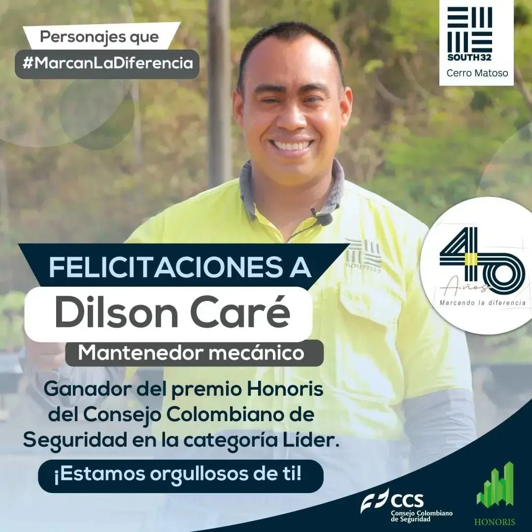 "En Cerro Matoso nos sentimos muy orgullosos porque Dilson David Caré, mantenedor mecánico de nuestra empresa, fue elegido ganador en la categoría Líder del premio Honoris, organizado por el Consejo Colombiano de Seguridad. Este es un reconocimiento también a Cerro Matoso y a nuestro compromiso con la prevención, gestión y cultura en seguridad, salud en el trabajo y protección ambiental. Fueron más de 70 las compañías postuladas, doce nominadas y cuatro, las galardonadas.