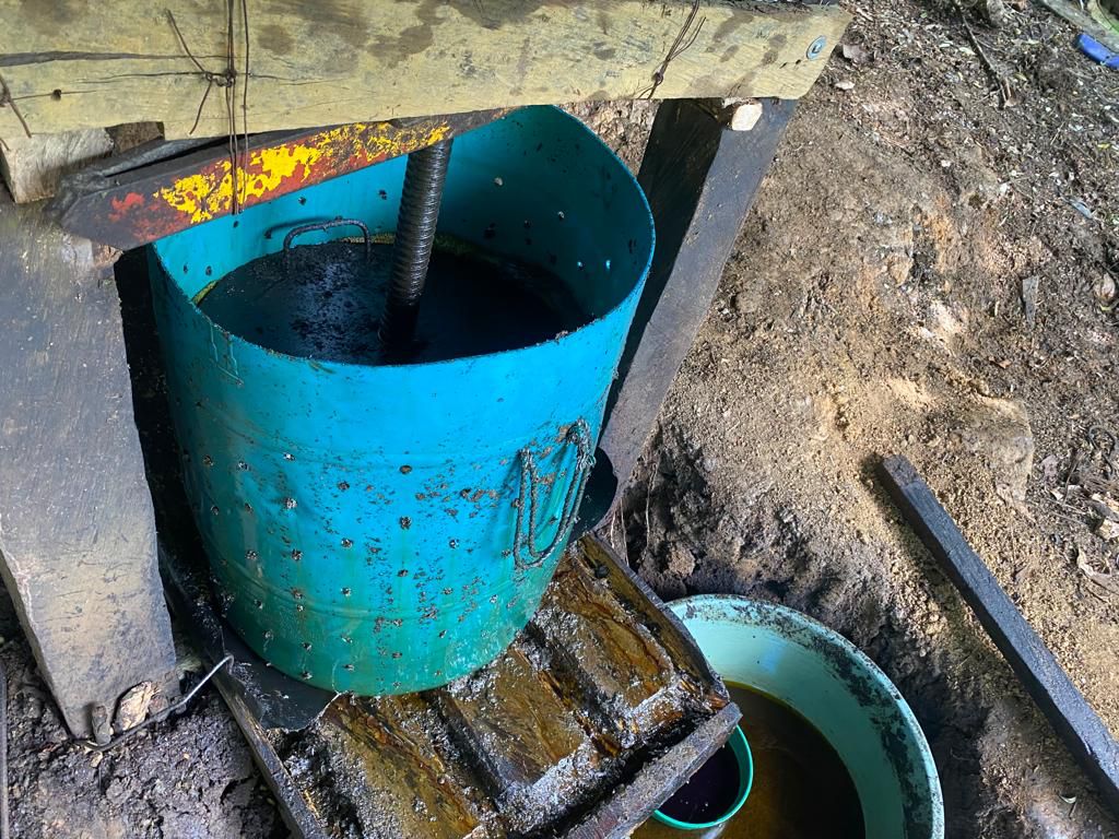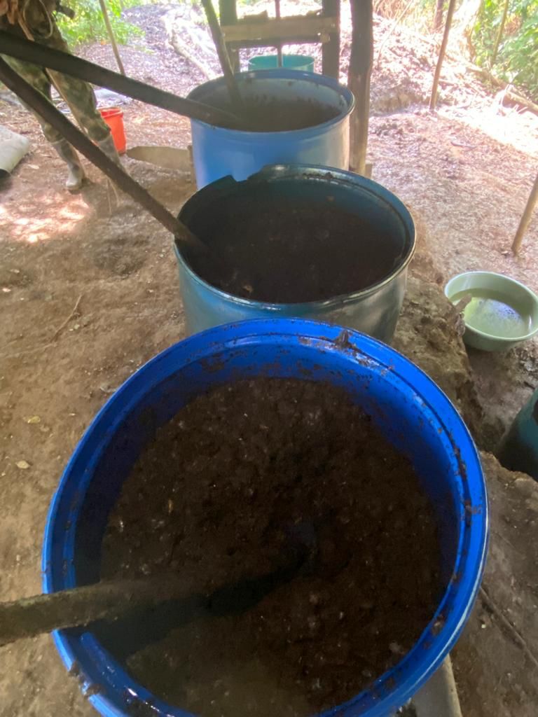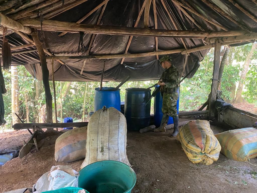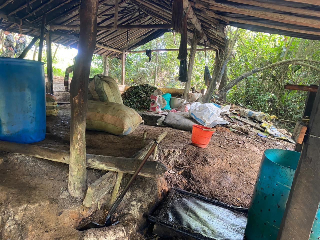 En la estructura se encontraron 5 canecas plásticas, 40 galones de ACPM, 160 galones de gasolina con hoja de coca en procesamiento, además de 10 galones de PBC en proceso, cerca de 400 kilos de hoja de coca, 25 kilos de cemento, 4 kilos de cal y 30 kilos de hoja de coca prensada.