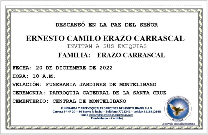 Montelíbano. El día 20 de diciembre a las 10 de la mañana se realizarán las exequias del ingeniero, Ernesto Camilo Erazo Carrascal, quien falleció la madrugada del domingo 18 de diciembre, tras un accidente de tránsito.