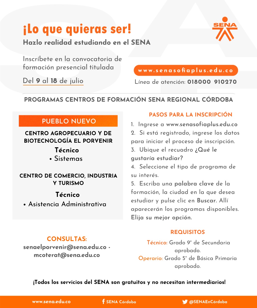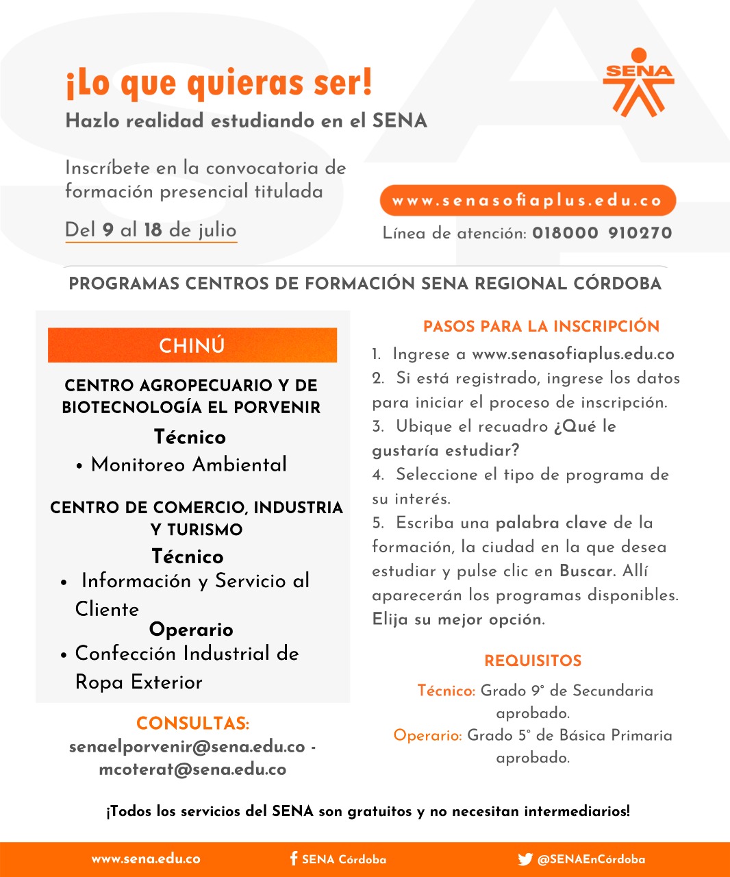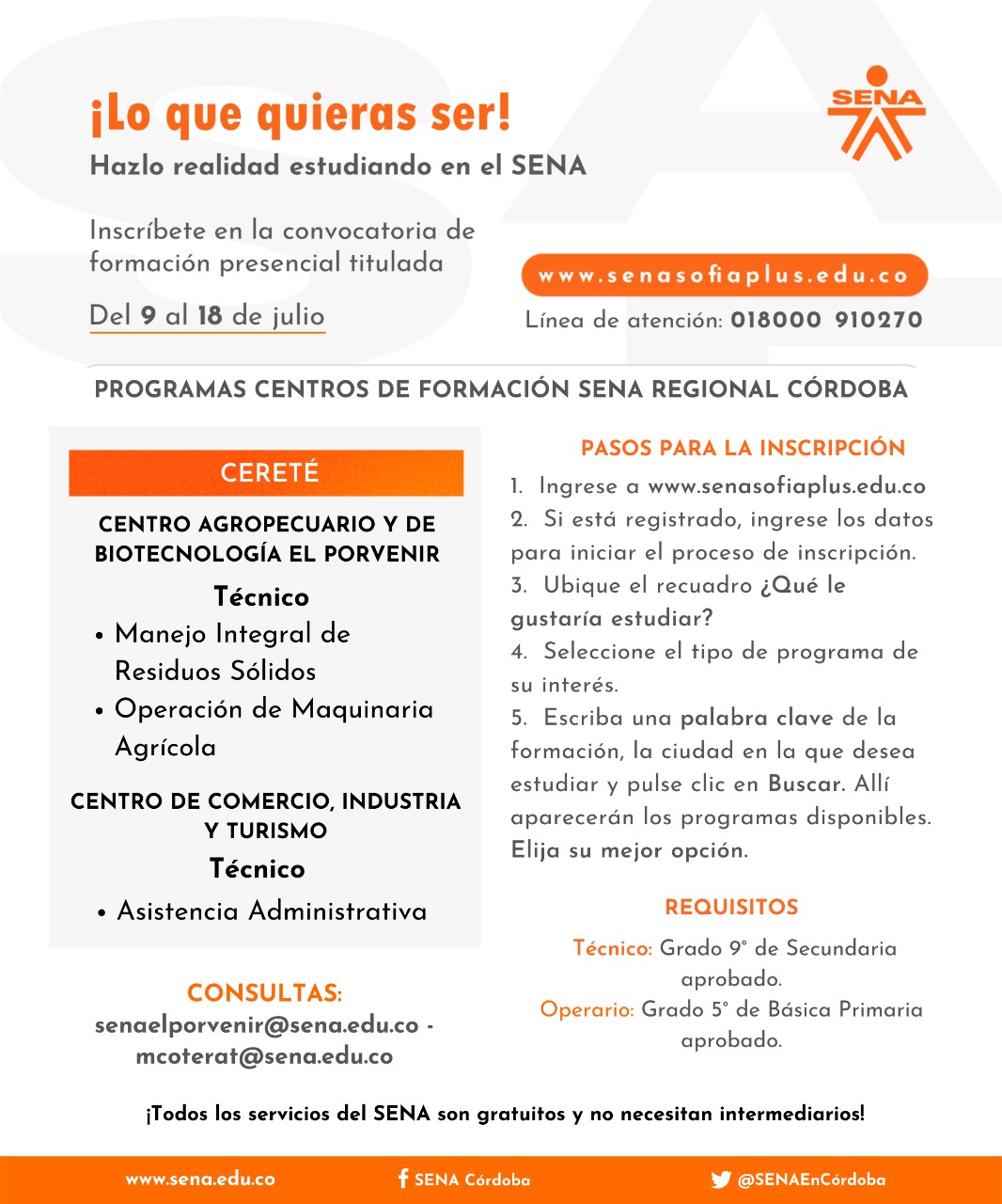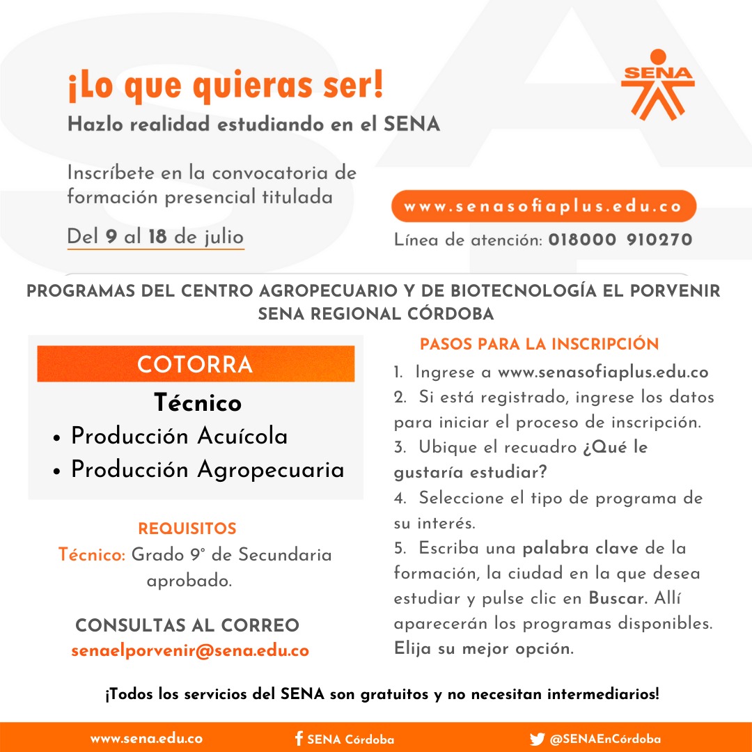 Para más información sobre la convocatoria del SENA comuníquese en Bogotá al 3430111 y en el resto del país al 018000-910-270. Para consultas relacionadas con los programas del Centro Agropecuario y de Biotecnología El Porvenir, puede escribir al siguiente correo: senaelporvenir@sena.edu.co Y para consultas del Centro de Comercio, Industria y Turismo, puede comunicarse al correo: mcoterat@sena.edu.co Atención vía WhatsApp: 3235316894.