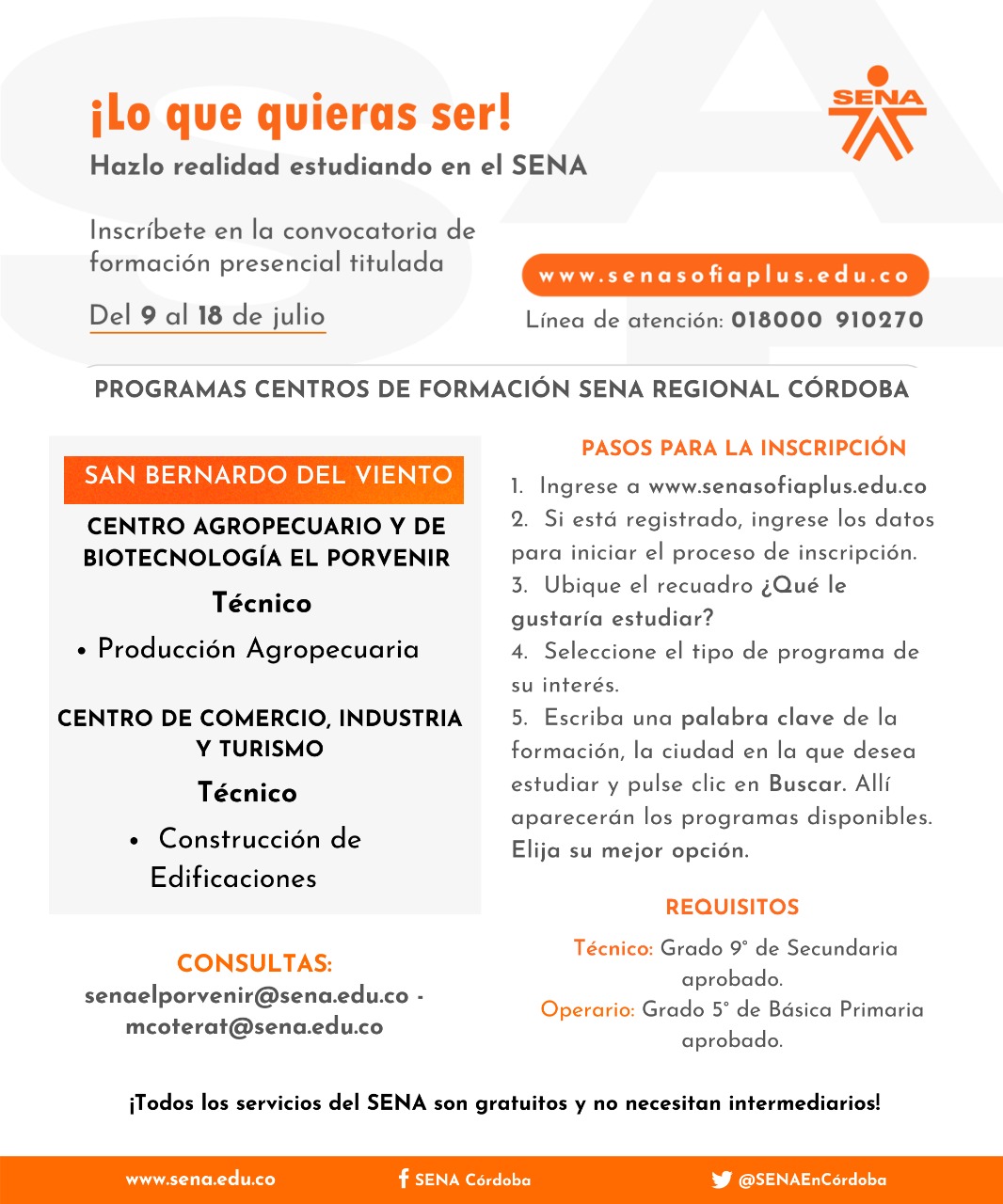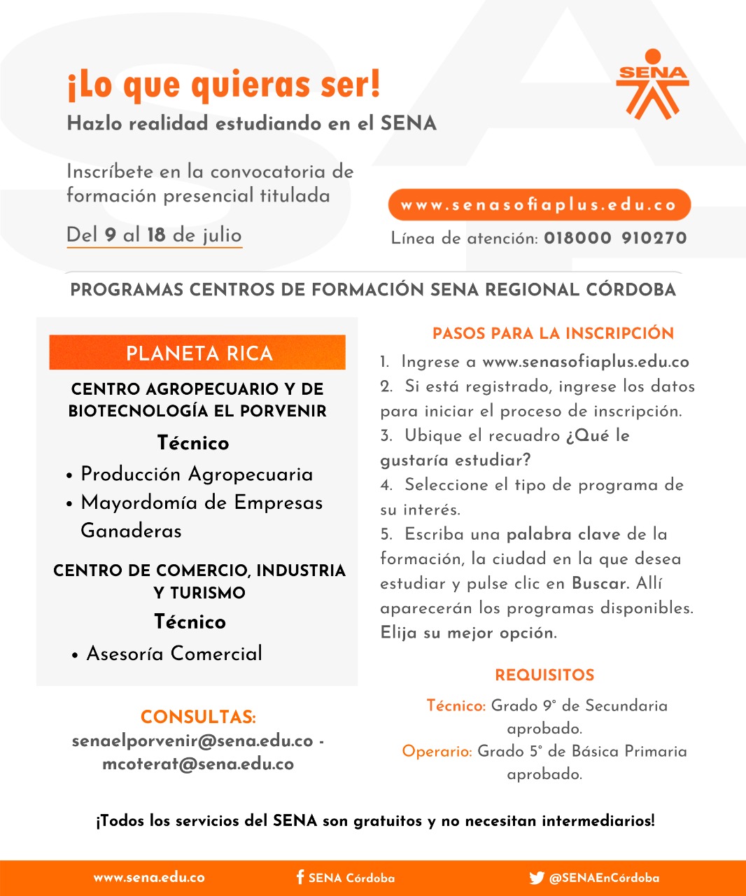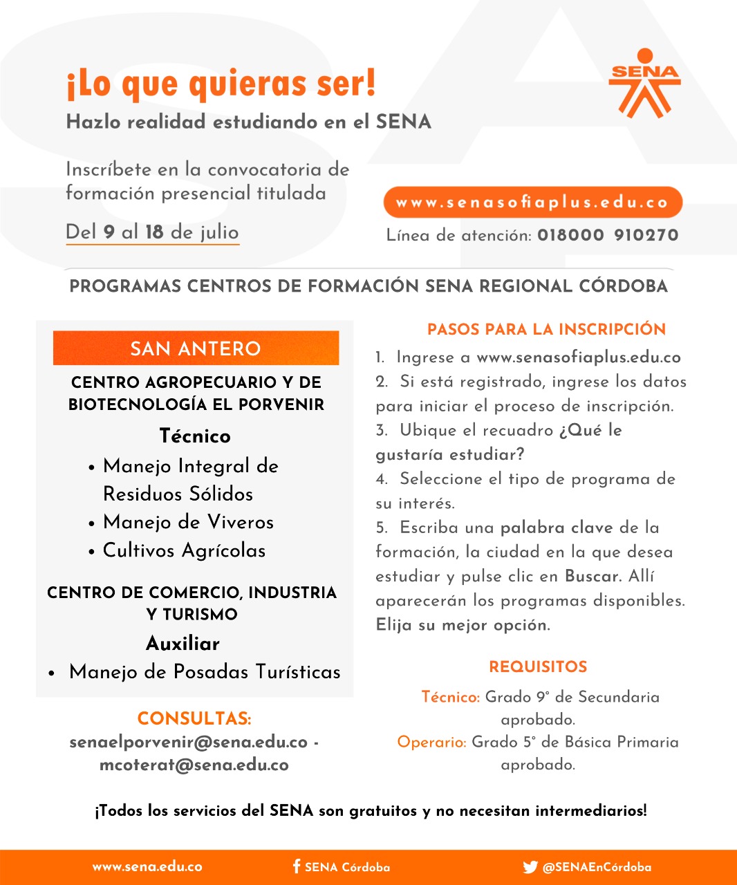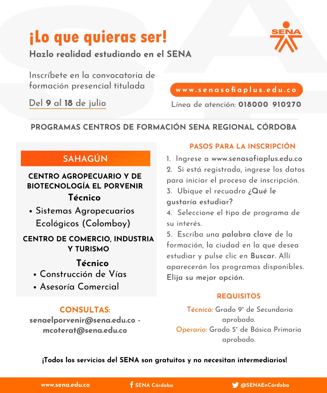 Para más información sobre la convocatoria del SENA comuníquese en Bogotá al 3430111 y en el resto del país al 018000-910-270. Para consultas relacionadas con los programas del Centro Agropecuario y de Biotecnología El Porvenir, puede escribir al siguiente correo: senaelporvenir@sena.edu.co Y para consultas del Centro de Comercio, Industria y Turismo, puede comunicarse al correo: mcoterat@sena.edu.co Atención vía WhatsApp: 3235316894.