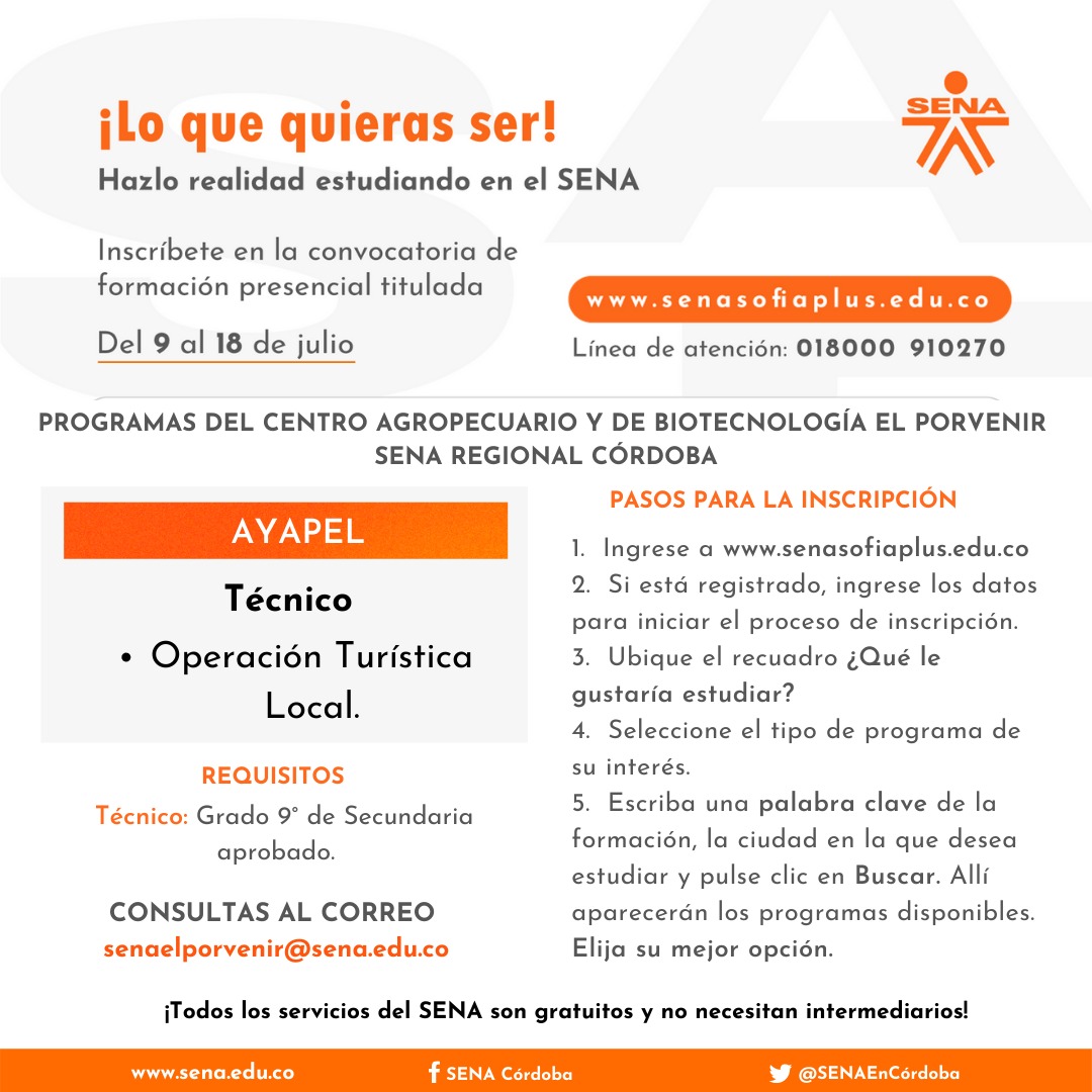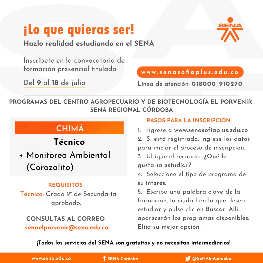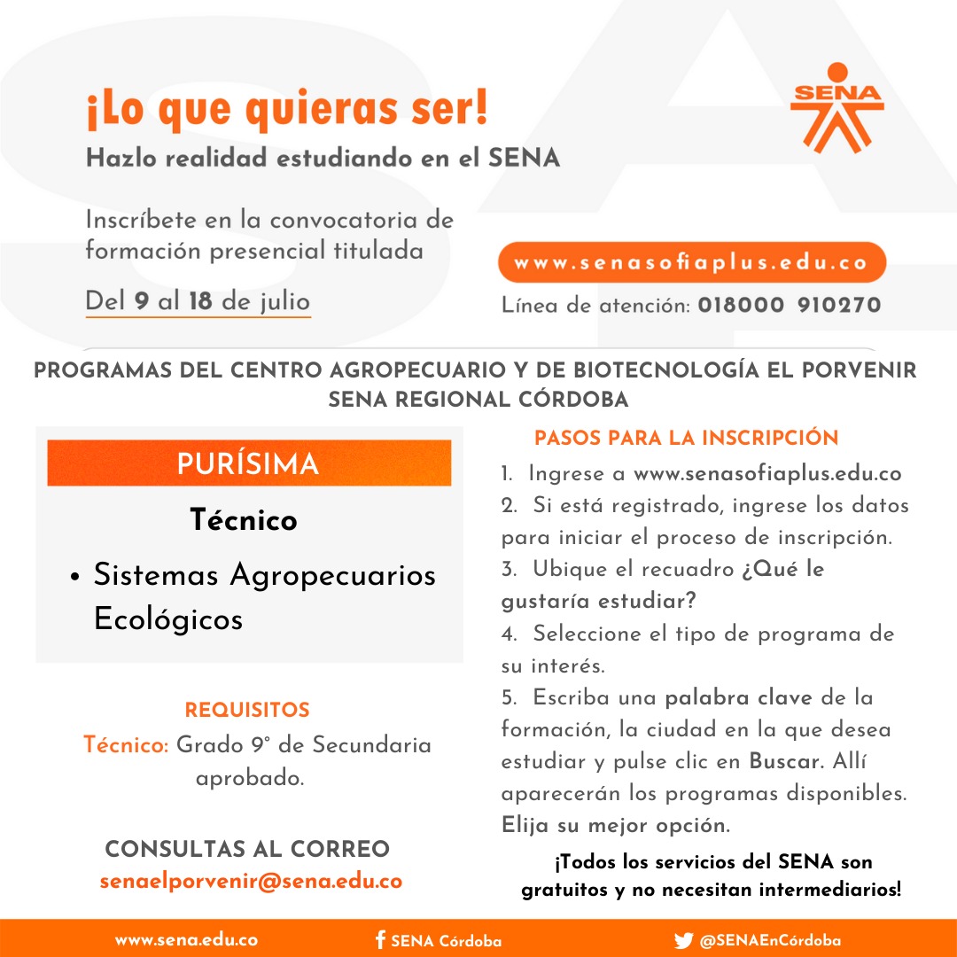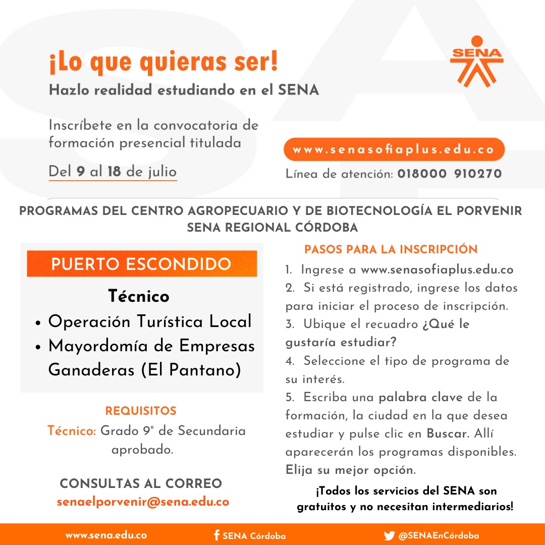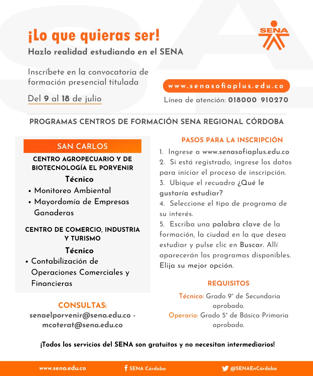 Para más información sobre la convocatoria del SENA comuníquese en Bogotá al 3430111 y en el resto del país al 018000-910-270. Para consultas relacionadas con los programas del Centro Agropecuario y de Biotecnología El Porvenir, puede escribir al siguiente correo: senaelporvenir@sena.edu.co Y para consultas del Centro de Comercio, Industria y Turismo, puede comunicarse al correo: mcoterat@sena.edu.co Atención vía WhatsApp: 3235316894.