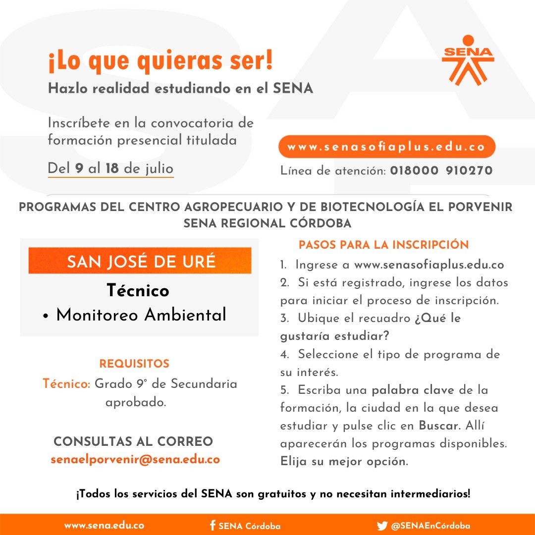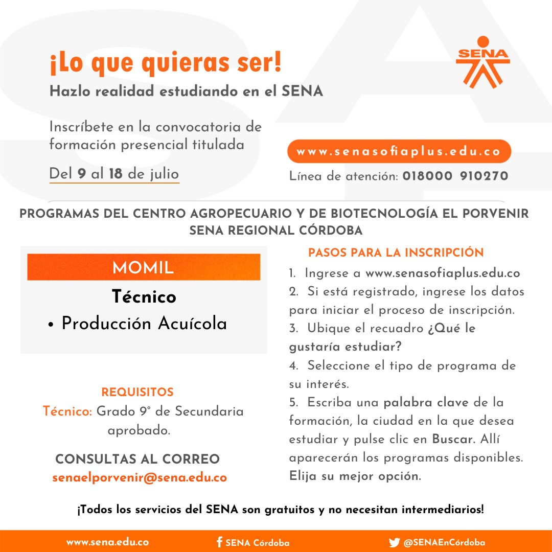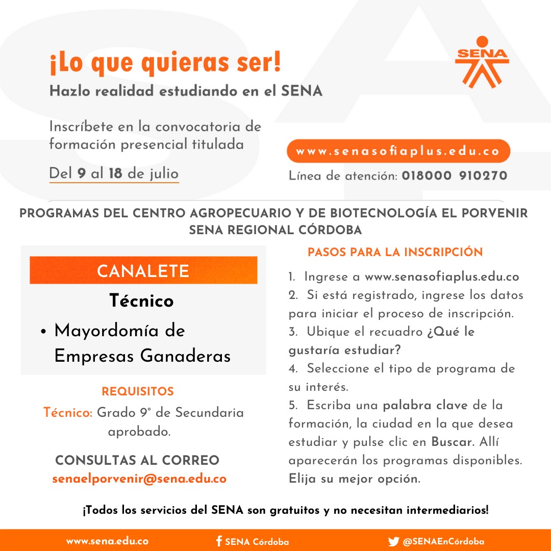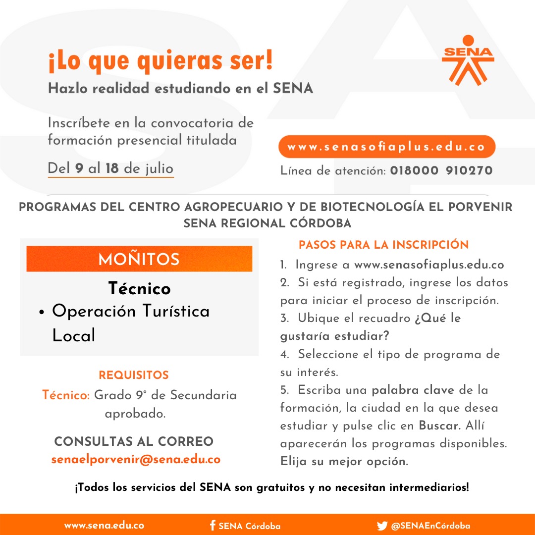 Para más información sobre la convocatoria del SENA comuníquese en Bogotá al 3430111 y en el resto del país al 018000-910-270. Para consultas relacionadas con los programas del Centro Agropecuario y de Biotecnología El Porvenir, puede escribir al siguiente correo: senaelporvenir@sena.edu.co Y para consultas del Centro de Comercio, Industria y Turismo, puede comunicarse al correo: mcoterat@sena.edu.co Atención vía WhatsApp: 3235316894.