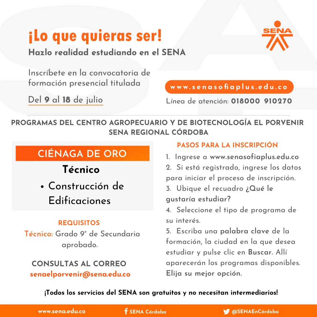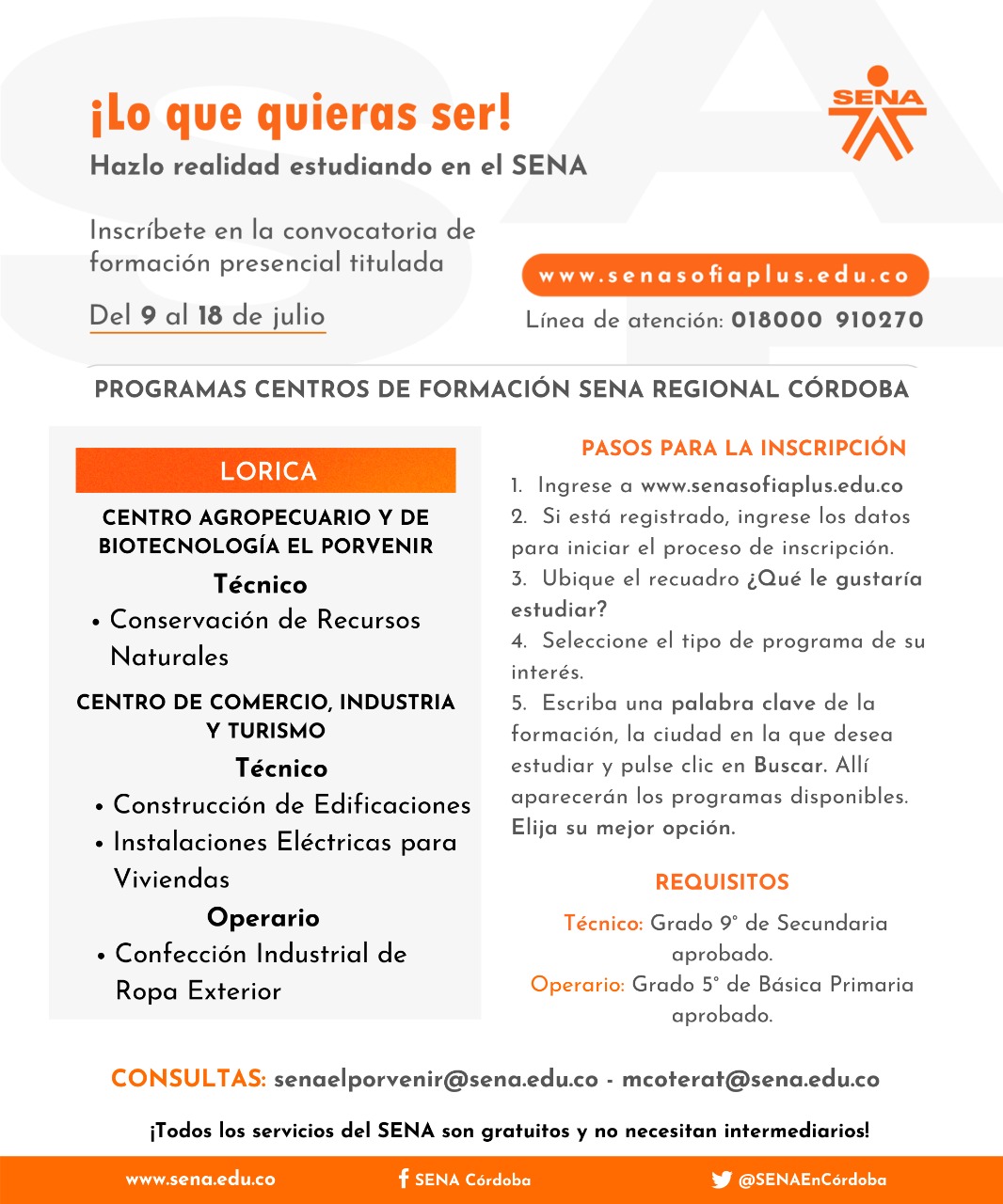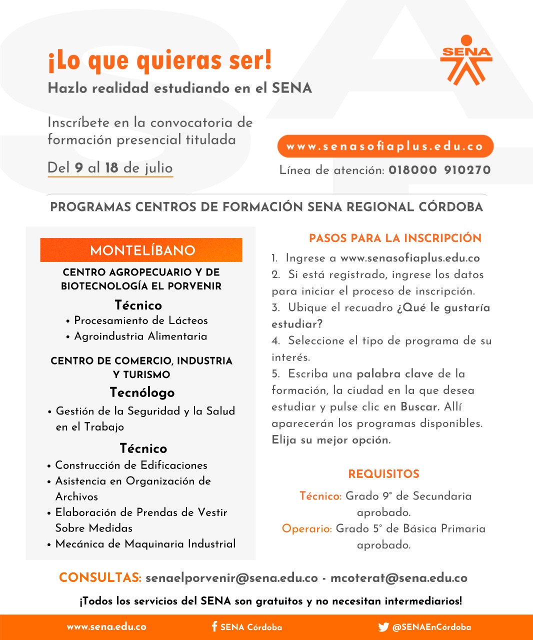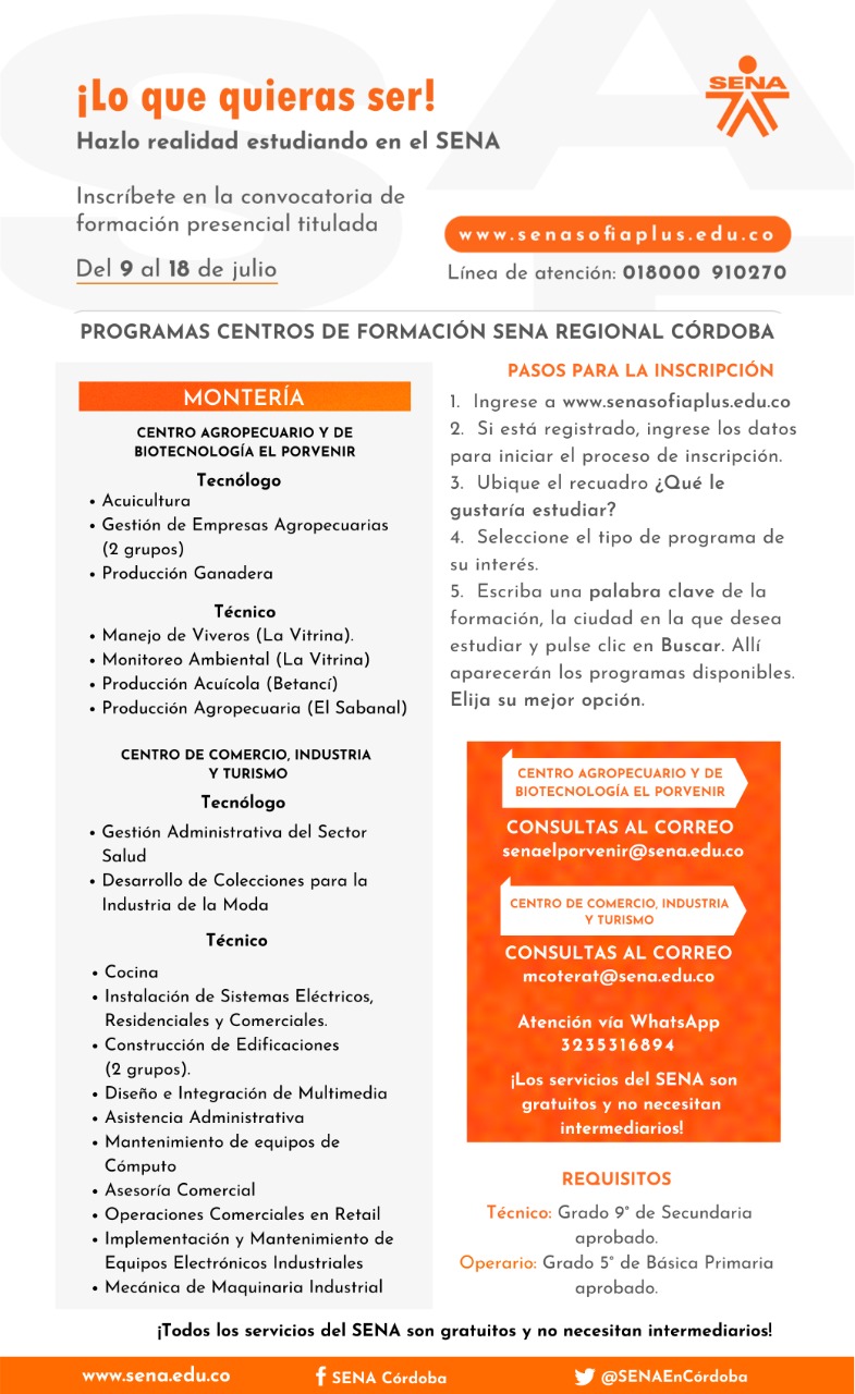 Córdoba. El Servicio Nacional de Aprendizaje- SENA- abre una nueva convocatoria de formación presencial, del 9 al 18 de julio, para capacitar a los jóvenes e interesados en general en niveles: auxiliar, operario, profundización técnica, técnico y tecnólogo.