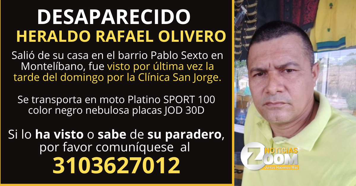 "Salió de su casa en el barrio Pablo Sexto en Montelíbano, fue visto por última vez la tarde del domingo por la Clínica San Jorge. Se transporta en moto Platino SPORT 100 color negro nebulosa placas JOD 30D", confirmó su familia el pasado 05 de septiembre