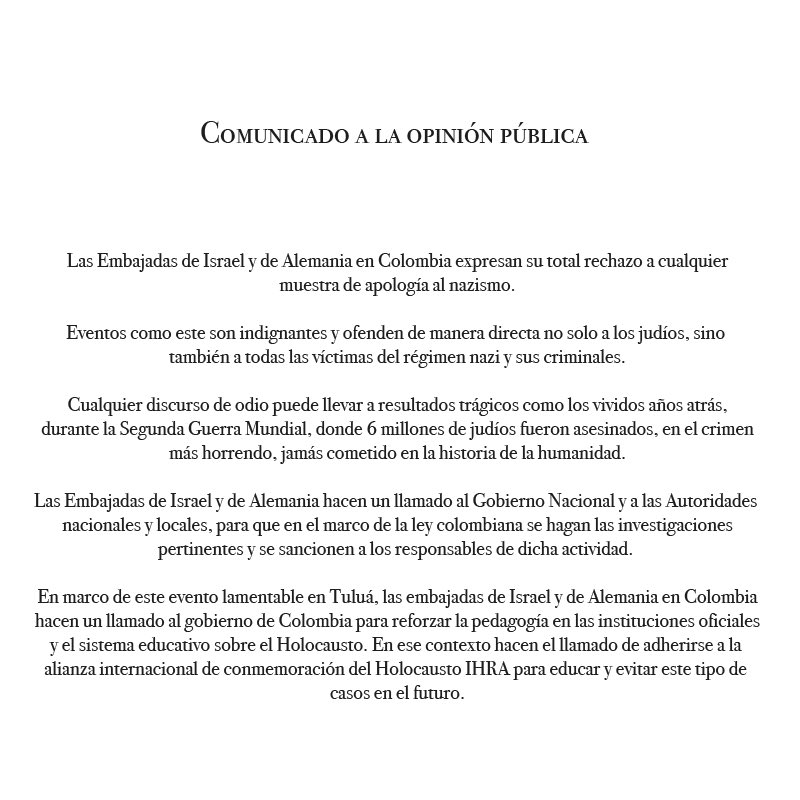 “Cualquier discurso de odio puede llevar a resultados trágicos como los vívidos años atrás, durante la Segunda Guerra Mundial, donde 6 millones de judíos fueron asesinados, en el crimen más horrendo, jamás cometido en la historia de la humanidad”, dice aparte del comunicado emitido por las embajadas de Israel y Alemania.