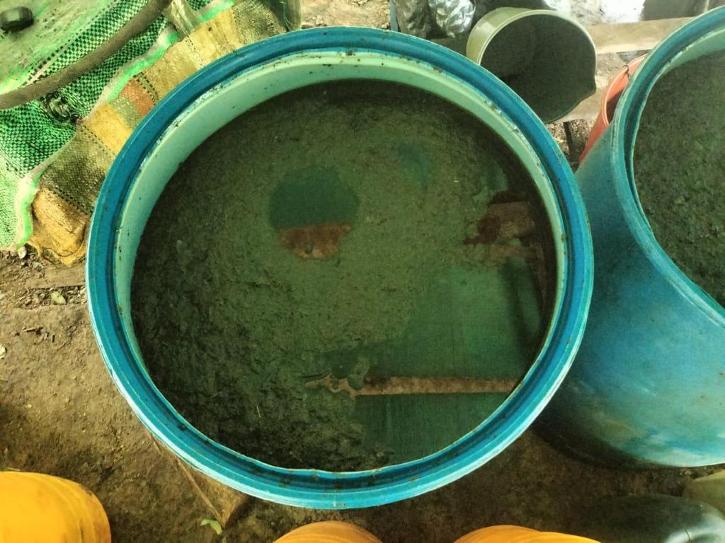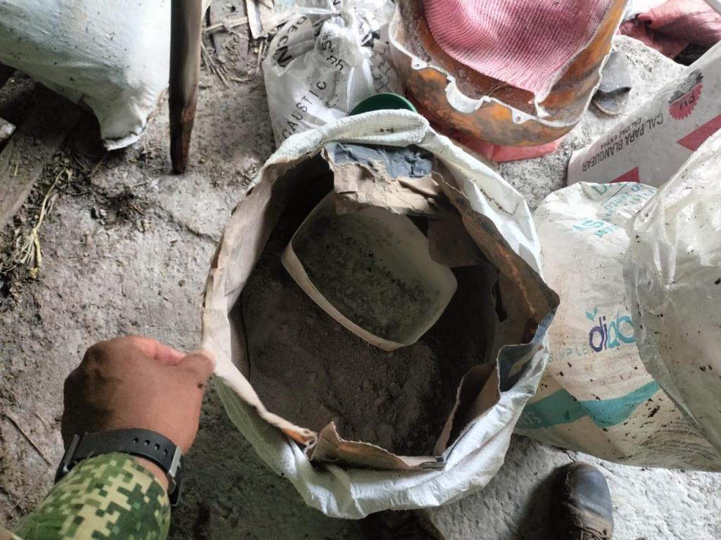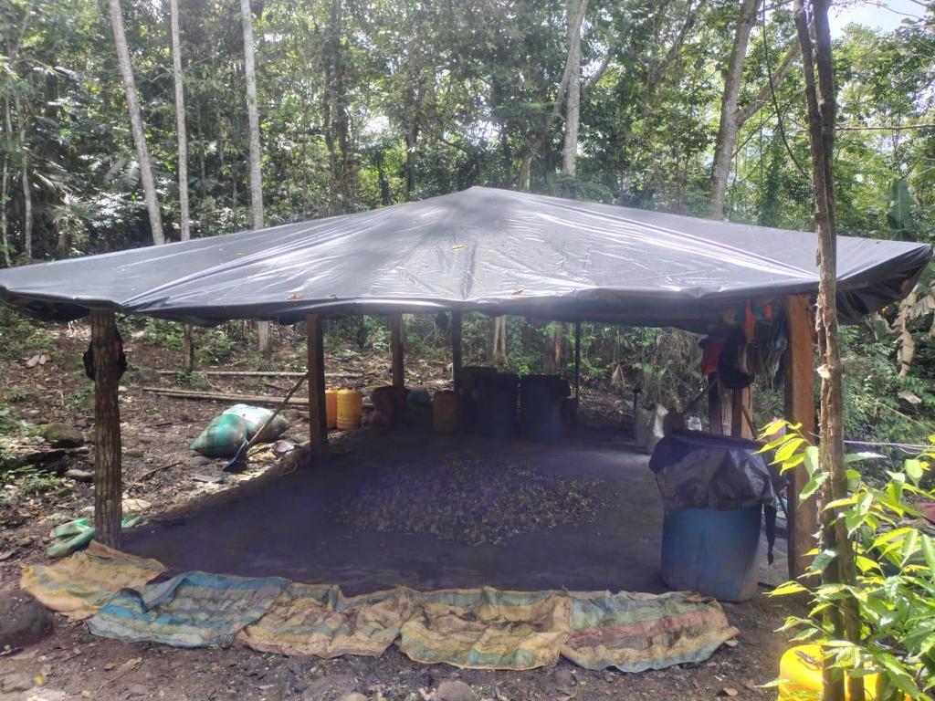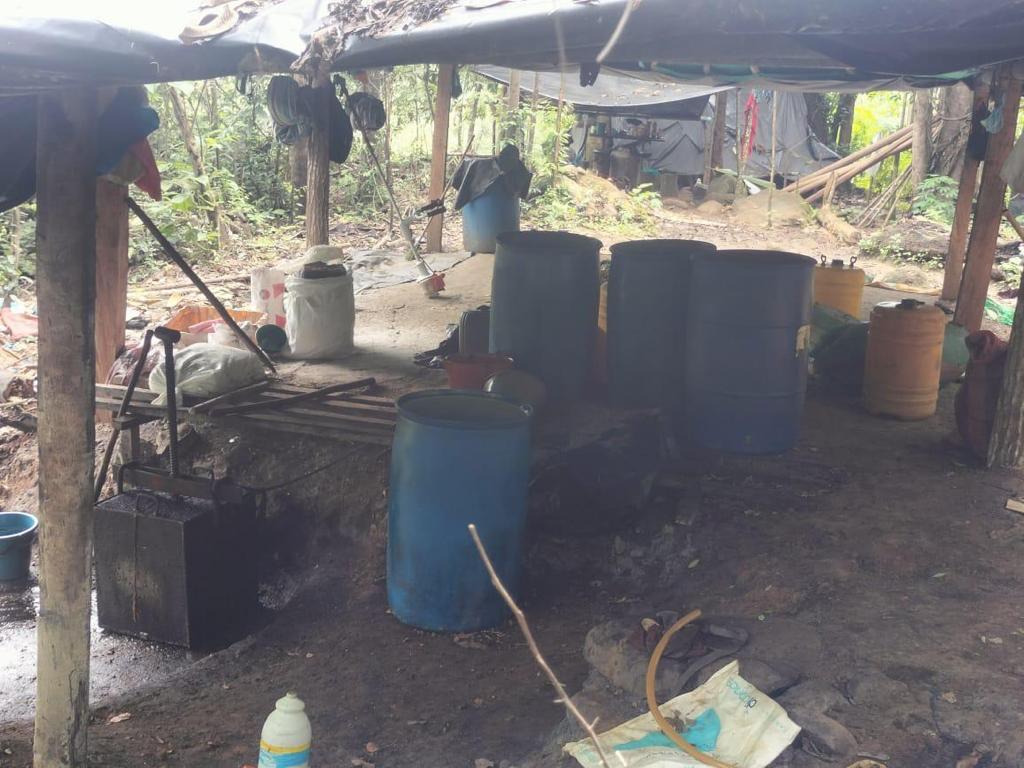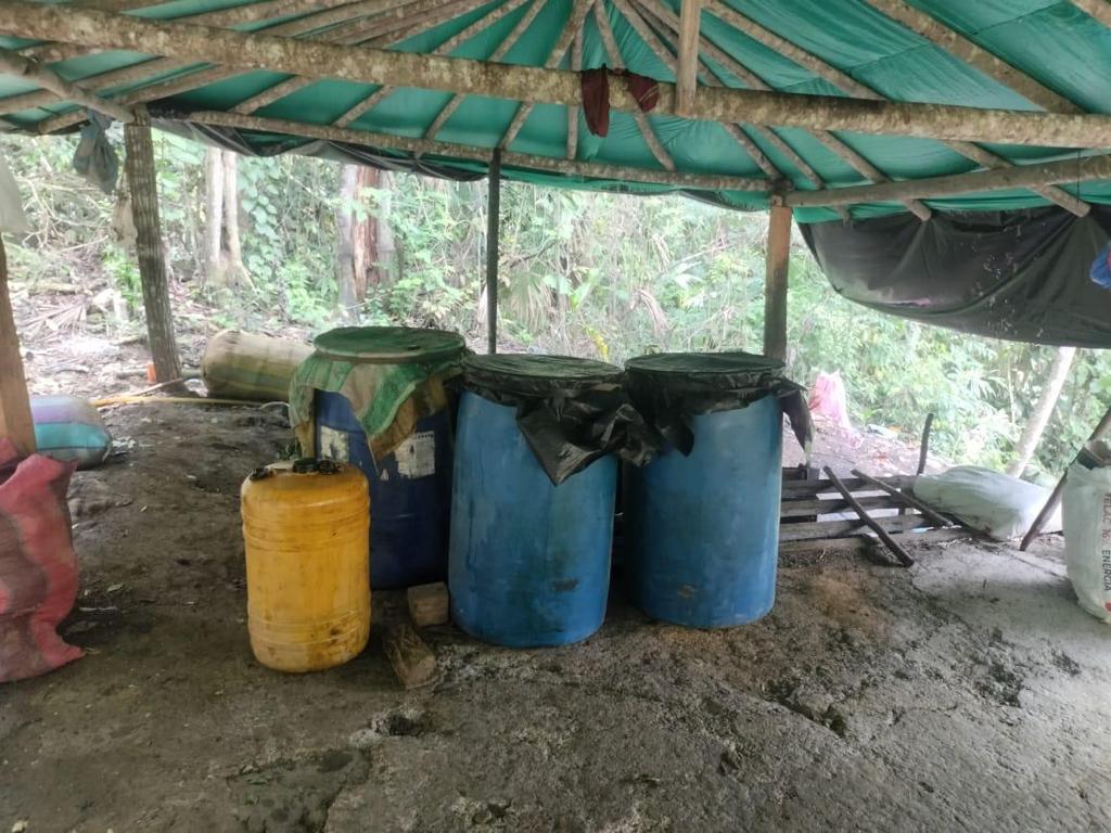 En estas estructuras fueron encontradas 6 canecas plásticas de 55 galones, 7 canecas plásticas de 10 galones, además de 110 galones de ACPM, 165 galones de hoja de coca en proceso, 110 galones de gasolina con hoja de coca picada y 20 galones de amoniaco. Así mismo, 304 kilos de hoja de coca raspada, 30 kilos de hoja de coca prensada, 20 kilos de cal, 100 kilos cemento, 25 kilos urea, 1 guadaña y 3 prensas.