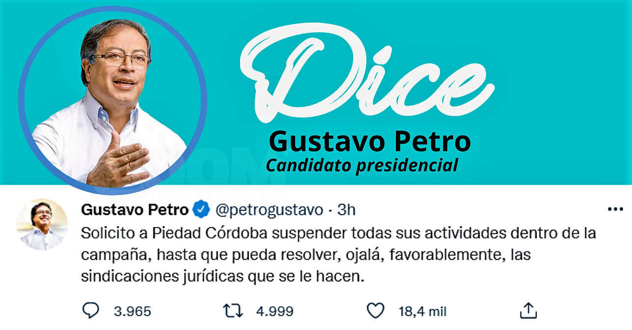 Nacional. ¿Usted qué opina? Petro solicitó a la electa senadora, Piedad Córdoba, suspender actividades de campaña. "Solicito a Piedad Córdoba suspender todas sus actividades dentro de la campaña, hasta que pueda resolver, ojalá, favorablemente, las sindicaciones jurídicas que se le hacen".