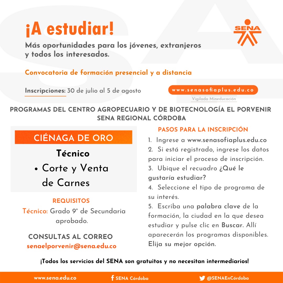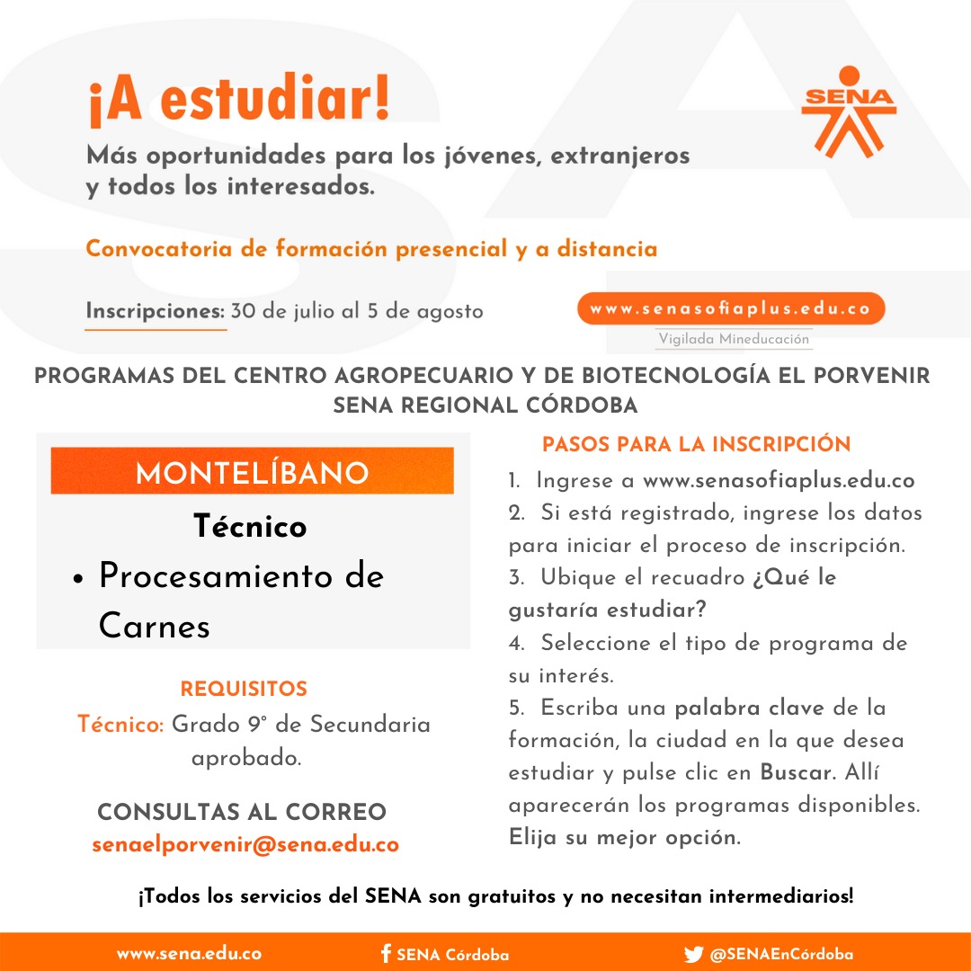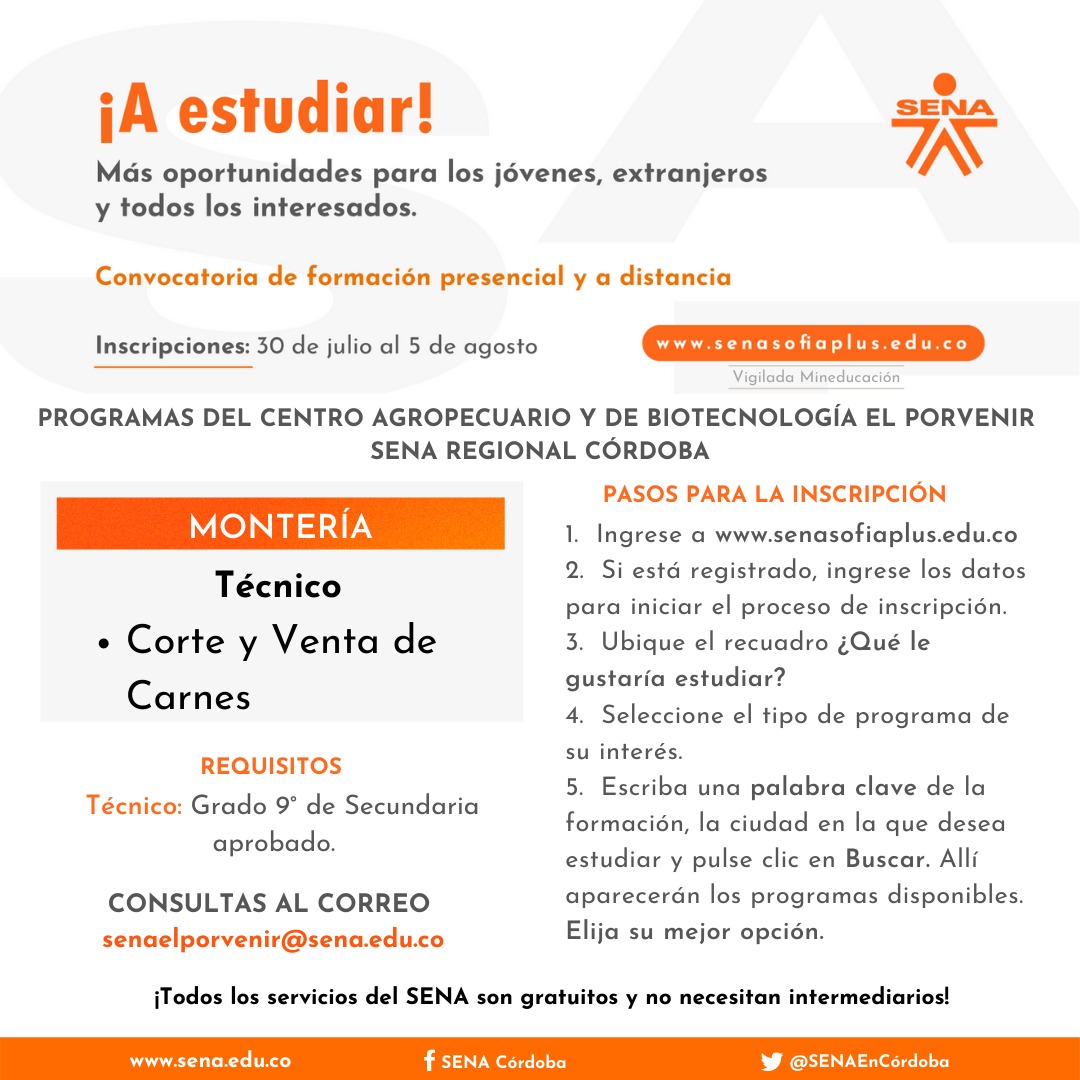 Córdoba. El SENA anuncia una nueva convocatoria de formación titulada presencial y a distancia en la que pueden inscribirse todos los colombianos y extranjeros con permiso para estudiar en Colombia, en especial esos jóvenes que quieren construir su proyecto de vida formándose en competencias pertinentes.