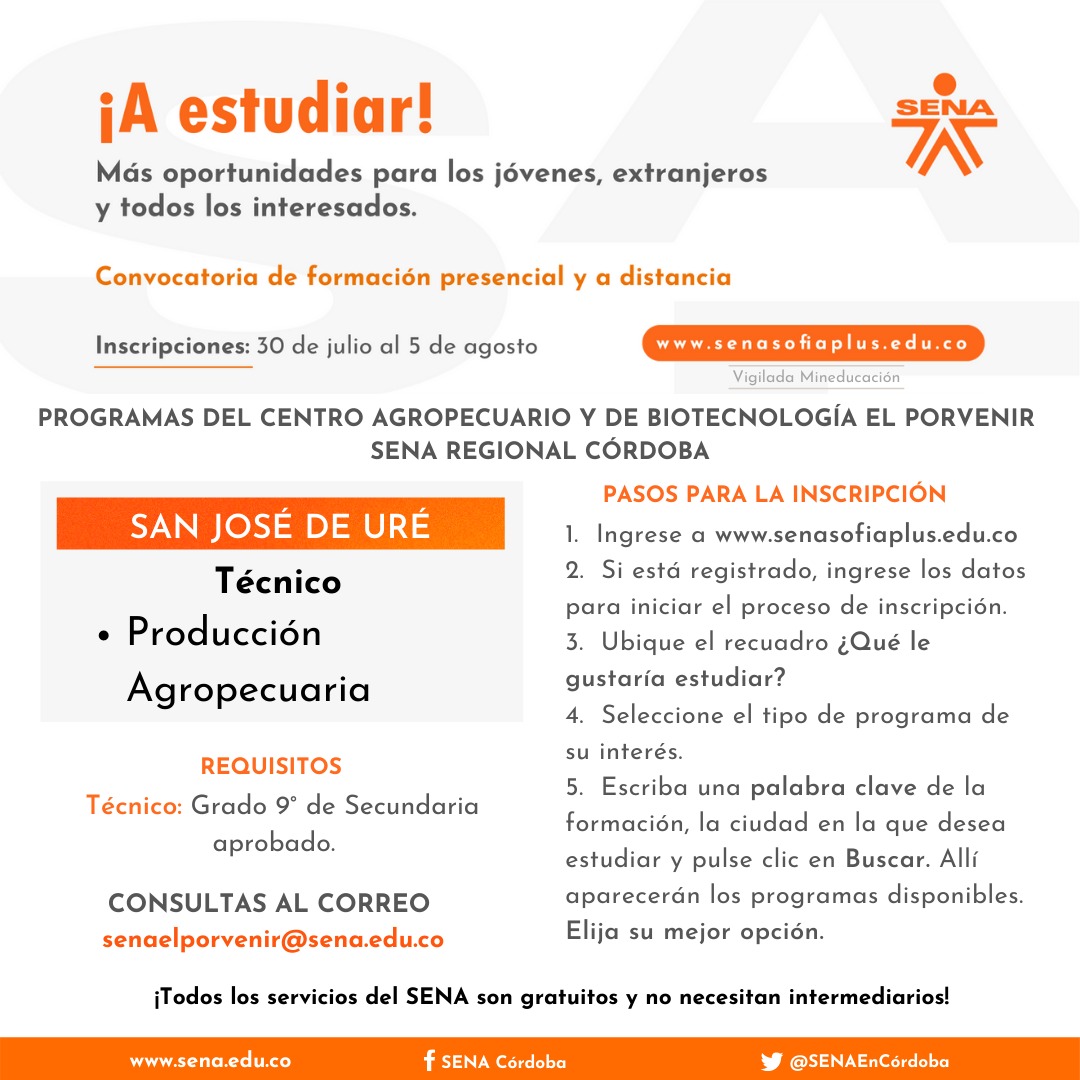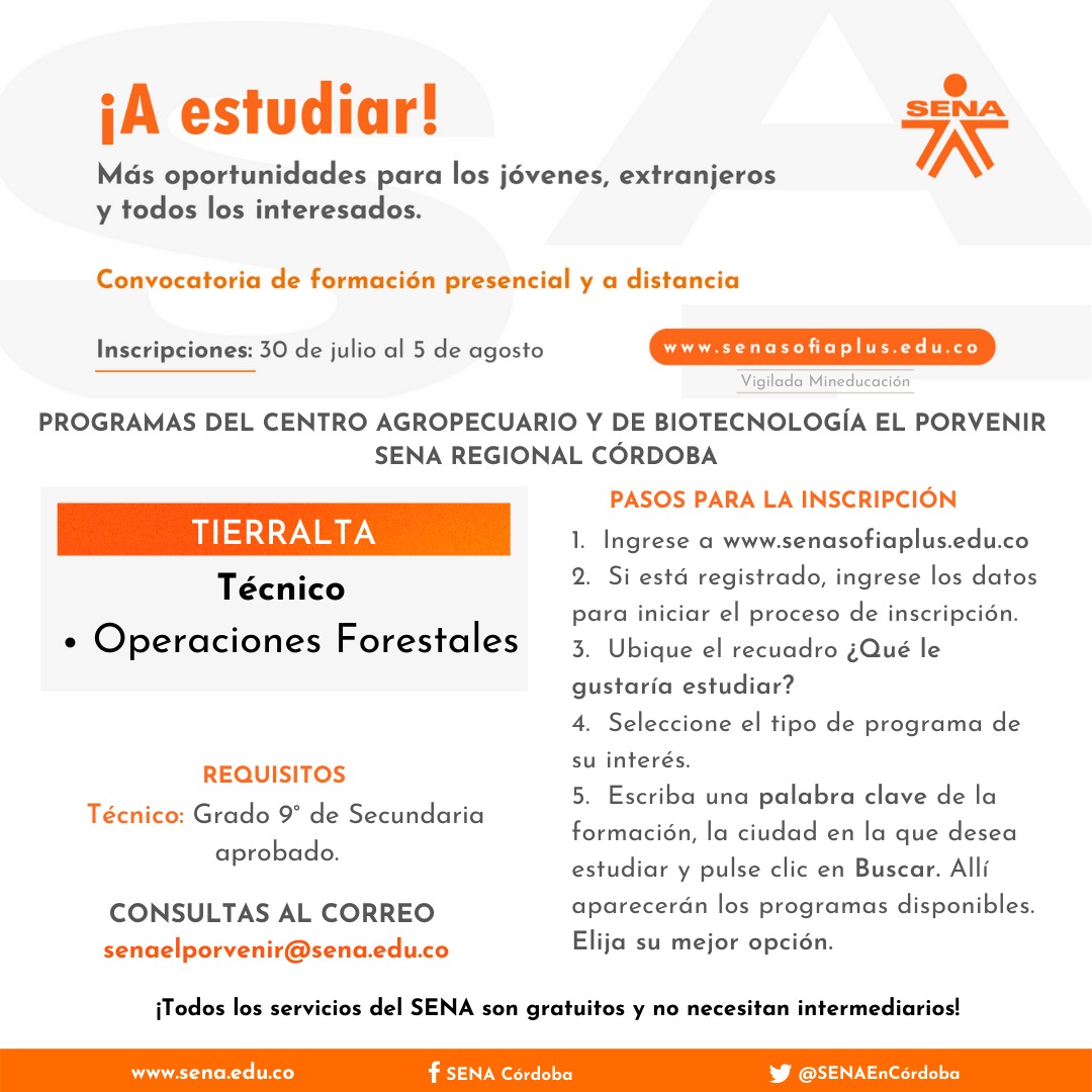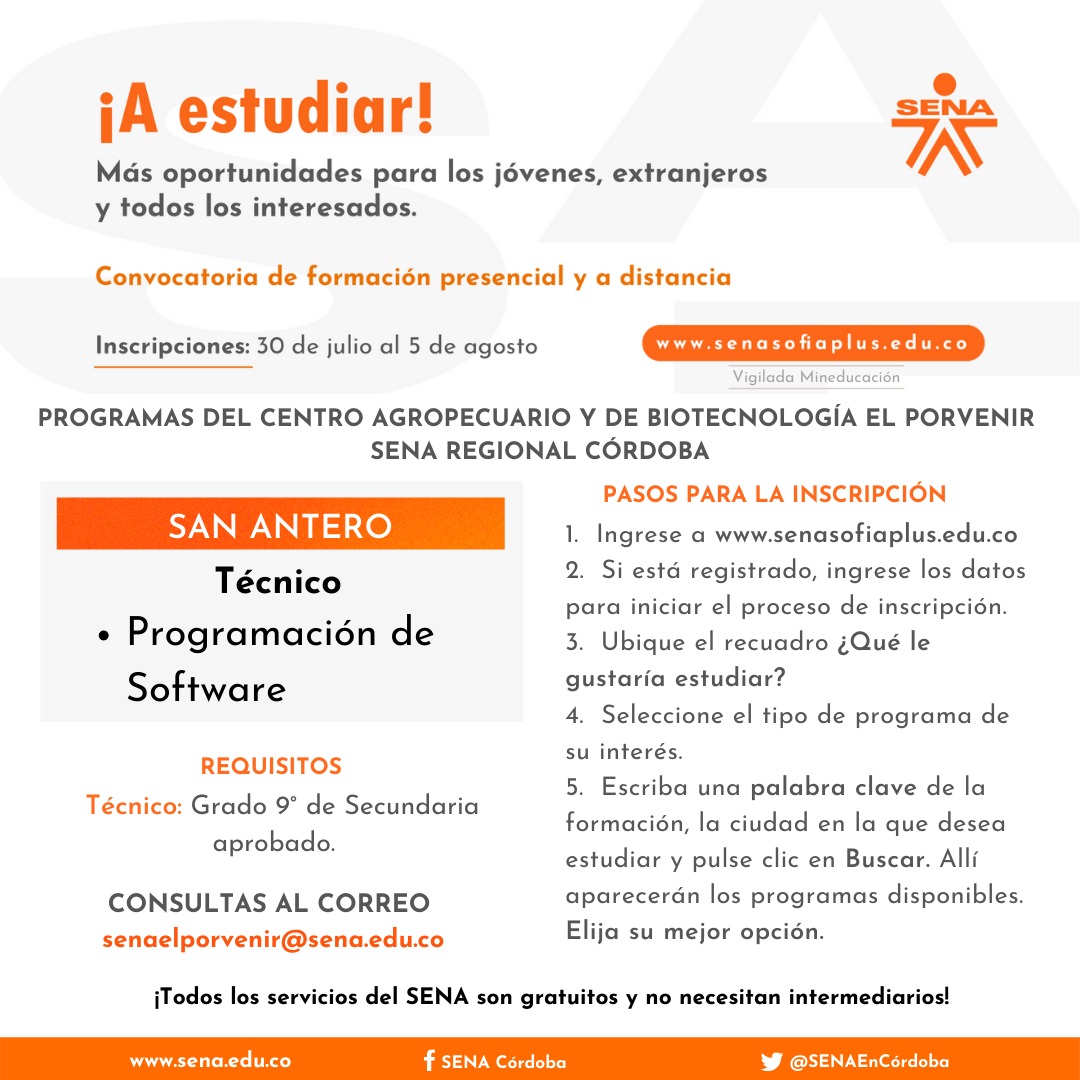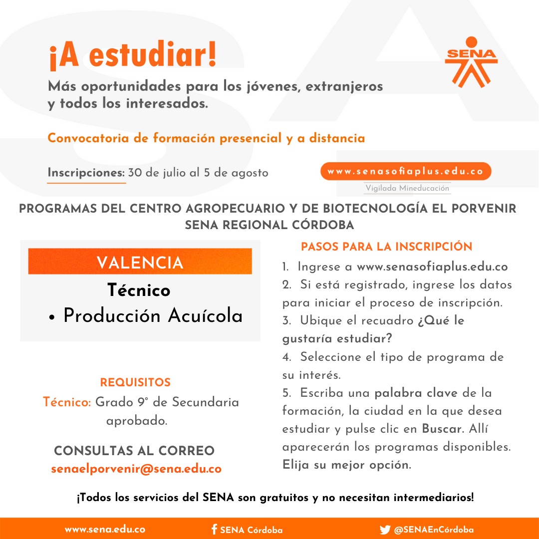 Córdoba. El SENA anuncia una nueva convocatoria de formación titulada presencial y a distancia en la que pueden inscribirse todos los colombianos y extranjeros con permiso para estudiar en Colombia, en especial esos jóvenes que quieren construir su proyecto de vida formándose en competencias pertinentes.