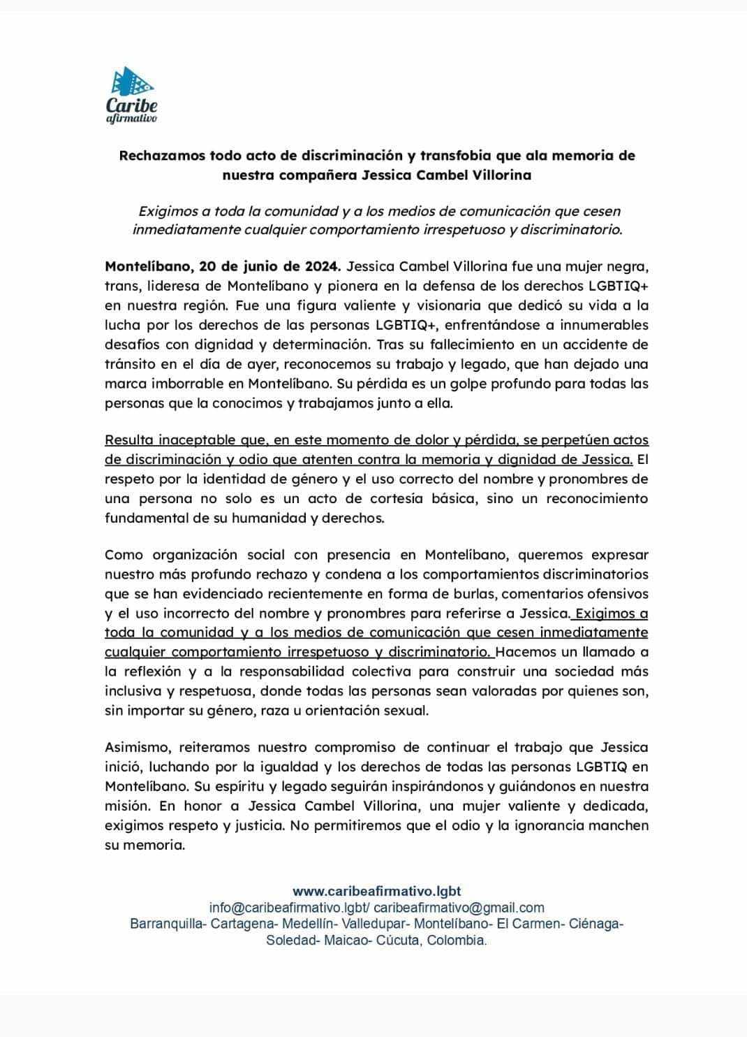 “Jessica Cambel Villorina fue una mujer negra, trans, lideresa de Montelíbano y pionera en la defensa de los derechos LGBTIQ+ en nuestra región. Fue una figura valiente y visionaria que dedicó su vida a la lucha por los derechos de las personas LGBTIQ+, enfrentándose a innumerables desafíos con dignidad y determinación”, apartes del comunicado de Caribe afirmativo.