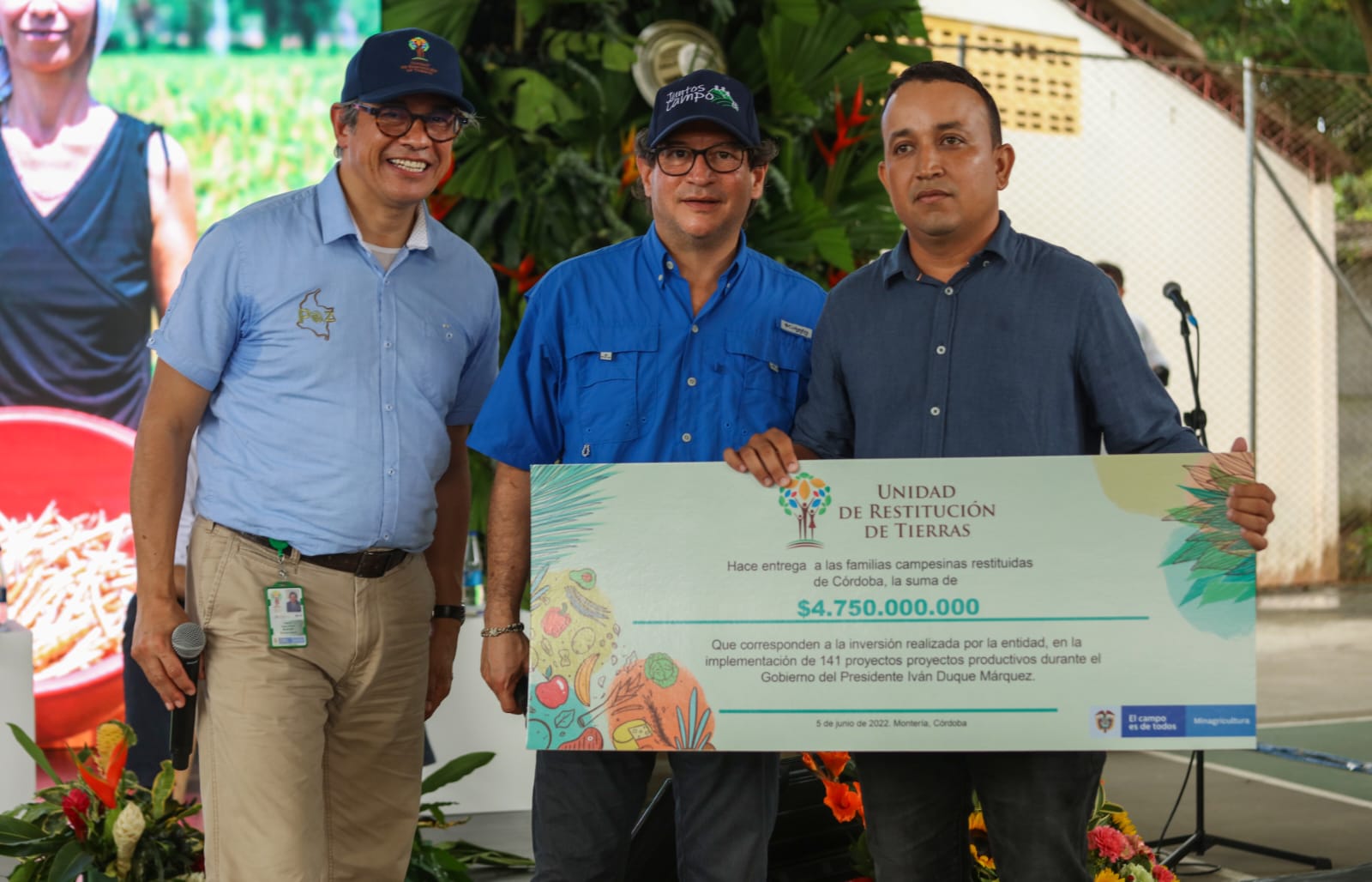 Por ello, en el Encuentro Nacional Agropecuario y Conmemoración del Día de la Población Campesina, organizado por el Ministerio de Agricultura y Desarrollo Rural y sus instituciones adscritas, se dio a conocer, a través de la entrega de un cheque simbólico a representantes de las familias restituidas de Córdoba, entre quienes la administración del Gobierno del Presidente Iván Duque, desde la Unidad de Restitución de Tierras, ha invertido $4.750 millones enfocados en la puesta en marcha y asesoría técnica de proyectos productivos que han beneficiado a más de 141 campesinos víctimas de la violencia de este departamento.
