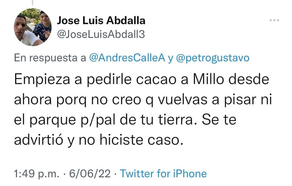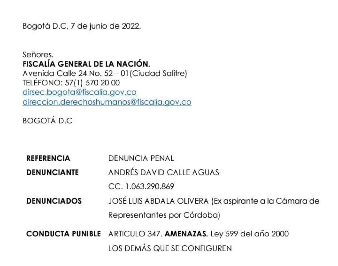 "DENUNCIO PÚBLICAMENTE AL EX ASPIRANTE A LA CÁMARA JOCHE ABDALA POR AMENAZARME DE MUERTE", así tituló el Representante Andrés David Calle Aguas lo que según él, es una amenaza de muerte, por ser el único Representante en Córdoba que apoya al candidato a la presidencia, Gustavo Petro "Jose Luis Abdala, es un político Conservador, ex aspirante a la Gobernación y a la Cámara de Representantes, quien en la red social Twitter posteó una amenaza de muerte directa contra mi persona. Este hecho no es menor teniendo en cuenta las influencias políticas y económicas con las que cuenta este señor y quien podría ordenar un atentado contra mi vida. Tal como lo advierte en su mensaje, el motivo no es otro que ser el único congresista de Córdoba que apoya la candidatura de Gustavo Petro".