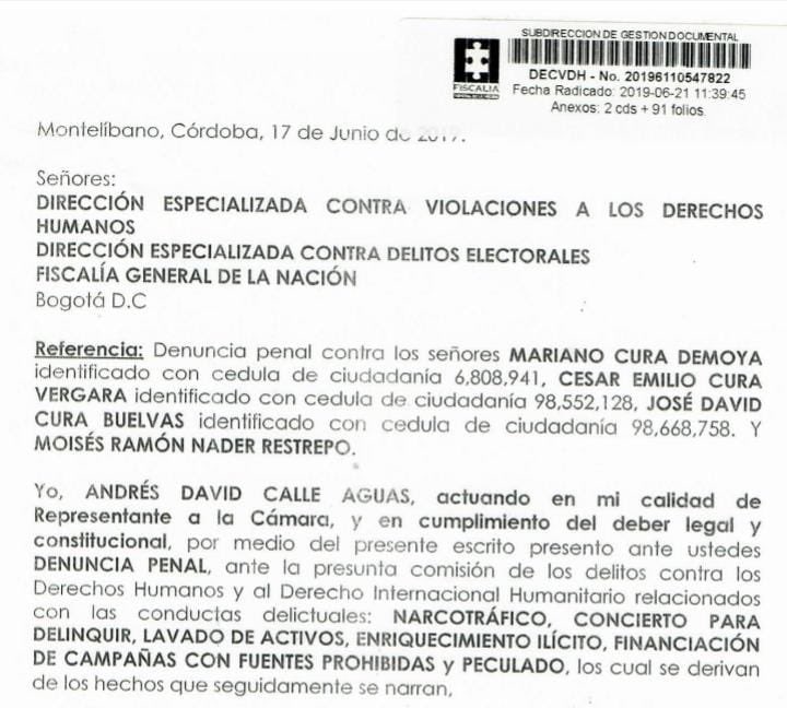 Andrés Calle Aguas, afirma que, acudirá a la Fiscalía, para denunciar las amenazas en contra de su vida. "Al término de este escrito, acudiré a la Fiscalía General de la Nación a denunciar estos hechos".
