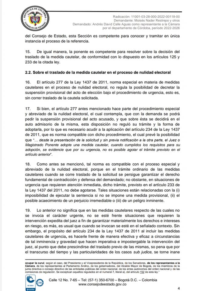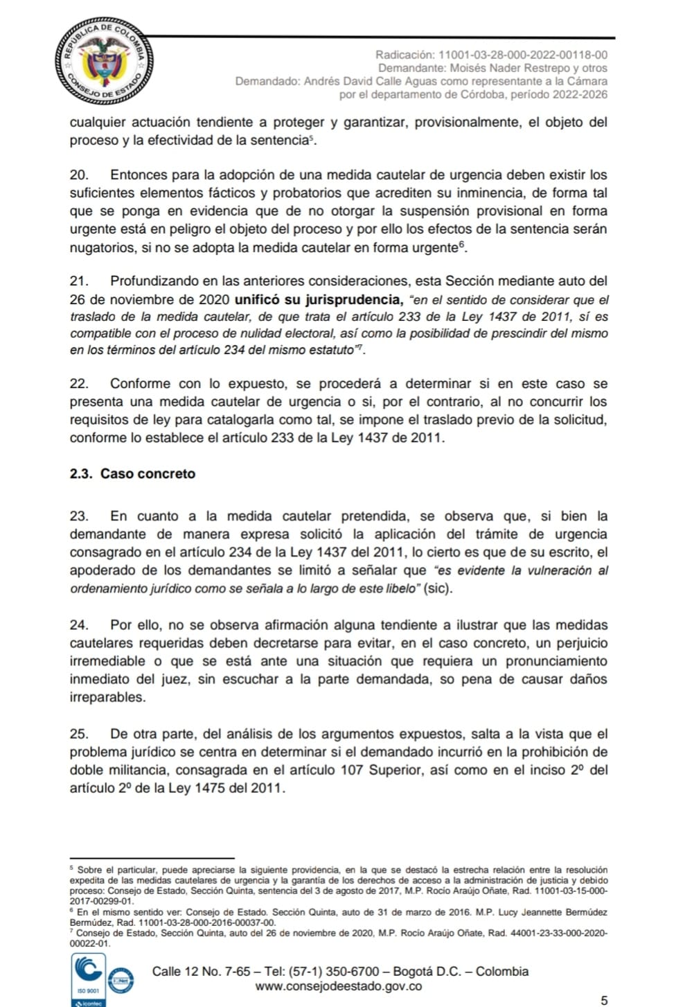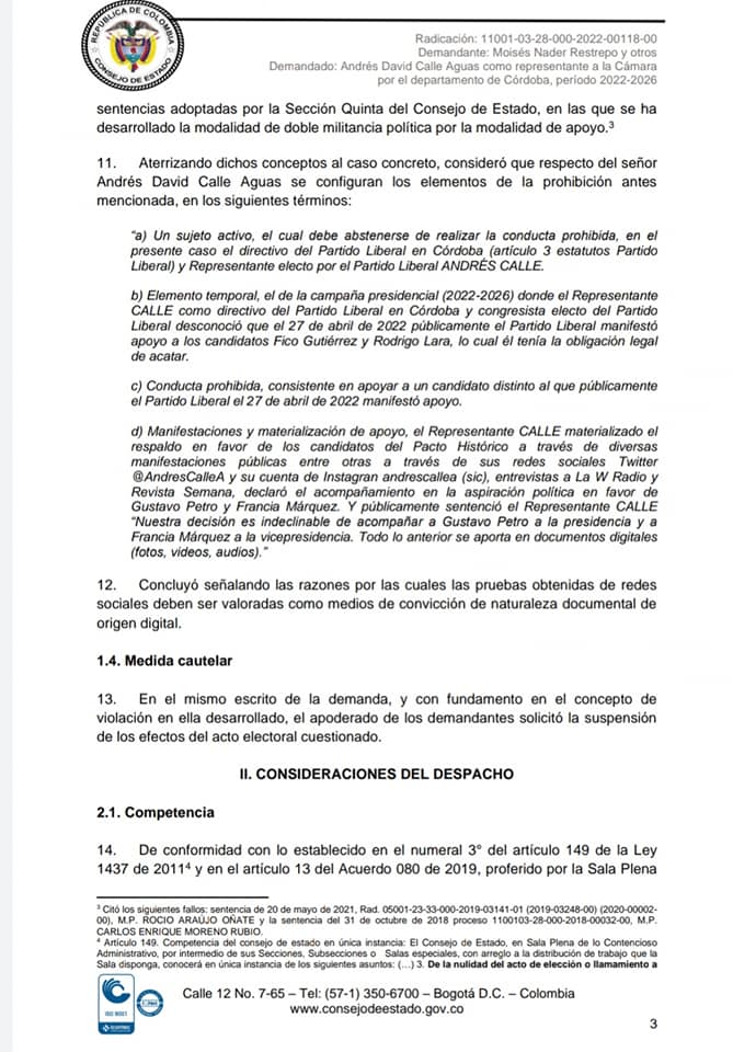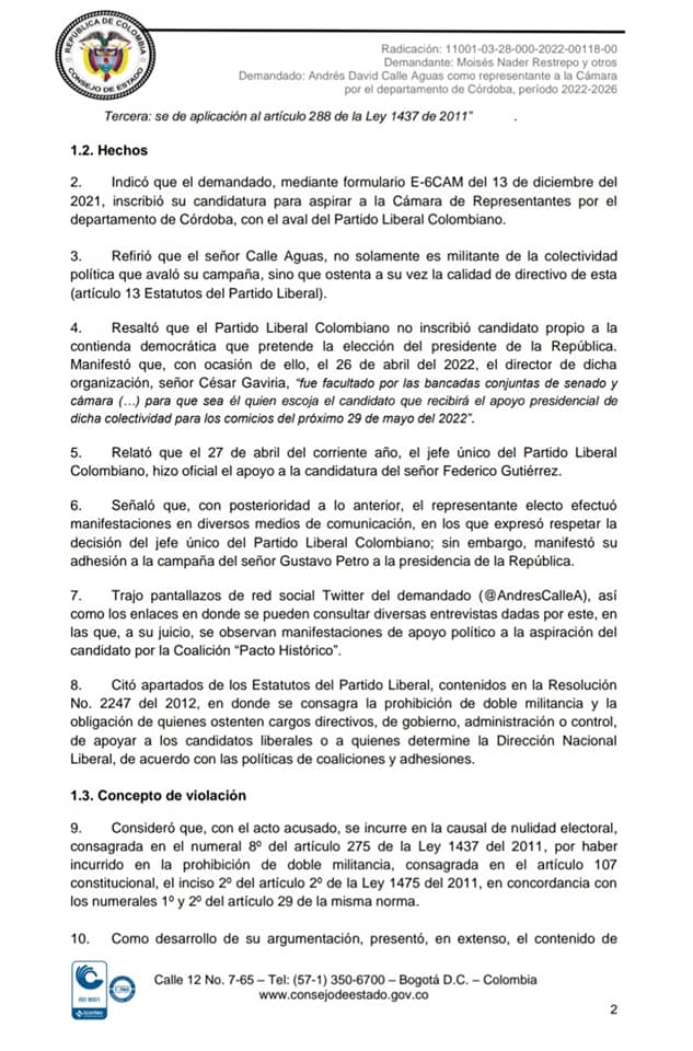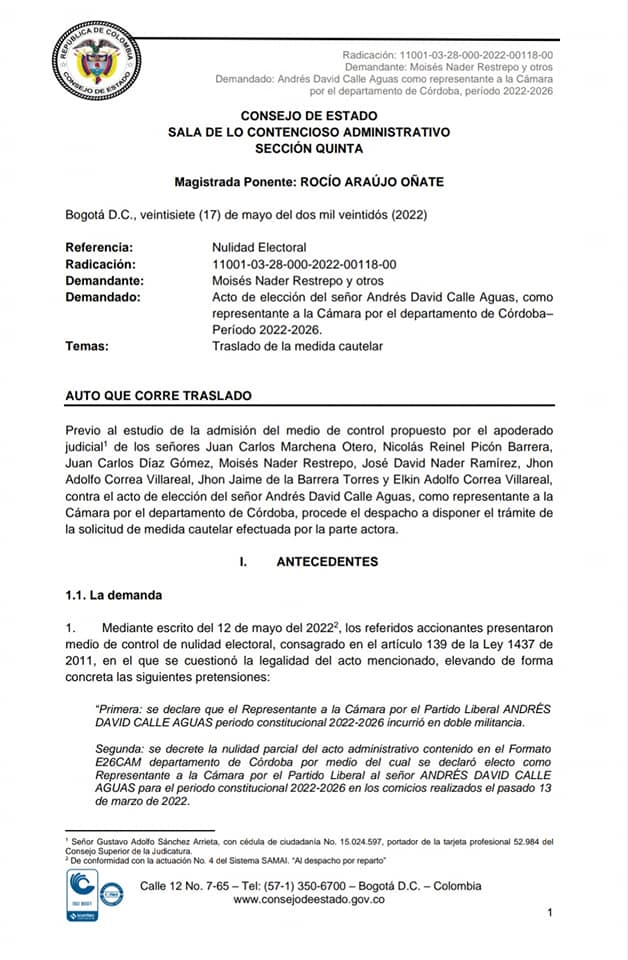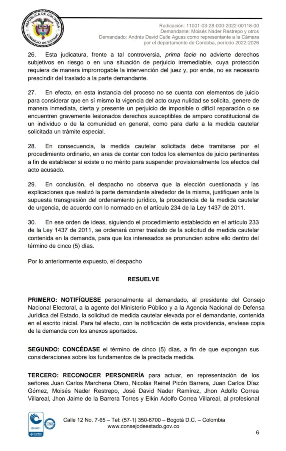 Esta sería la respuesta del Consejo de Estado a la denuncia por presunta doble militancia, interpuesta contra el Representante Calle Aguas, por supuesto estaremos contactando a las demás partes para conocer la información por parte de los denunciantes.